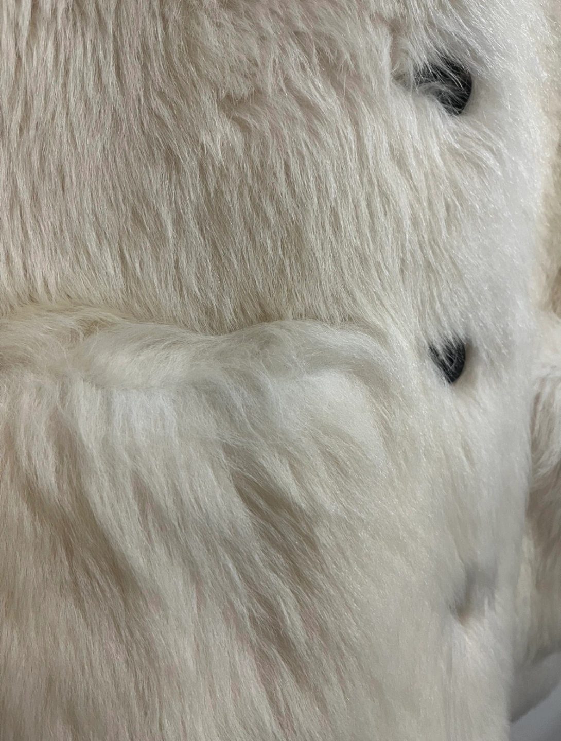 Beige sheepskin coat with black buttons. The sheepskin coat is thick and warm.