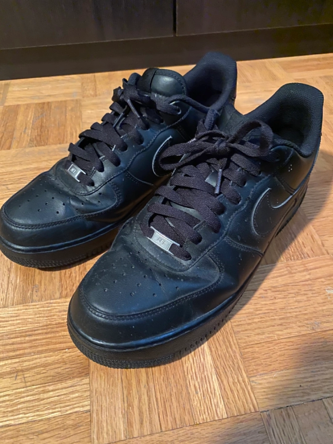 Classic all-black leather Nike Air Force 1 '07 sneakers. Men's sizing. Great for everyday wear.