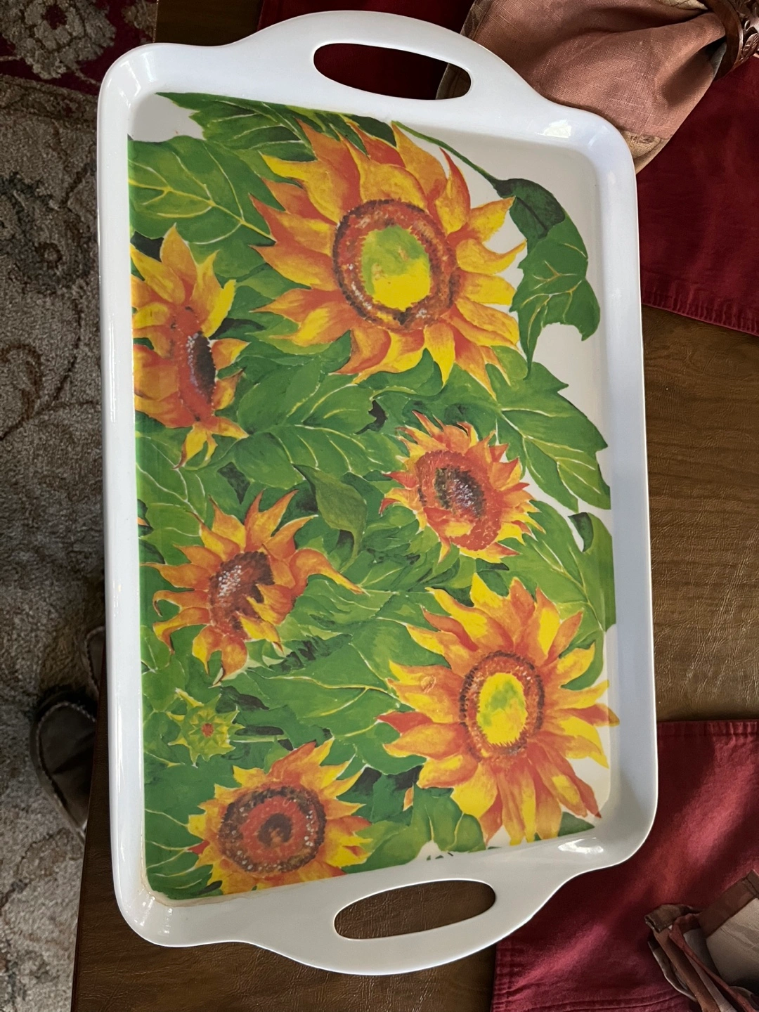 Rectangular serving tray. White plastic with sunflower design. Two handles.