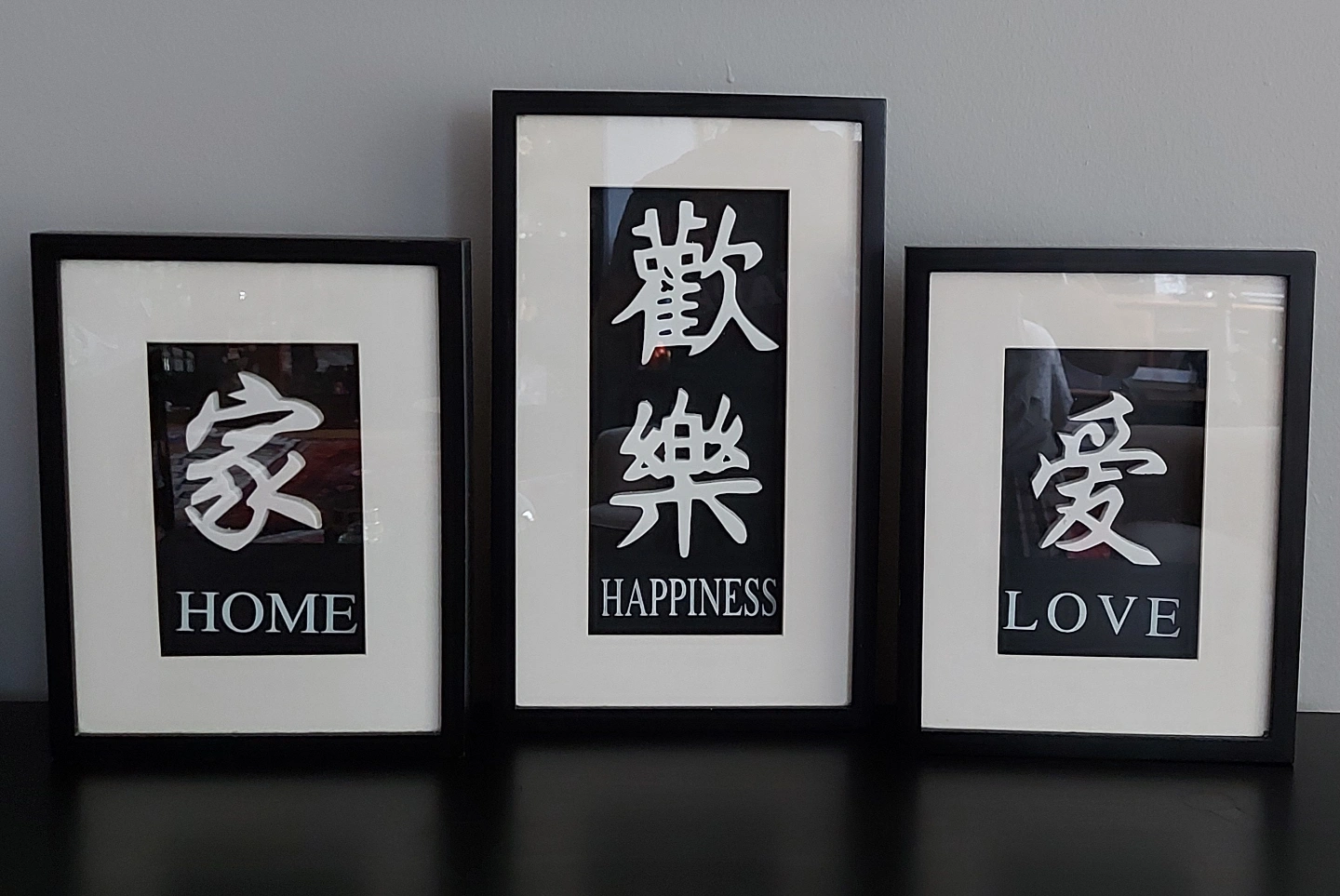 1000+Set of 3 handcrafted wall decore featuring Chinese characters and tge English equivalent. The larger one measures 19.5*33cm and the 2 smaller ones are 19.5*25cm. Sold as a set Pick up only Pet free and smoke free household Yonge and Eglinton area Only cash payment