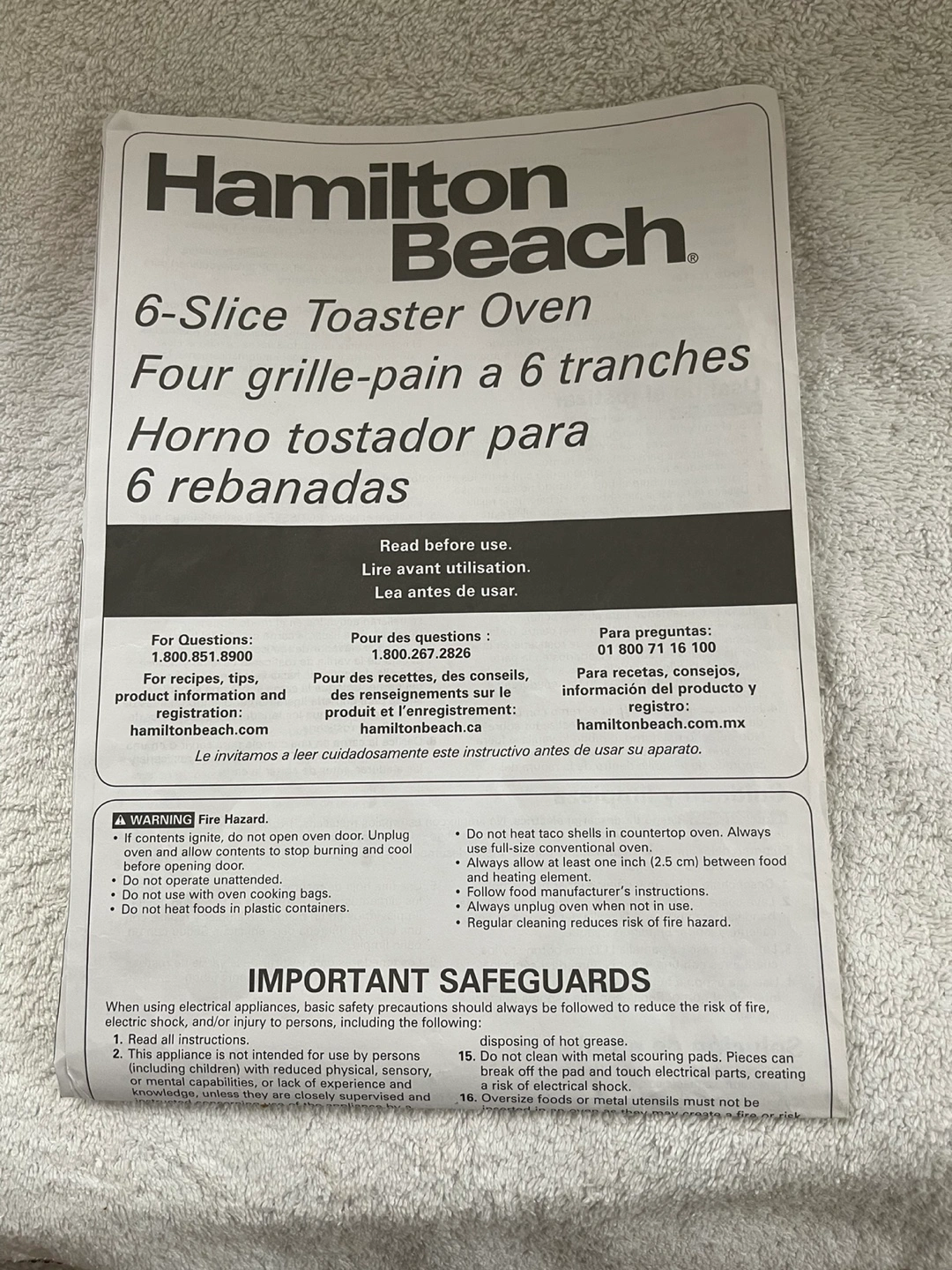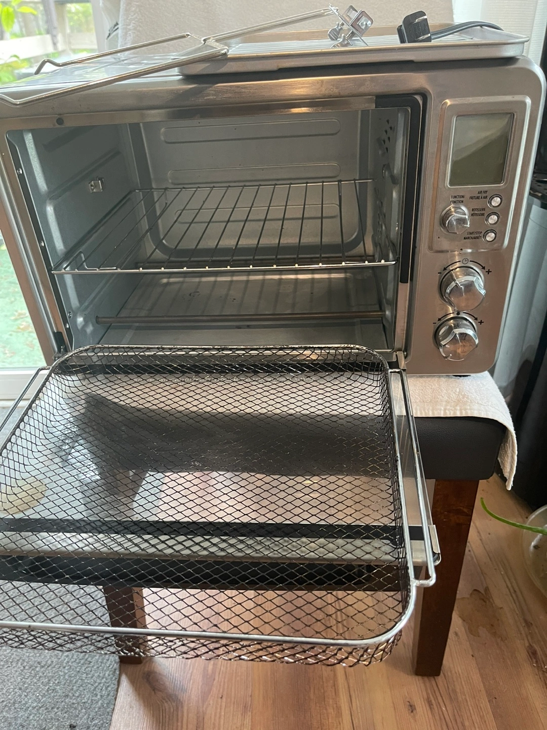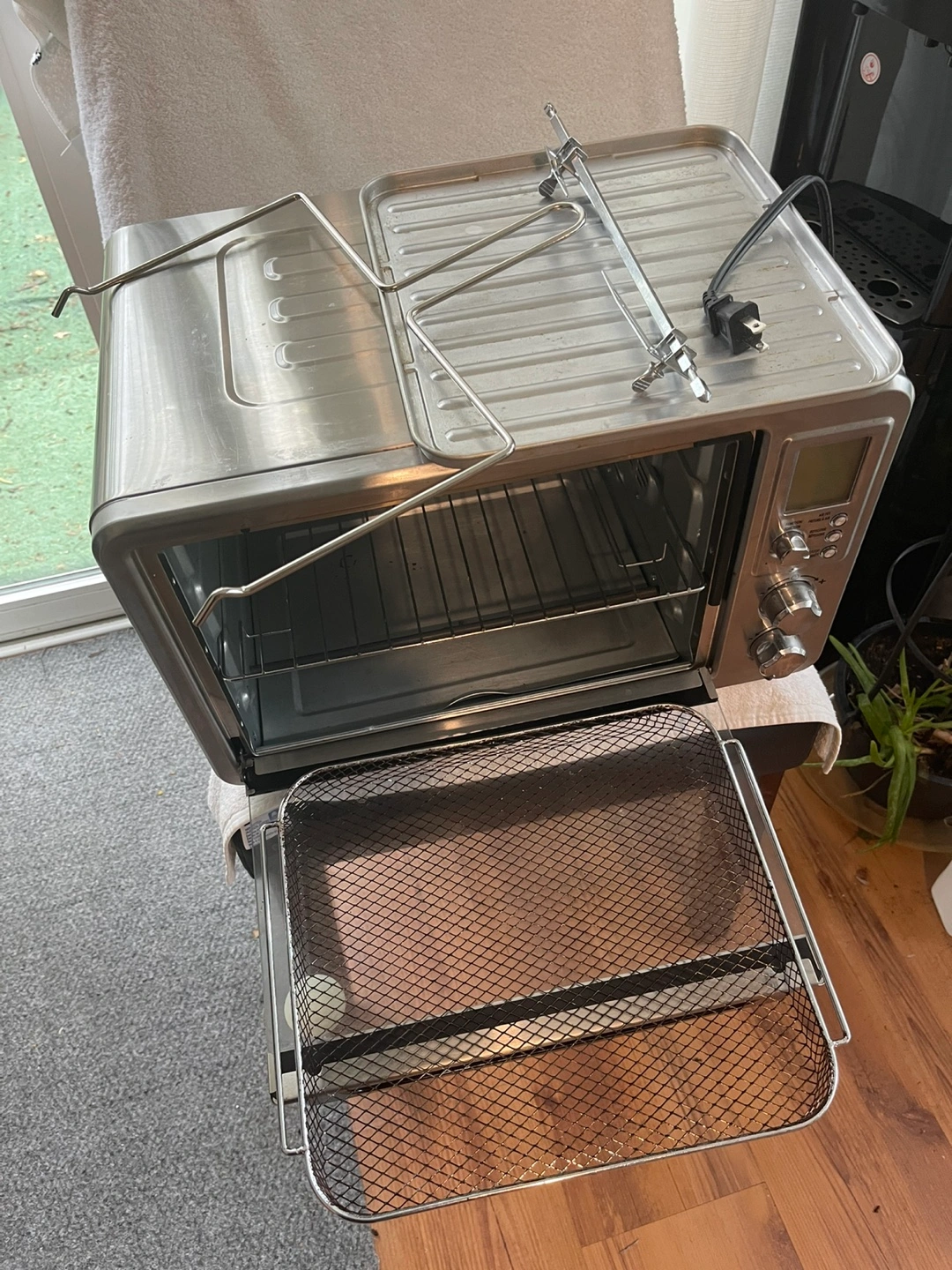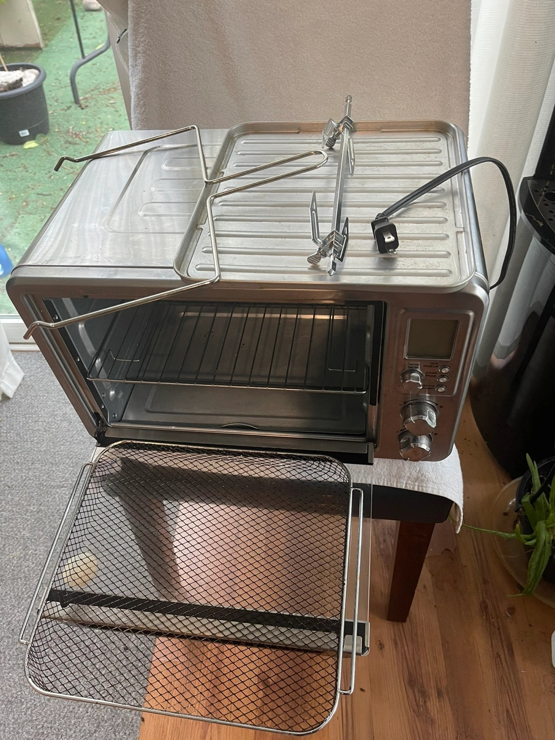 294Stainless steel toaster oven. Includes air fryer basket and rotisserie. Good condition, minimal use. Digital controls. Six slice capacity, only fryer fan recently stopped not working.