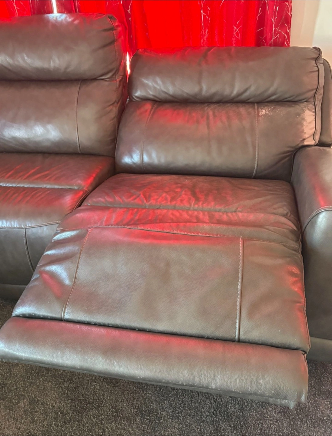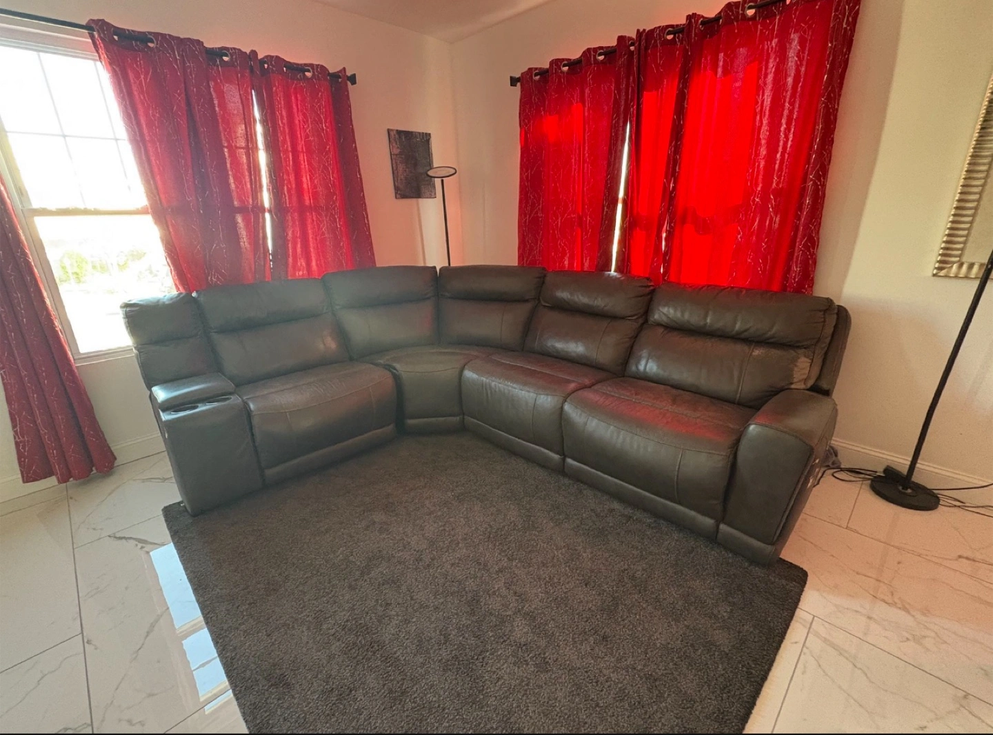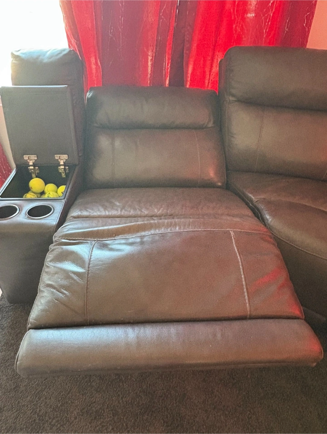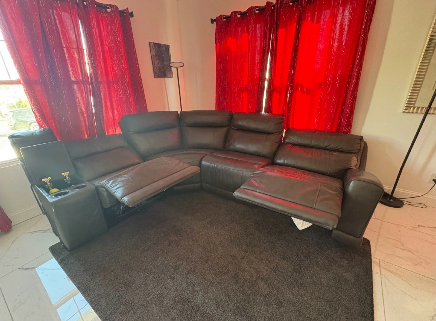 Large brown leather sectional. Multiple reclining seats. Includes cupholders and power outlets. Great for a large family room.