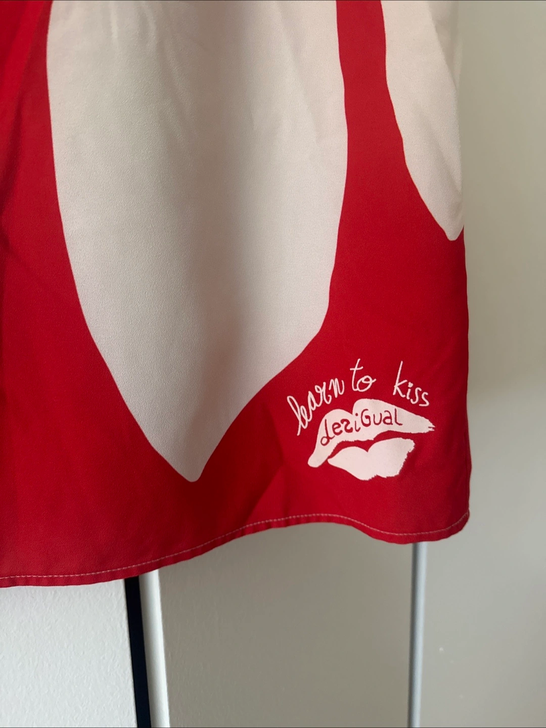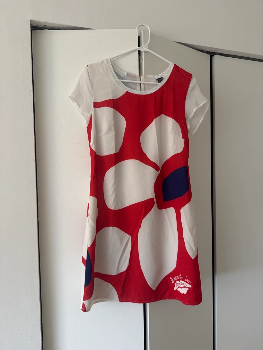 126Short sleeve mini dress. Red and white abstract print. Gold zipper closure at the back. Learn to Kiss design detail.