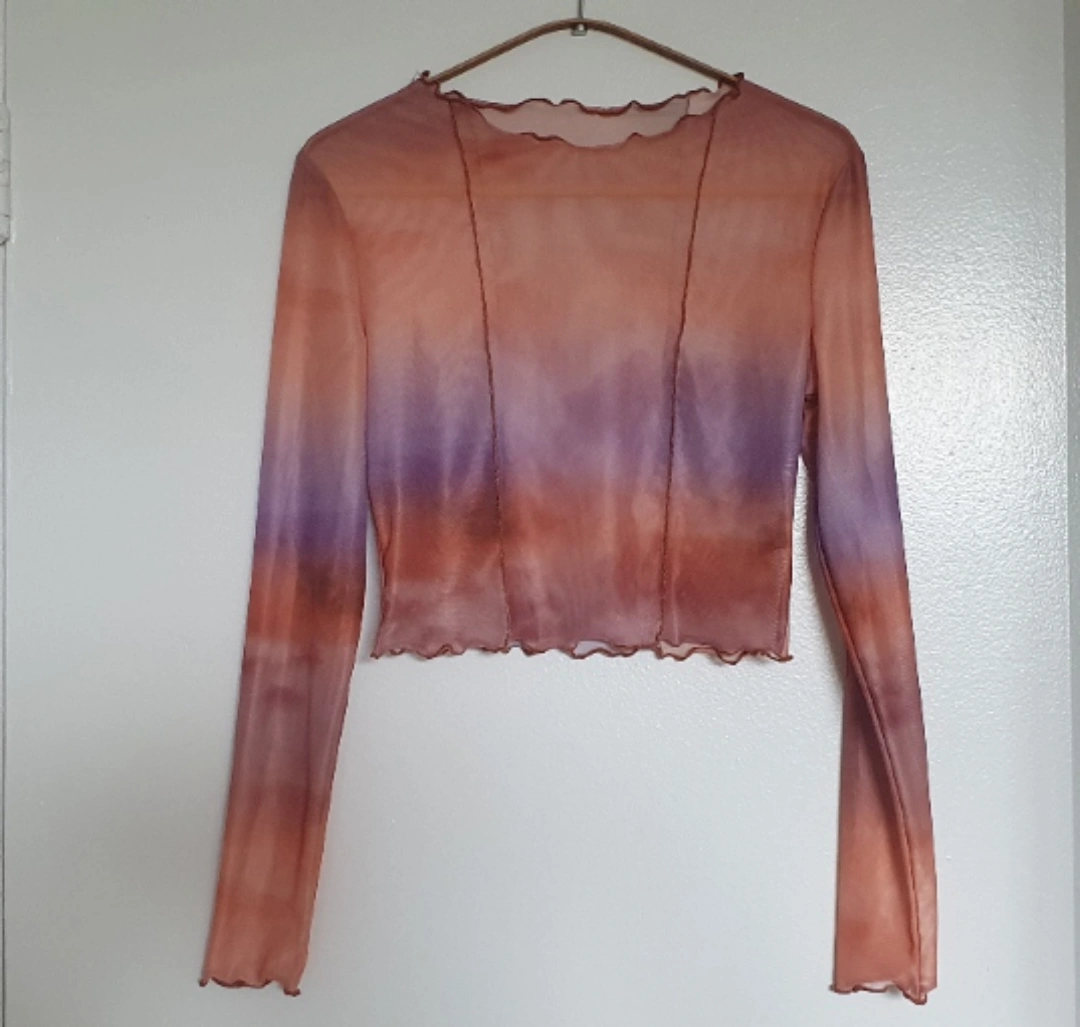 Long sleeve crop top made from semi-transparent, stretchy and soft material. Cloudy pattern in burnt orange and light purple colors. Not scratchy, would be a good going out or festival top. Pit to pit length is 40 cm, shoulder to hem is 38 cm. Never worn out but has a small hole on the back where I removed the tag.