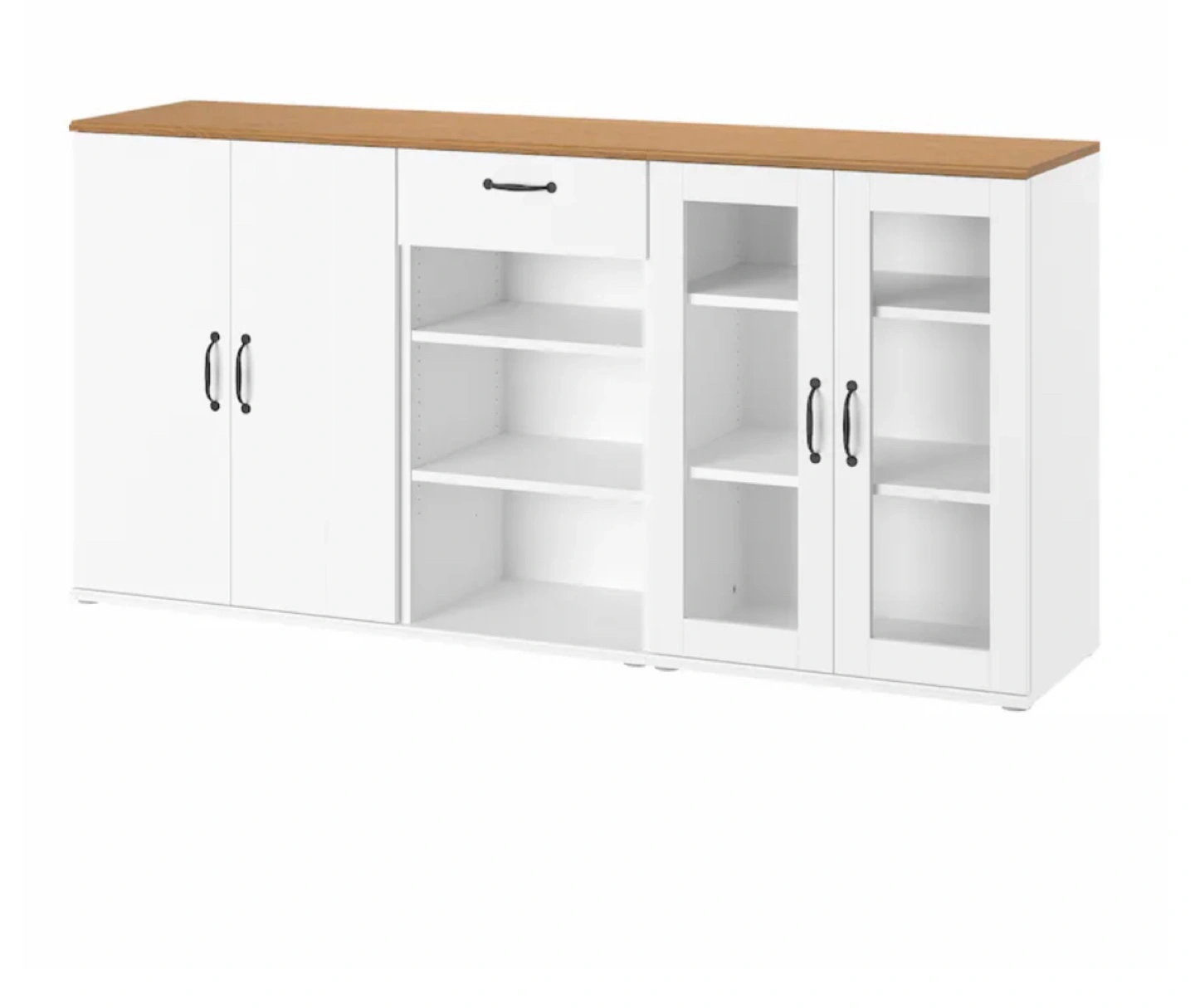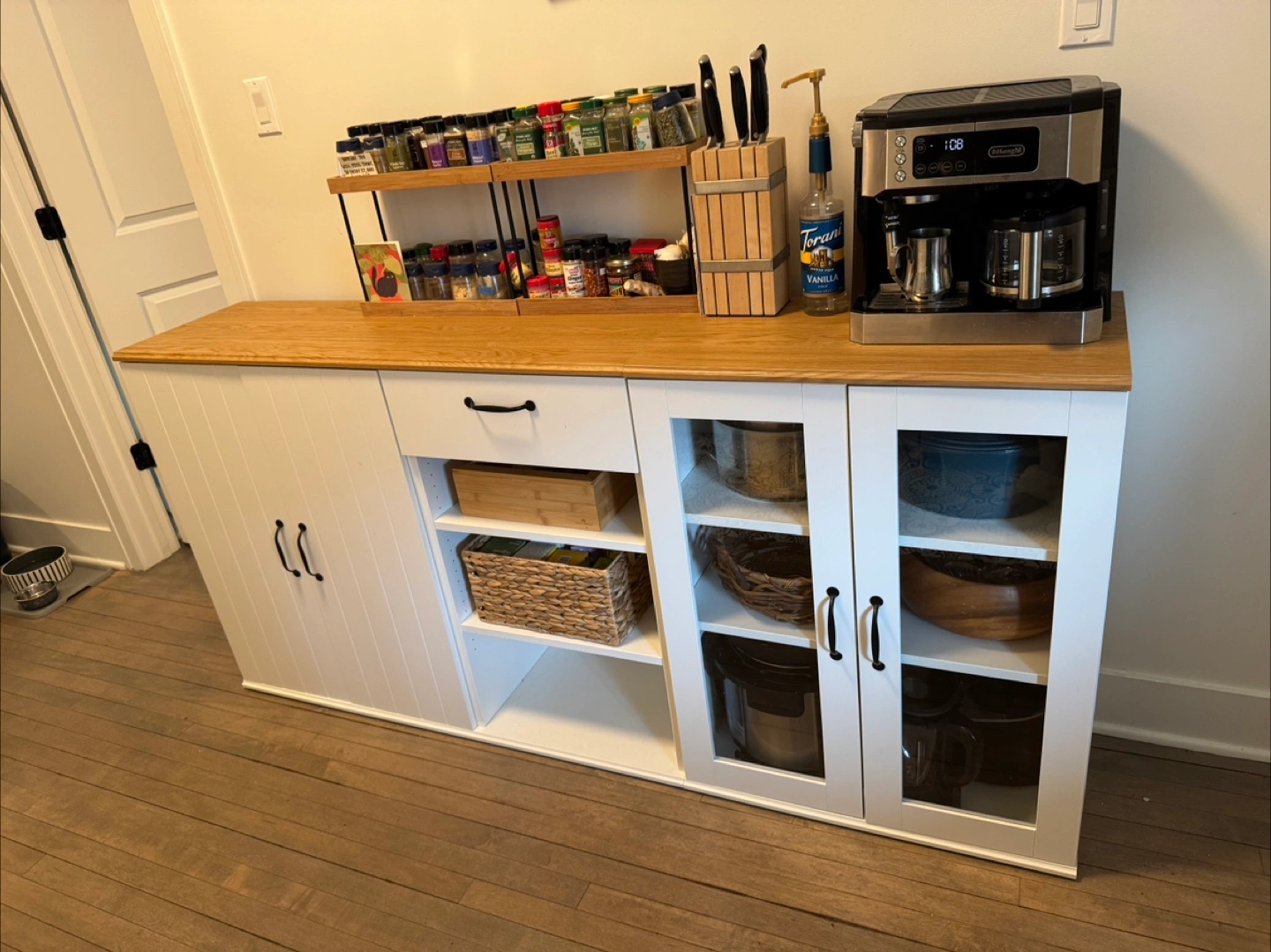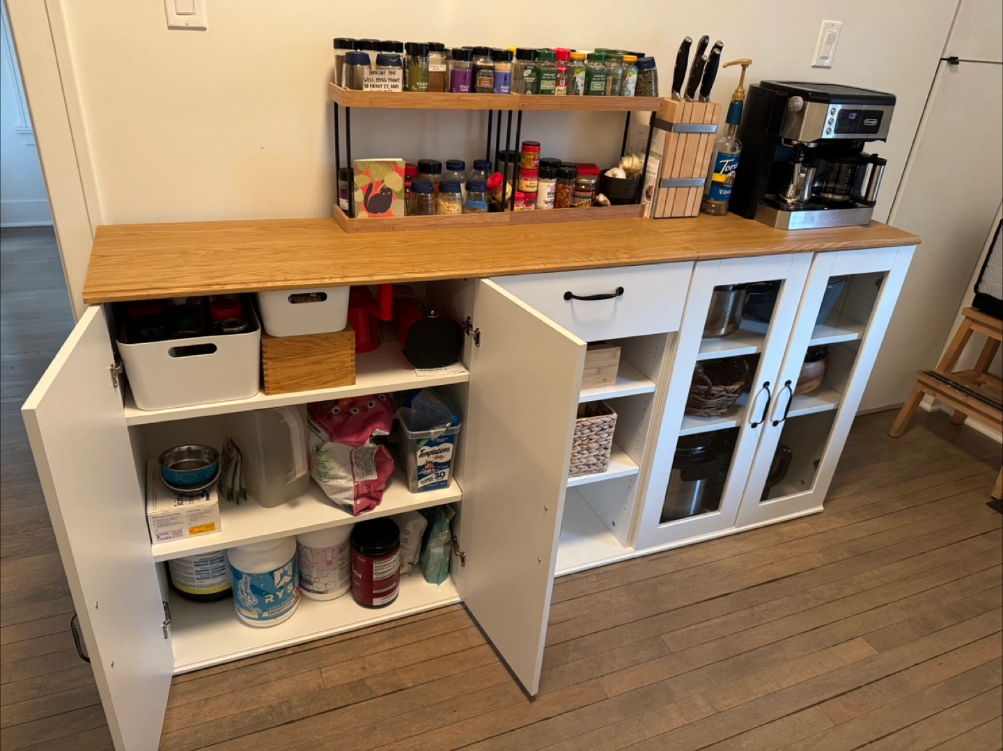Large white kitchen cabinet with wood top. Plenty of storage. Glass doors. Drawers and shelves. Perfect for pantry, dishes, or coffee bar. 2 pieces so modular. Less than 6 months old.