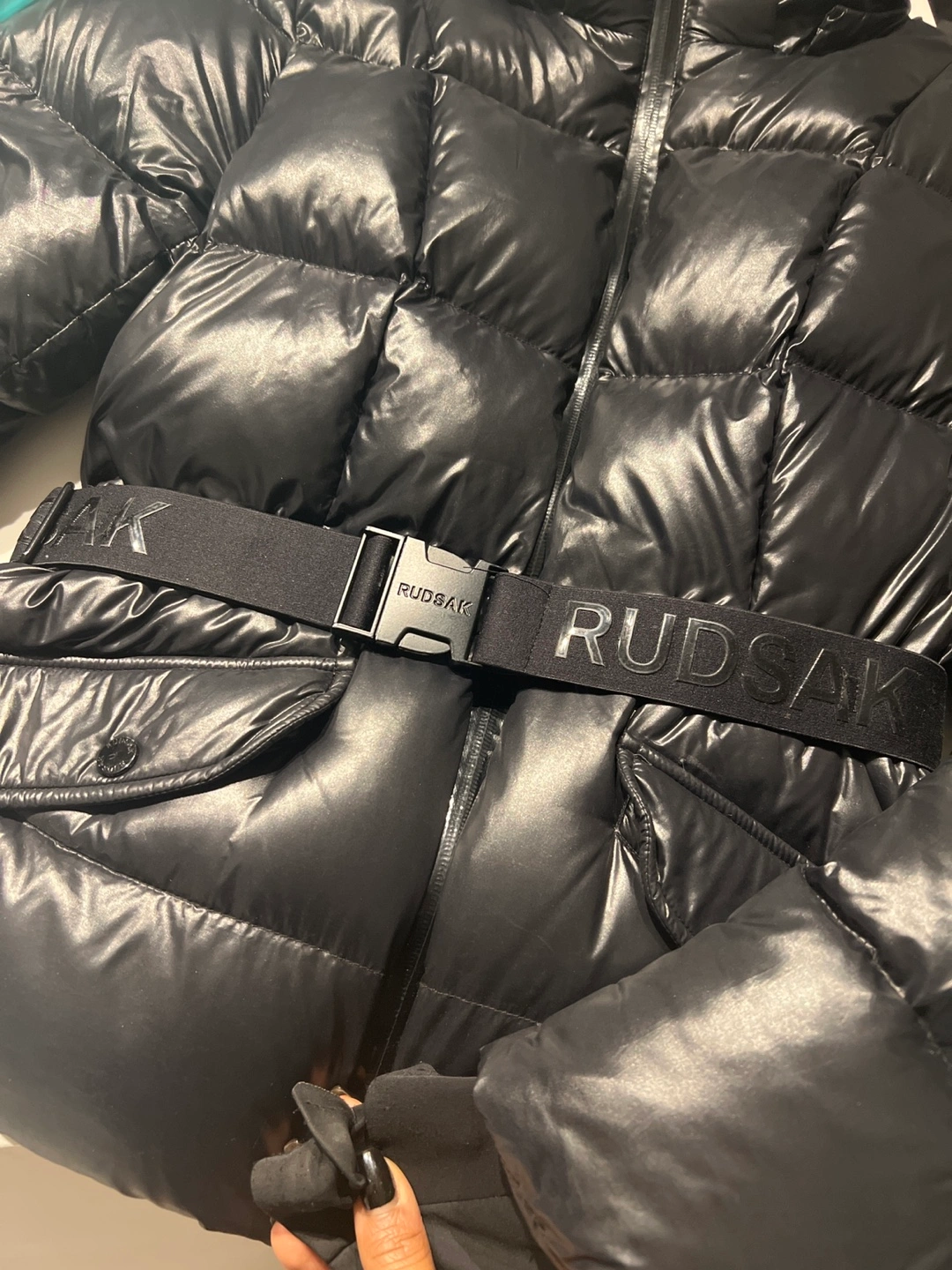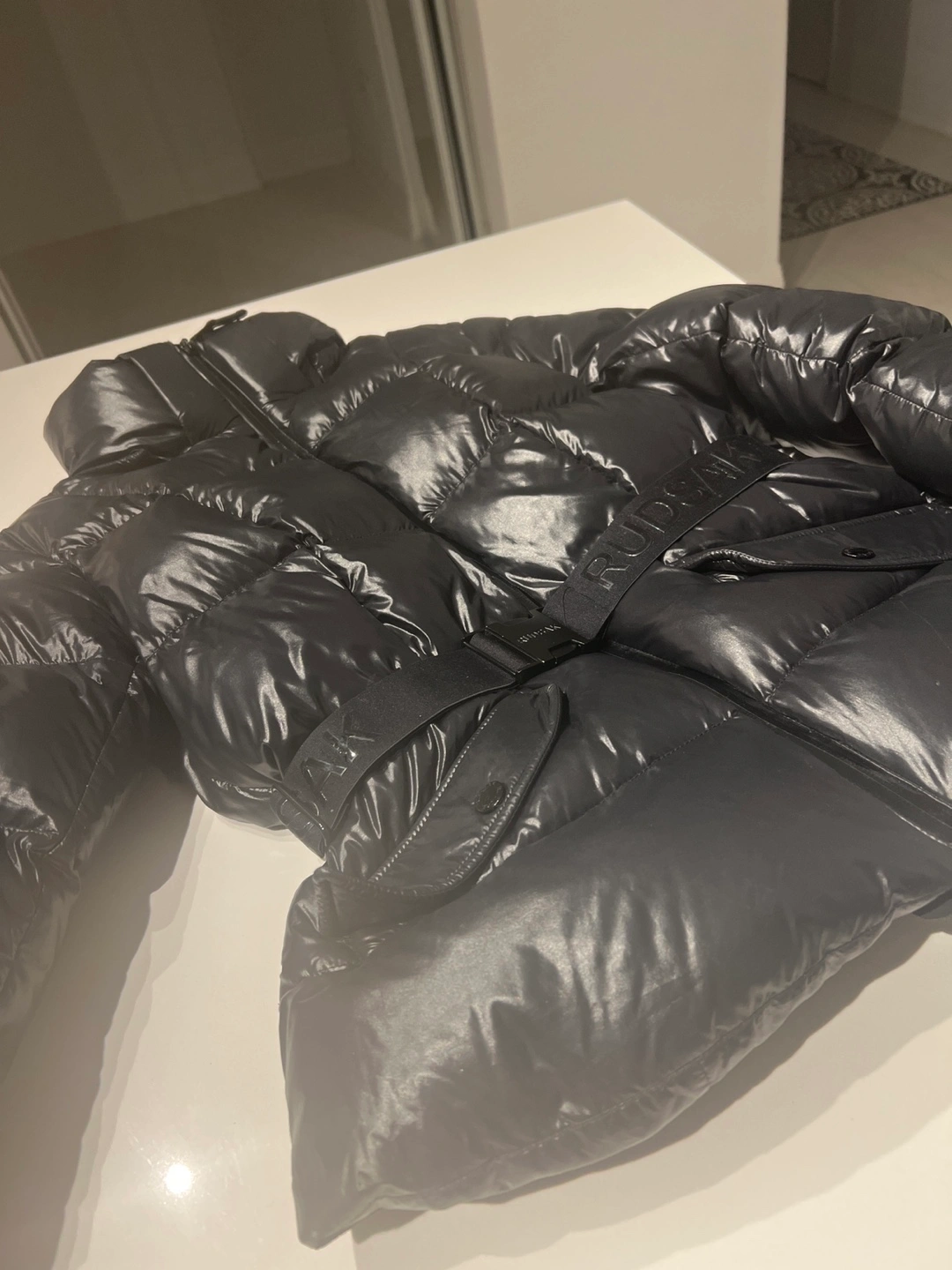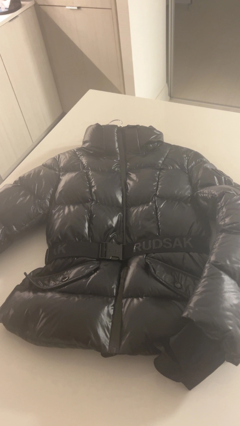 Stylish black puffer jacket. Features a branded belt. Excellent condition. Size not specified.