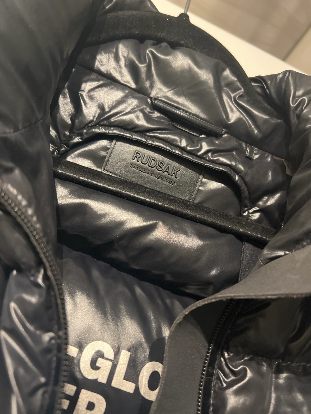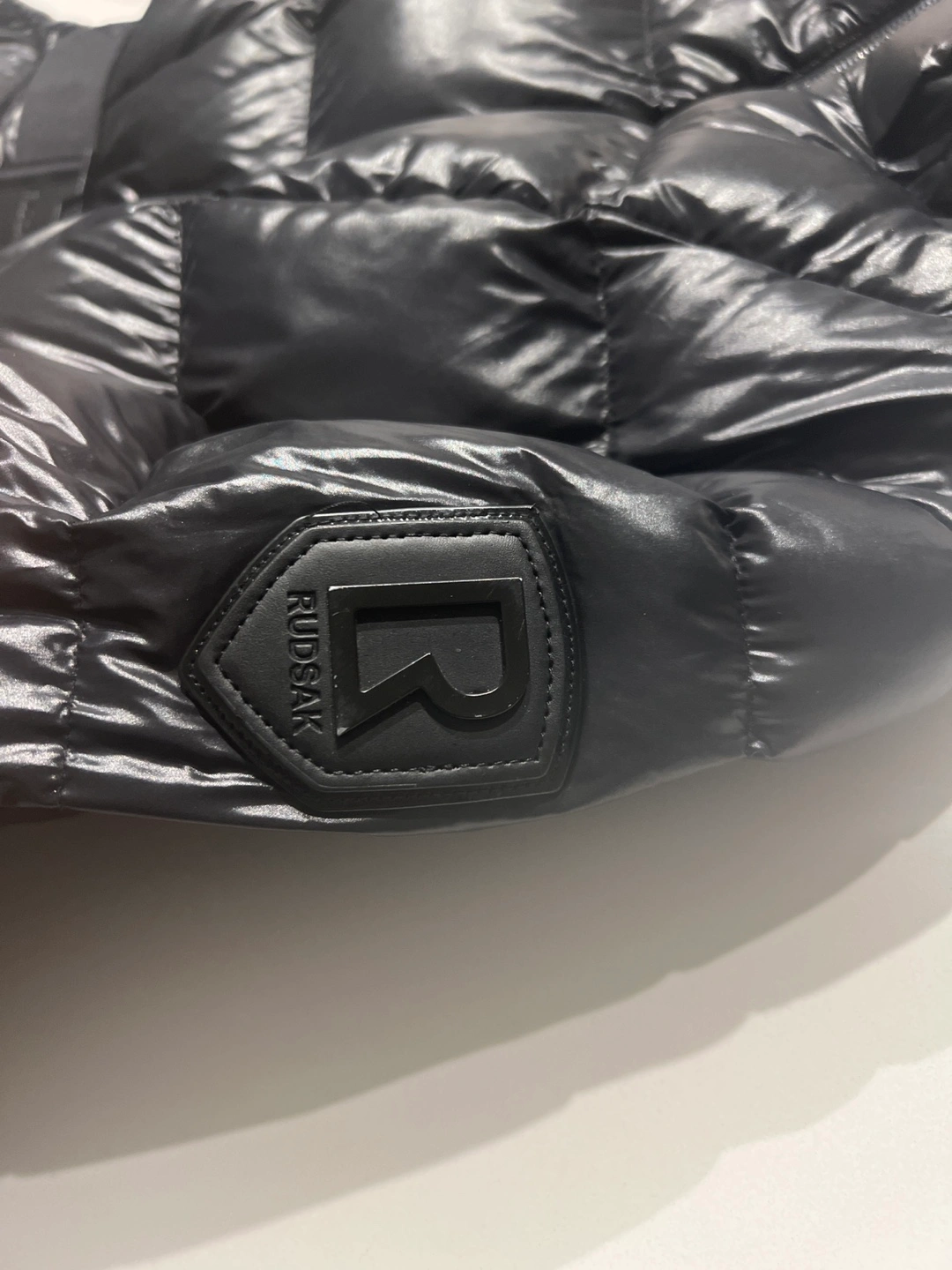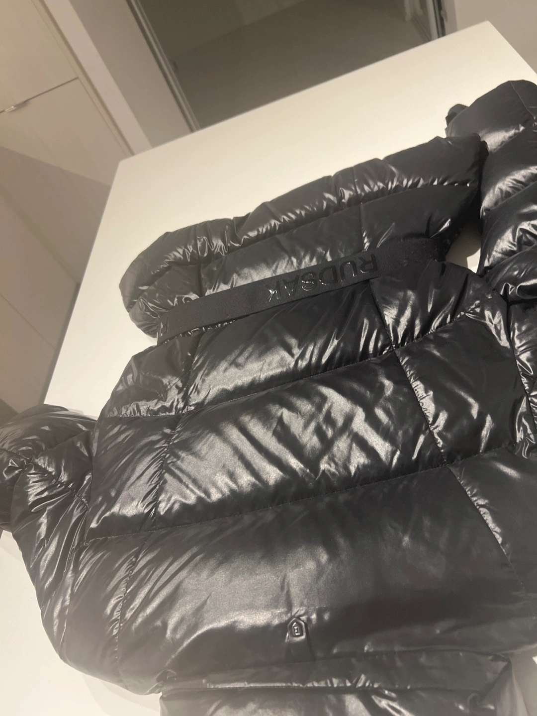 Stylish black puffer jacket. Features a branded belt. Excellent condition. Size not specified.