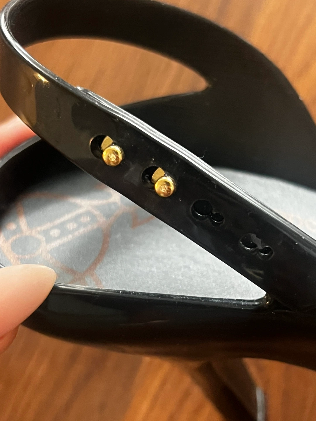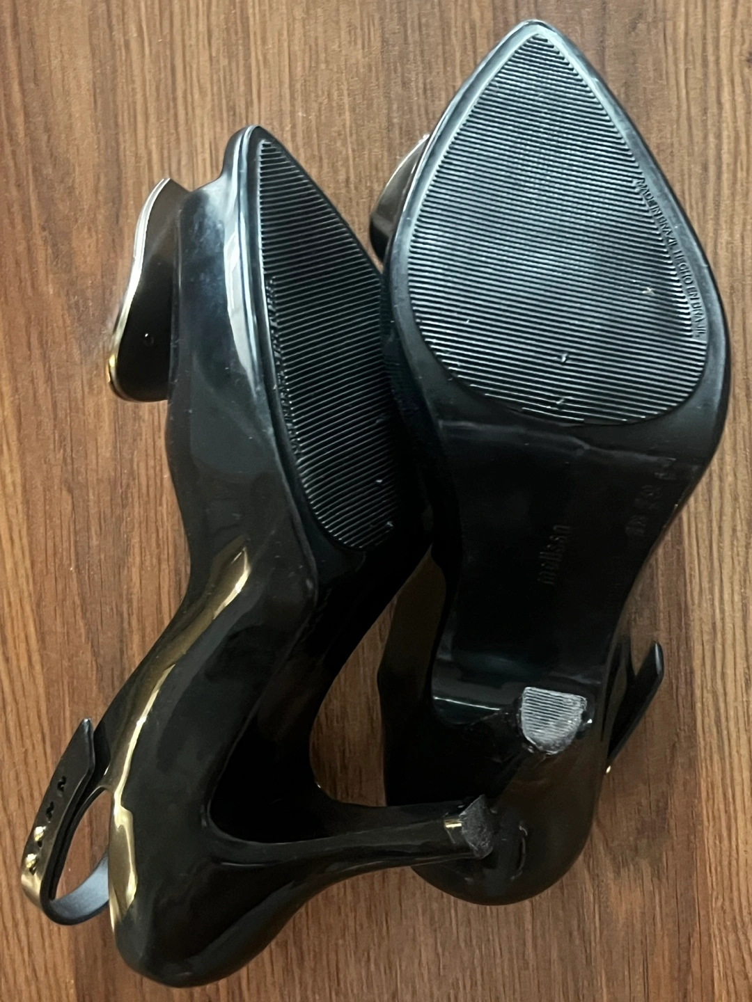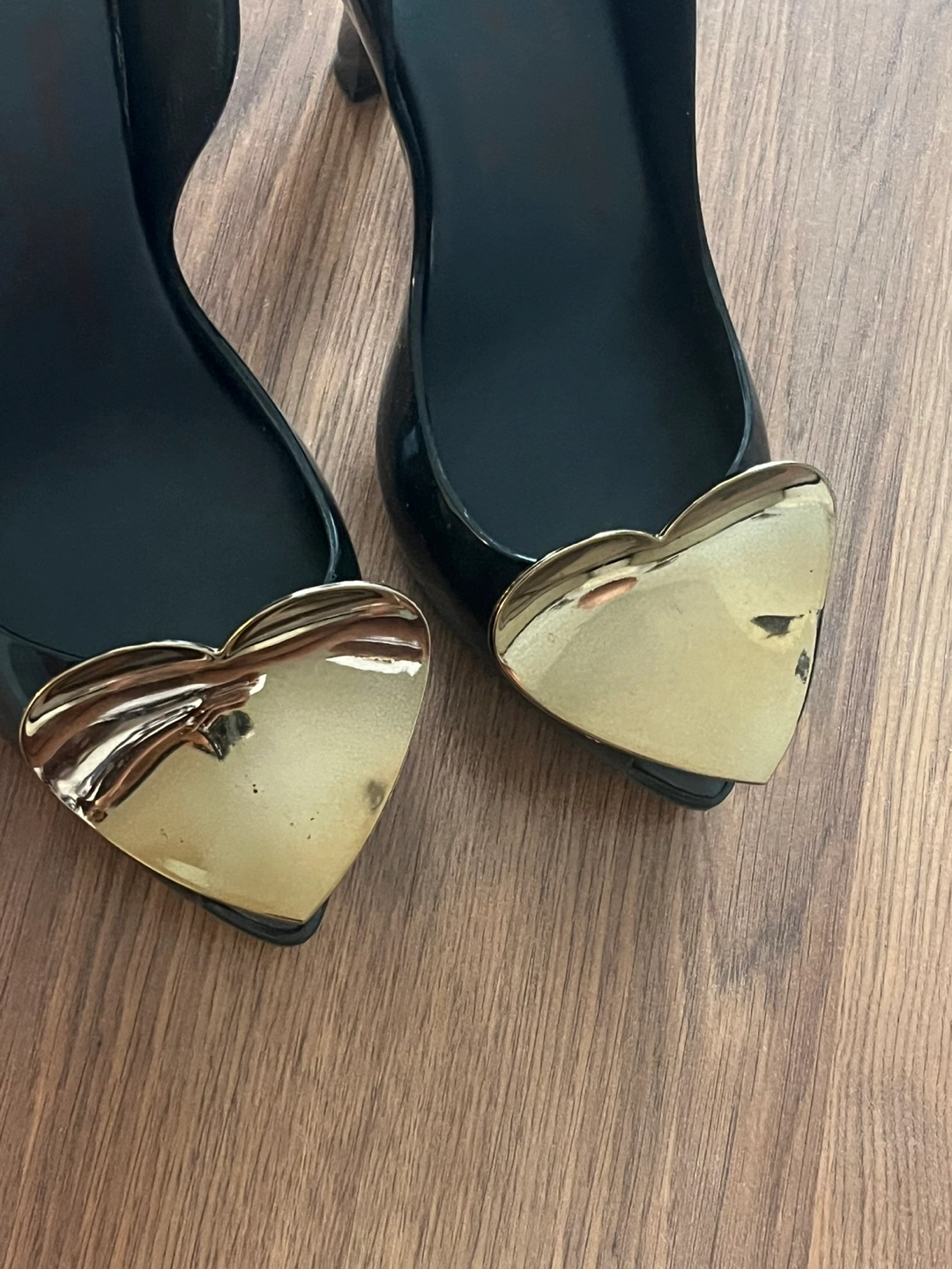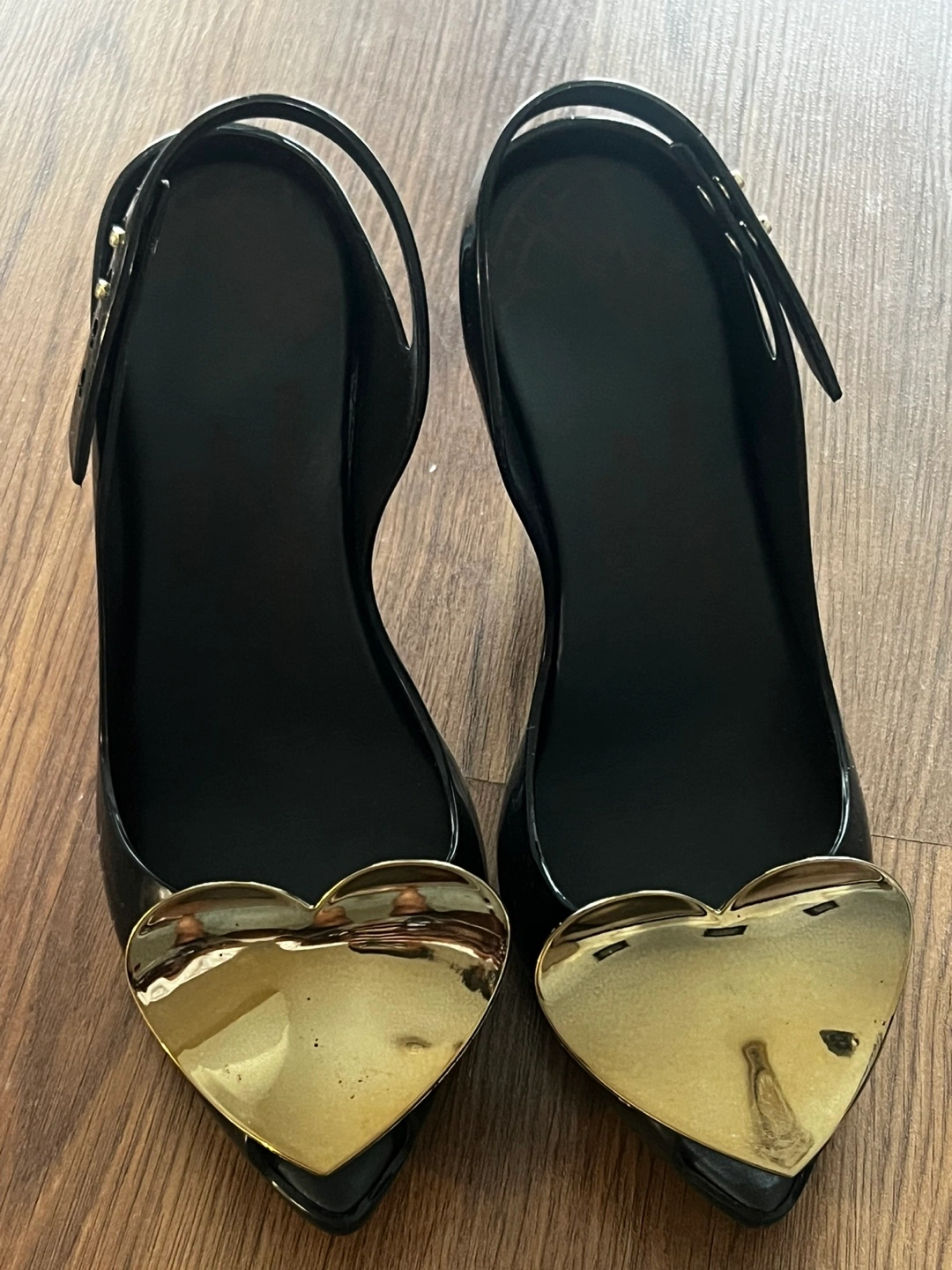 Black jelly heels. Gold heart accents.