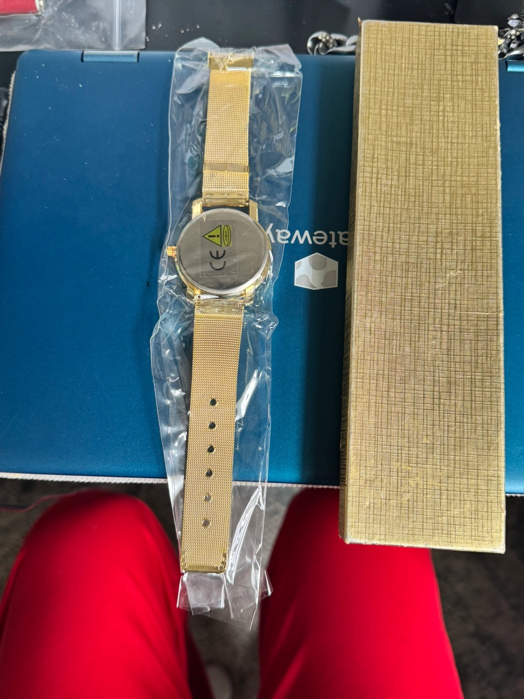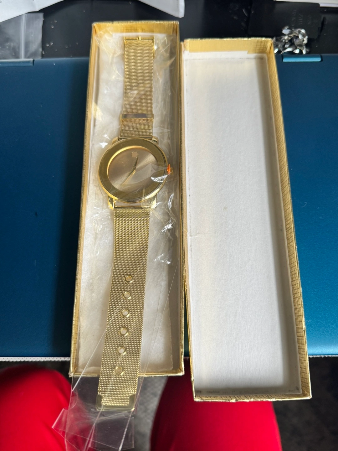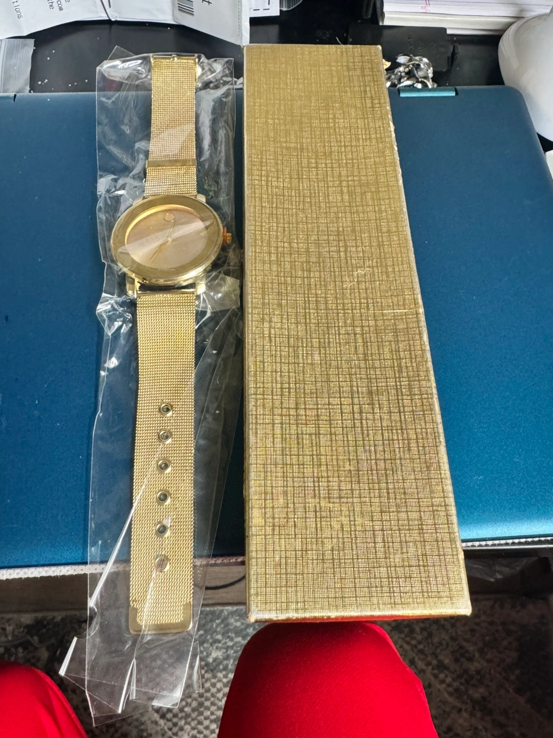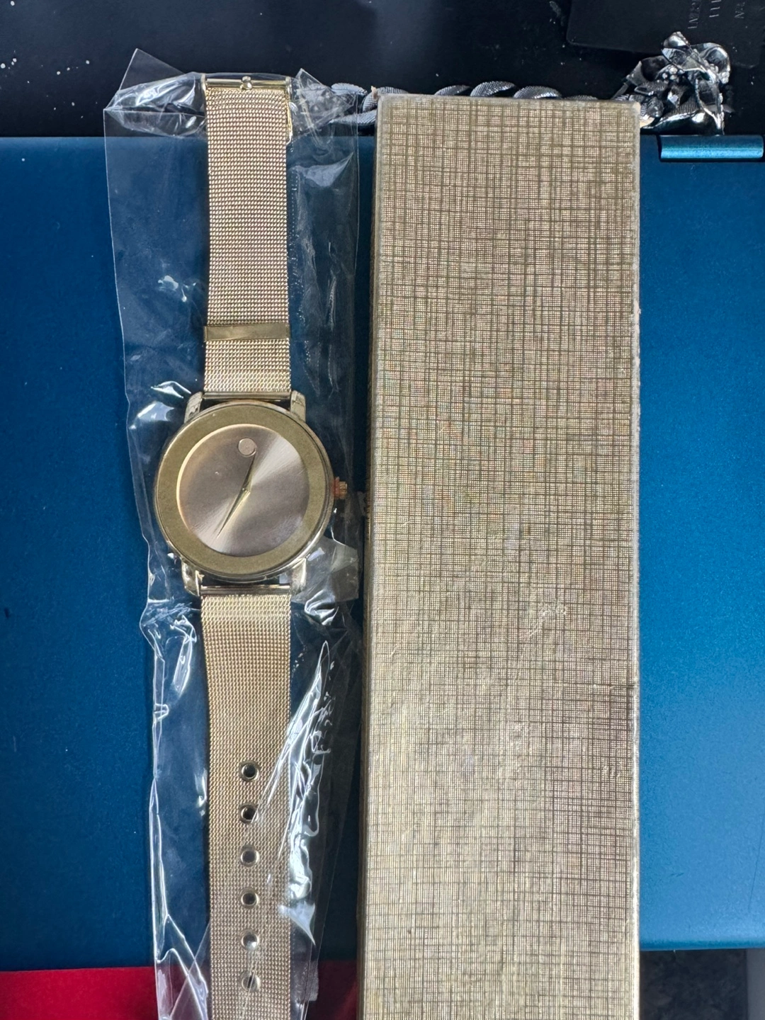 New gold watch with metal mesh band. Comes in original box. Simple design.