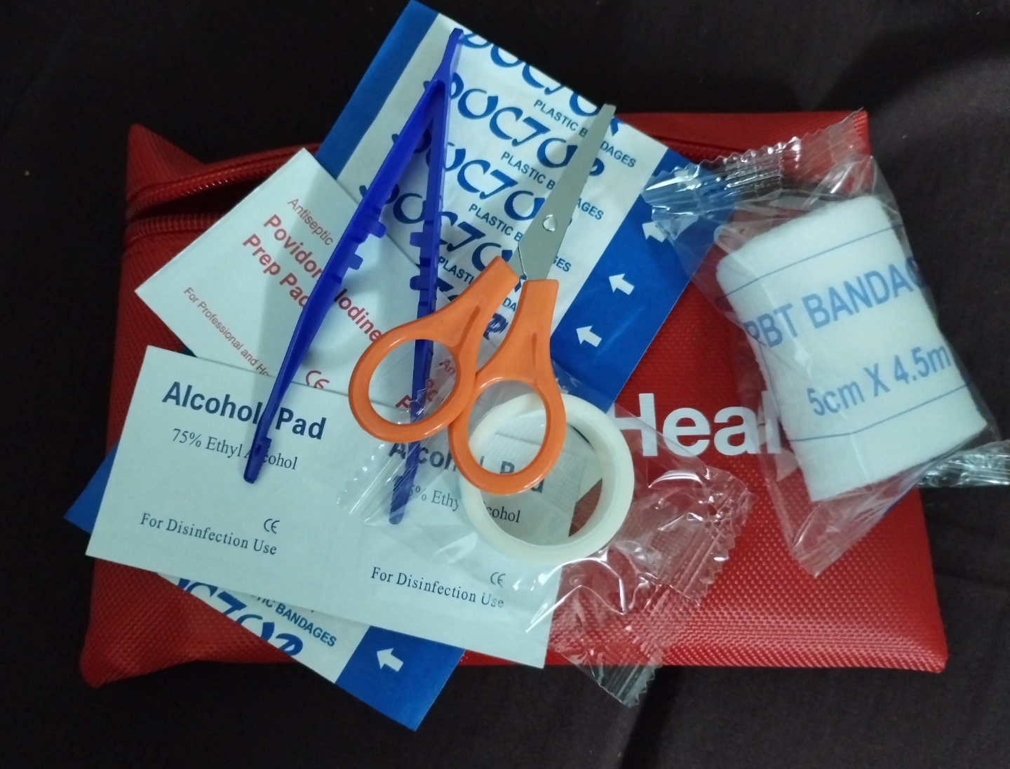 Small red pouch first aid kit. Contains bandages, antiseptic wipes, alcohol pads, and small scissors. Good for minor injuries.