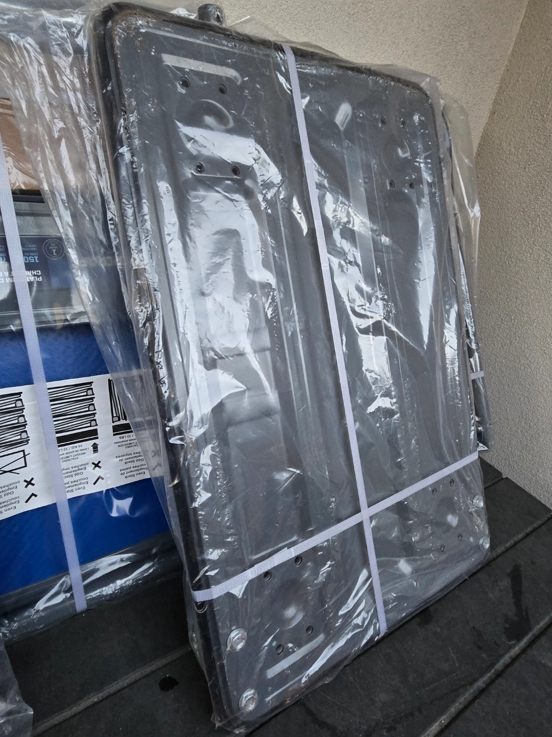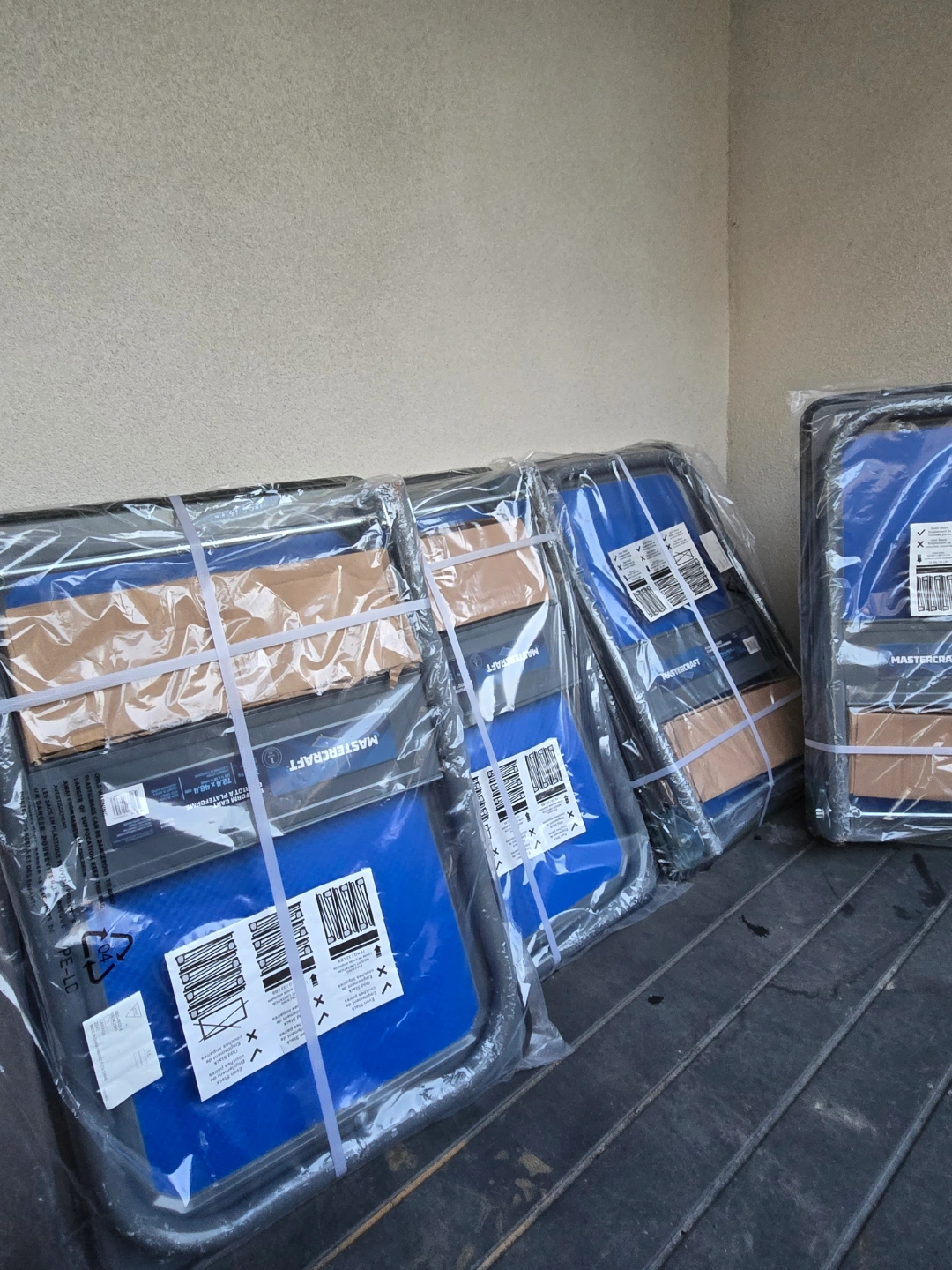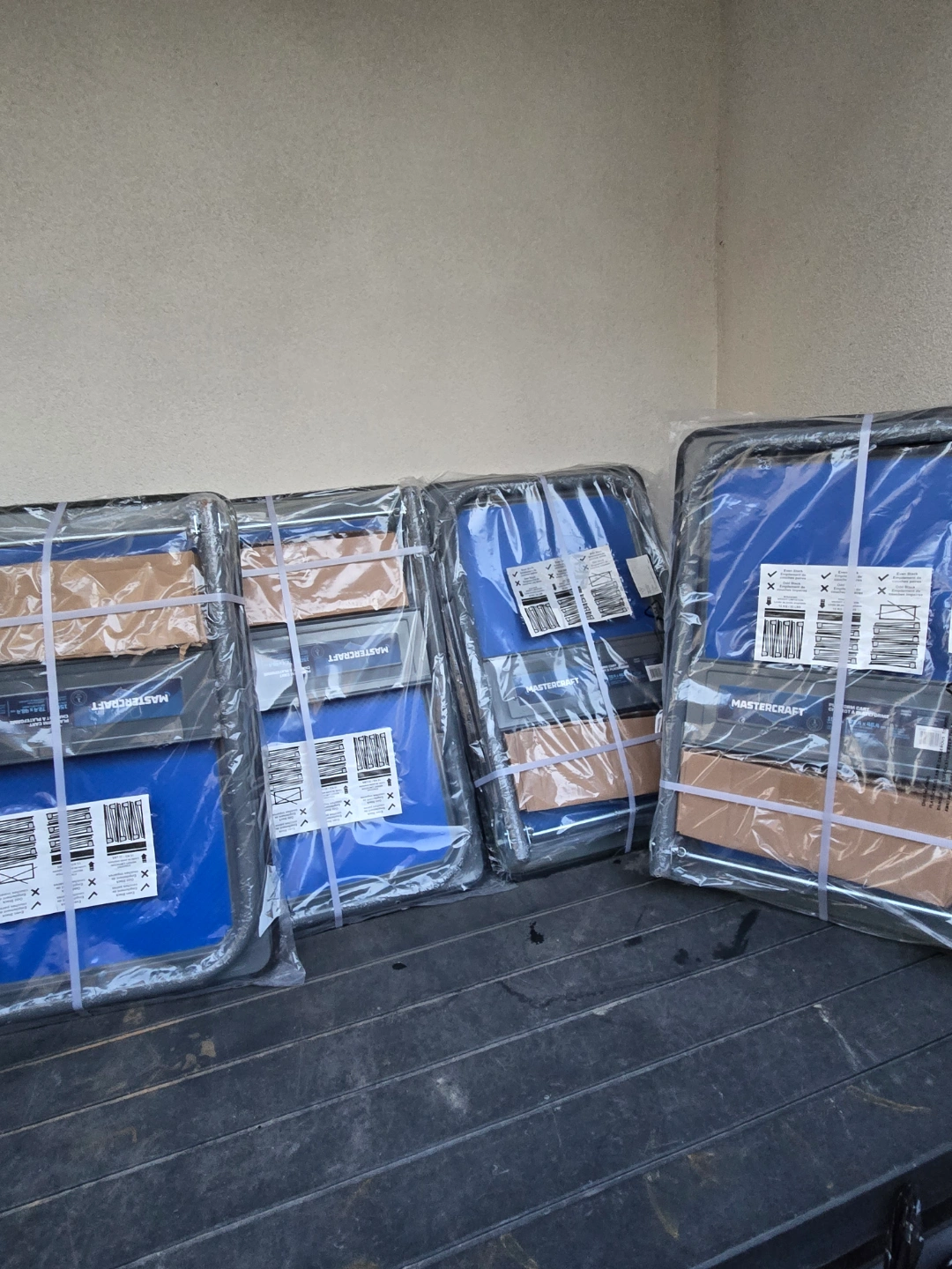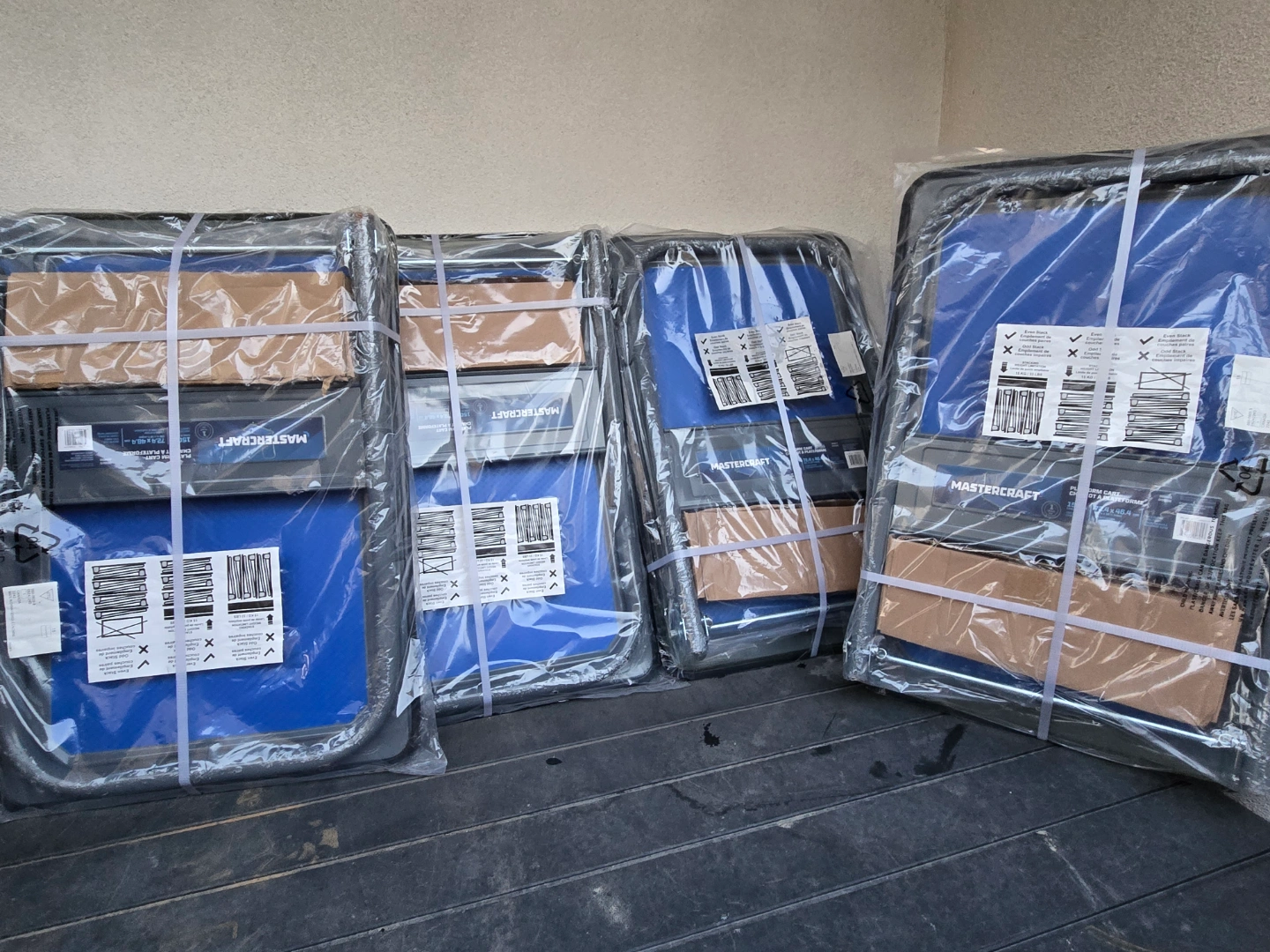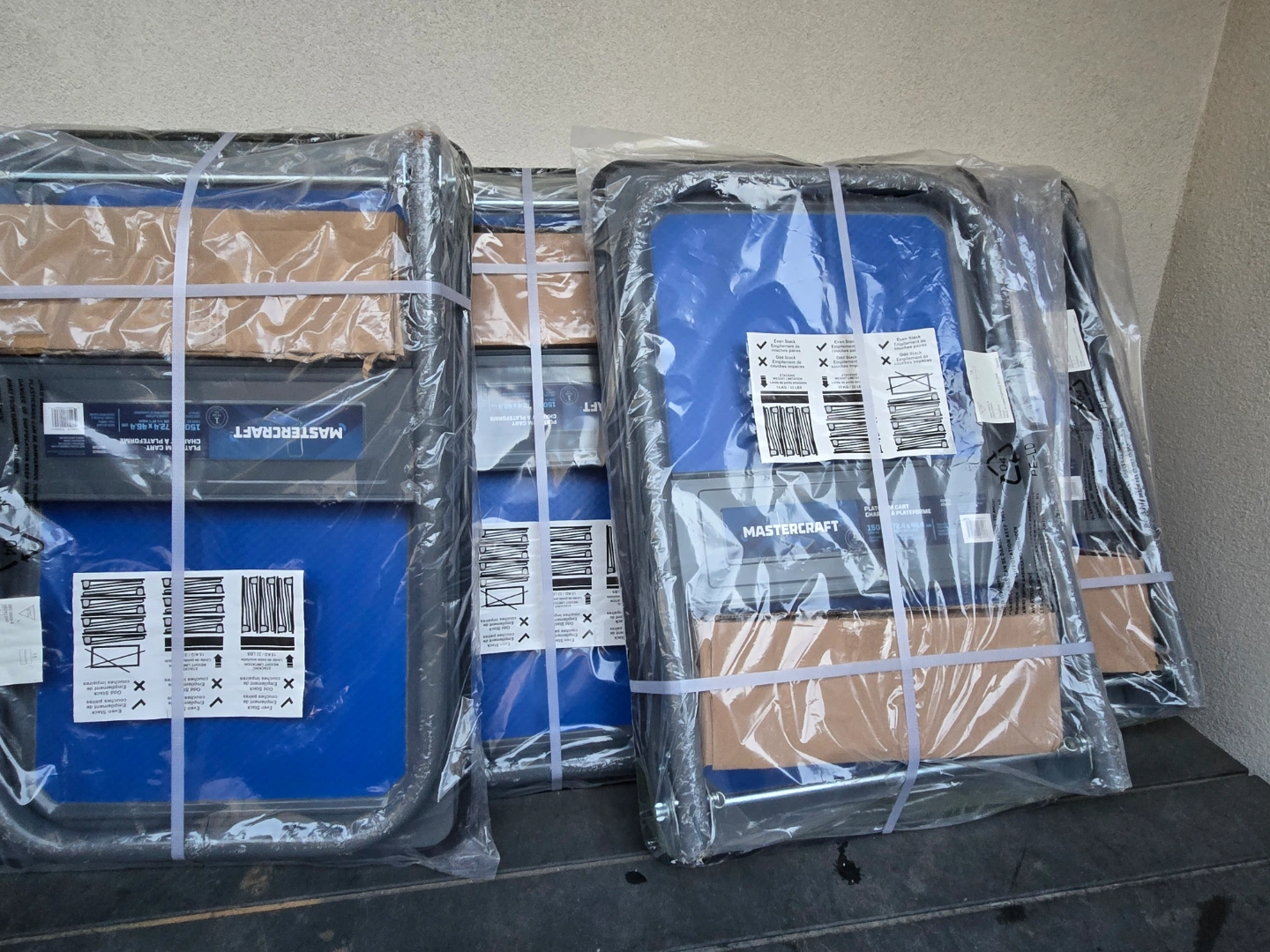 Four brand new, still in packaging Mastercraft platform carts. Quick-release steel handle. 150 kg capacity. 72.4 x 46.4 cm loading platform.