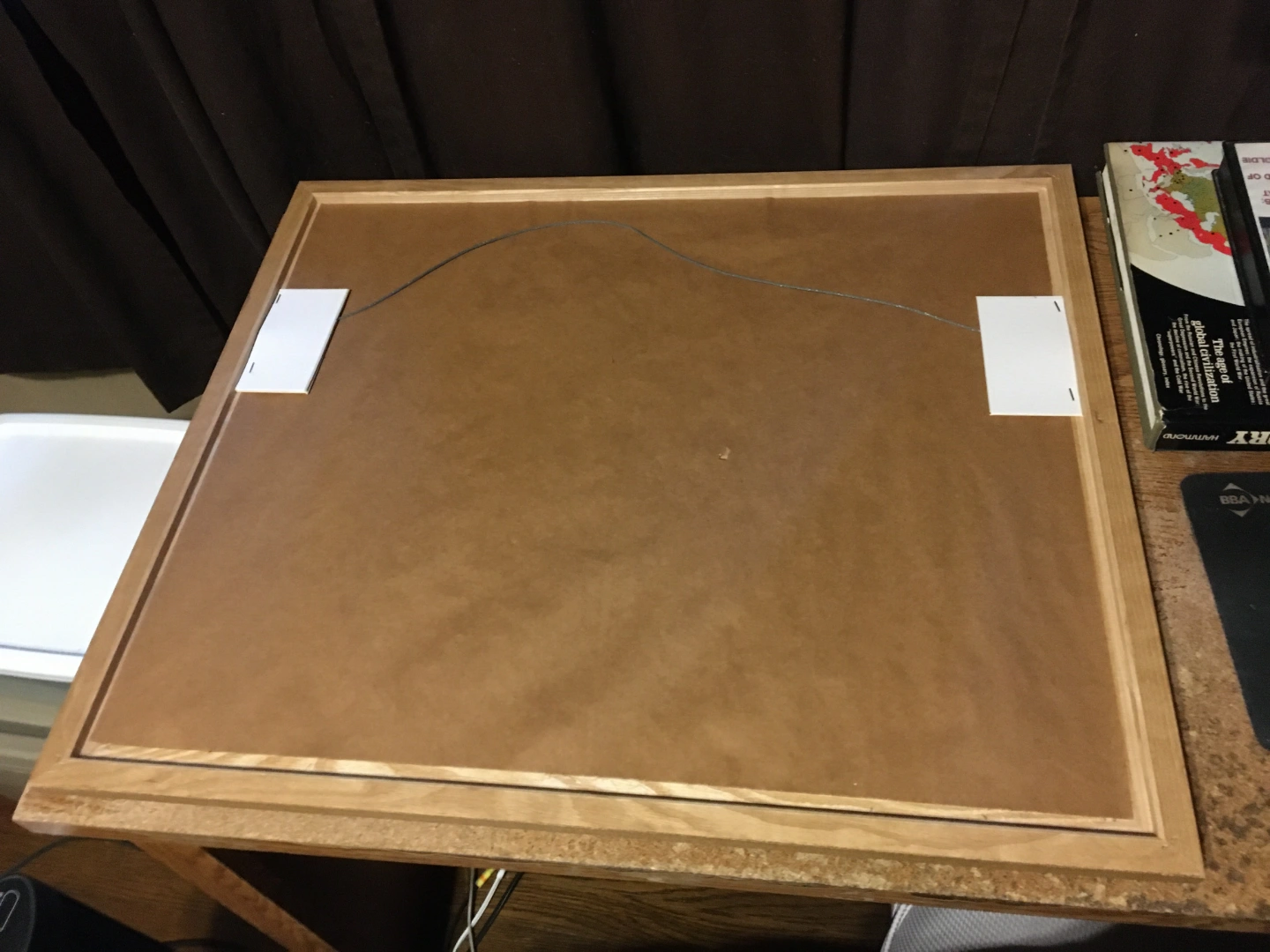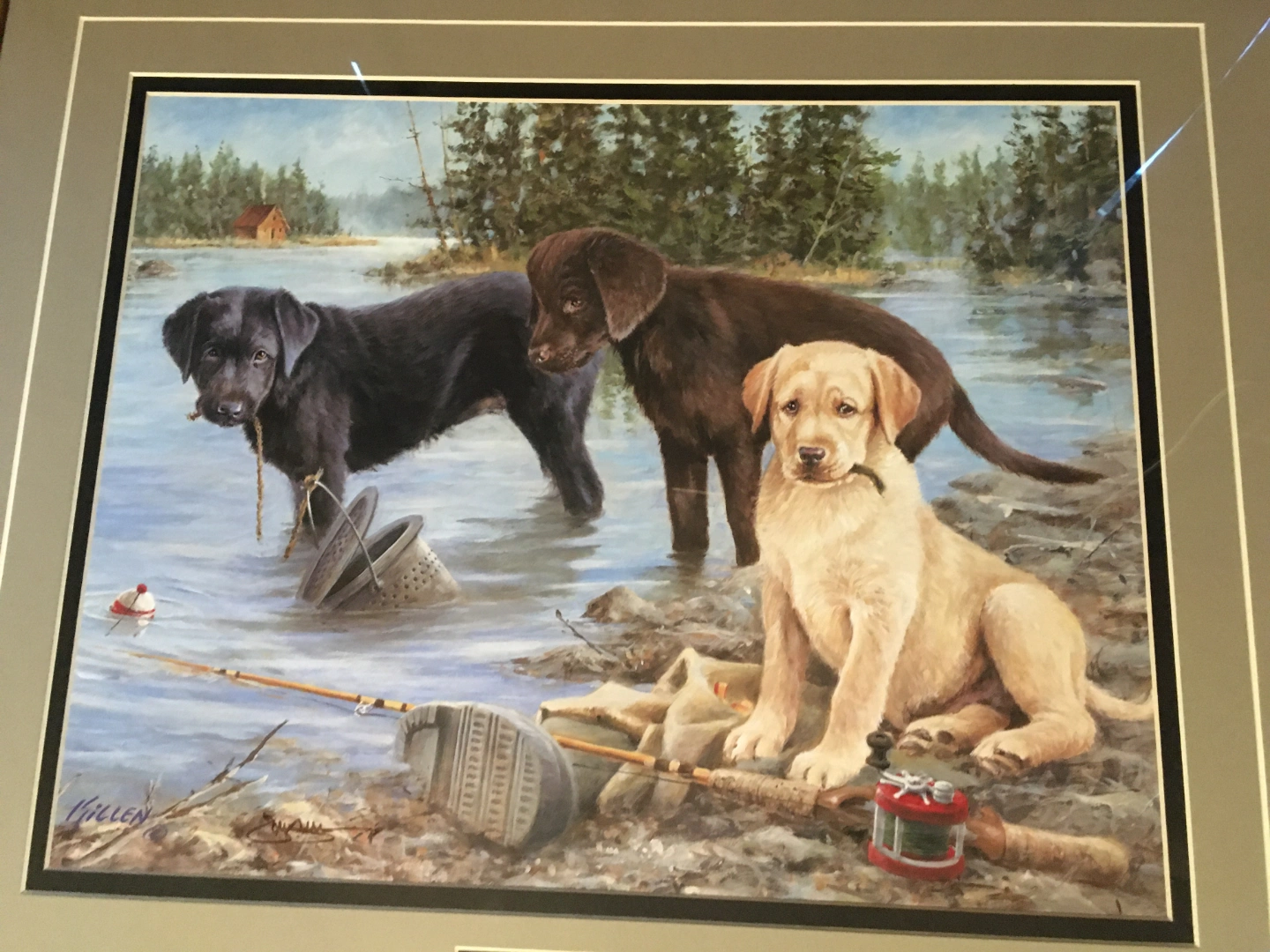 Framed art print of three Labrador Retriever puppies fishing. Artist signature visible. Wood frame. Features a plaque with the title and artist's name. 27x23. Cash only pick up at house