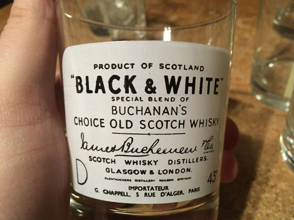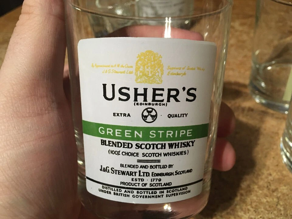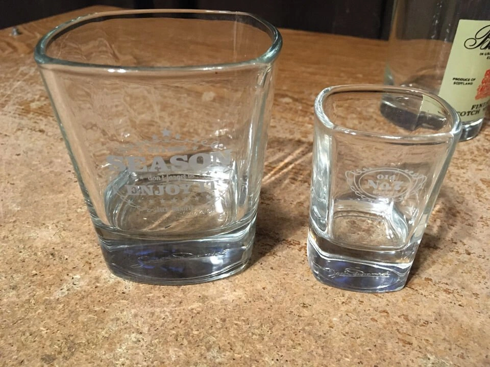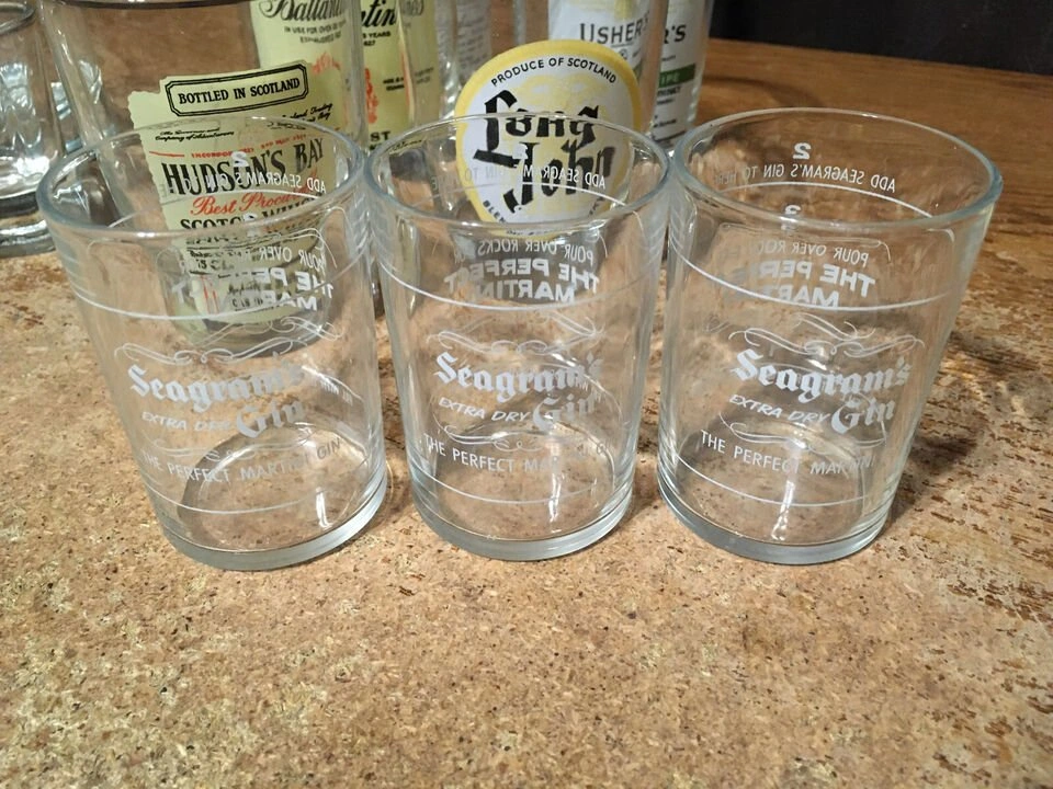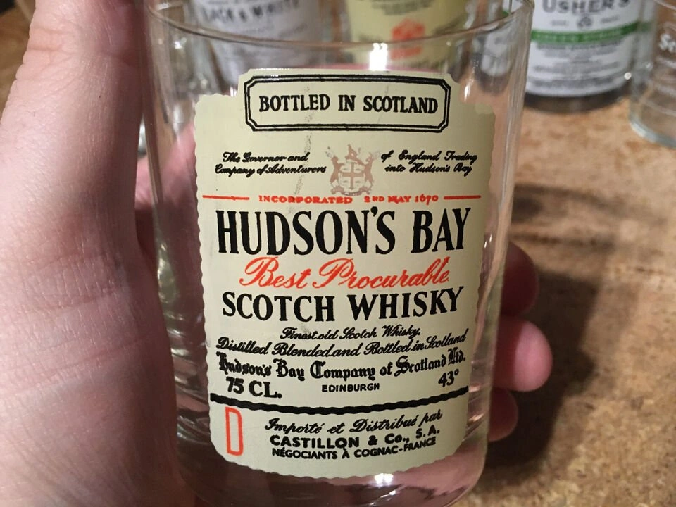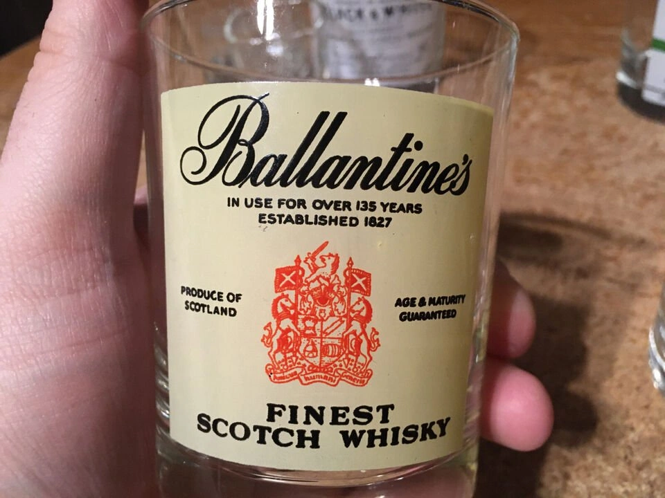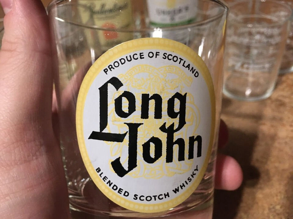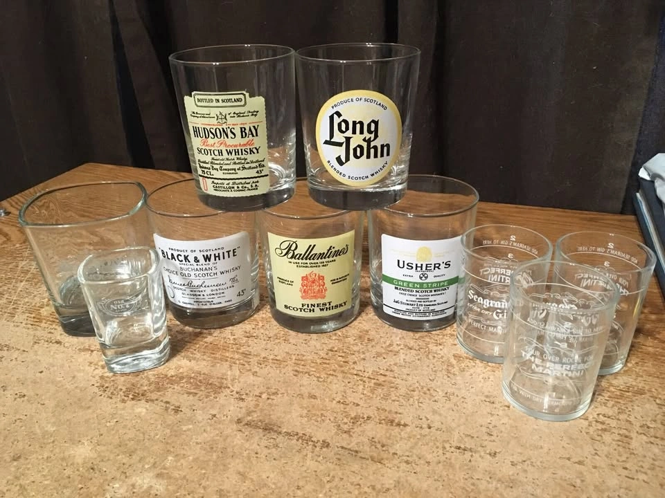 Set of 10 collectible whiskey glasses. Various brands including Hudson's Bay, Ballantine's, Long John, Usher's, and more. Great for collectors or enthusiasts. pick up at house