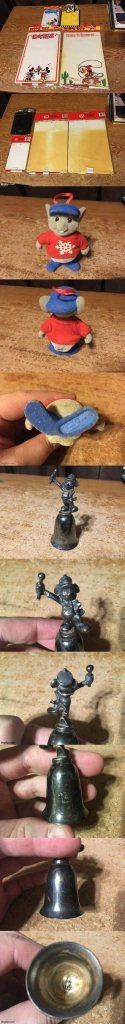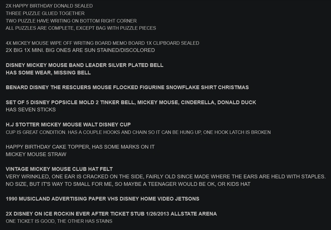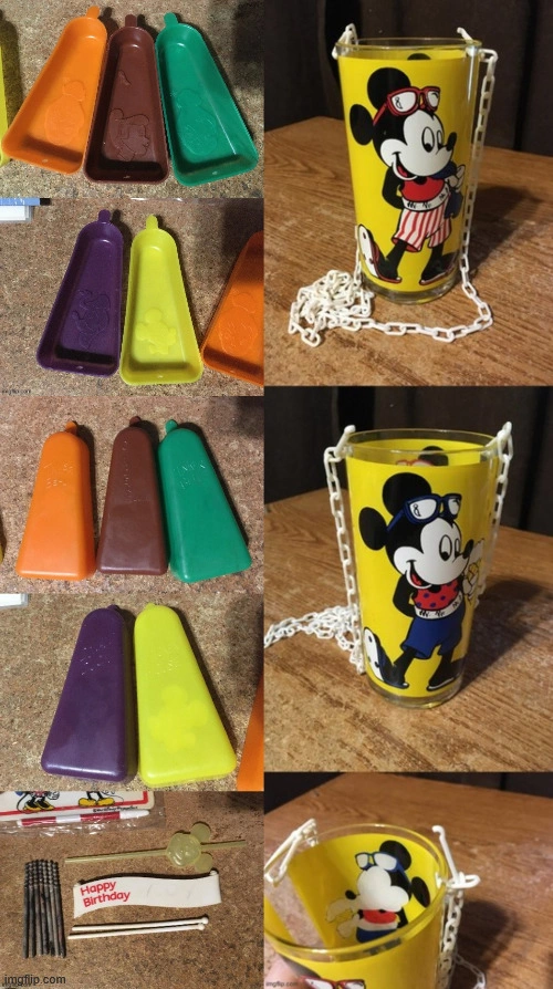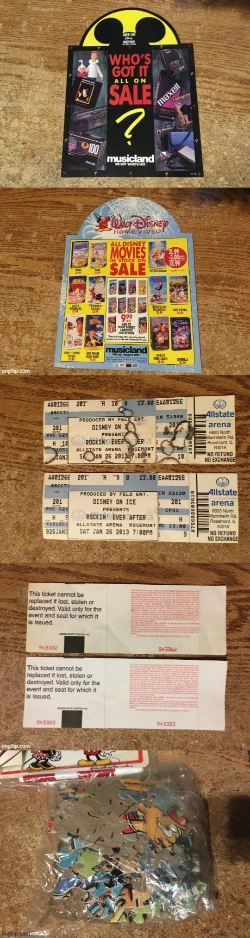 Lot of vintage Disney items. Includes puzzles, playmats, figures, Features Mickey Mouse, Donald Duck, Pluto, and other Disney characters. Great for collectors or Disney fans.The clipboards are sun bleed you can see that a good portion of it is a tannish brown on it. some of the puzzles have some stains on it and some of them are glued together one picture shows the ones that are glued together. popsicle molds, Disney books on ice tickets, Mickey mouse club cap has lots of wear. pick up at house