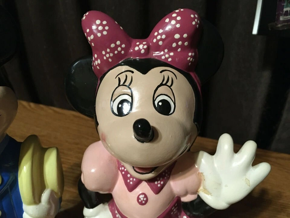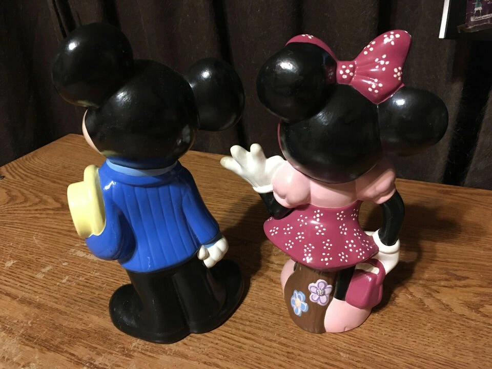 Pair of ceramic Mickey and Minnie Mouse figurines. Mickey wears a blue jacket and yellow hat. Minnie wears a pink dress. Collectible items. Show some wear. 9" tall. Minnie's nose was glued back on pick up at house