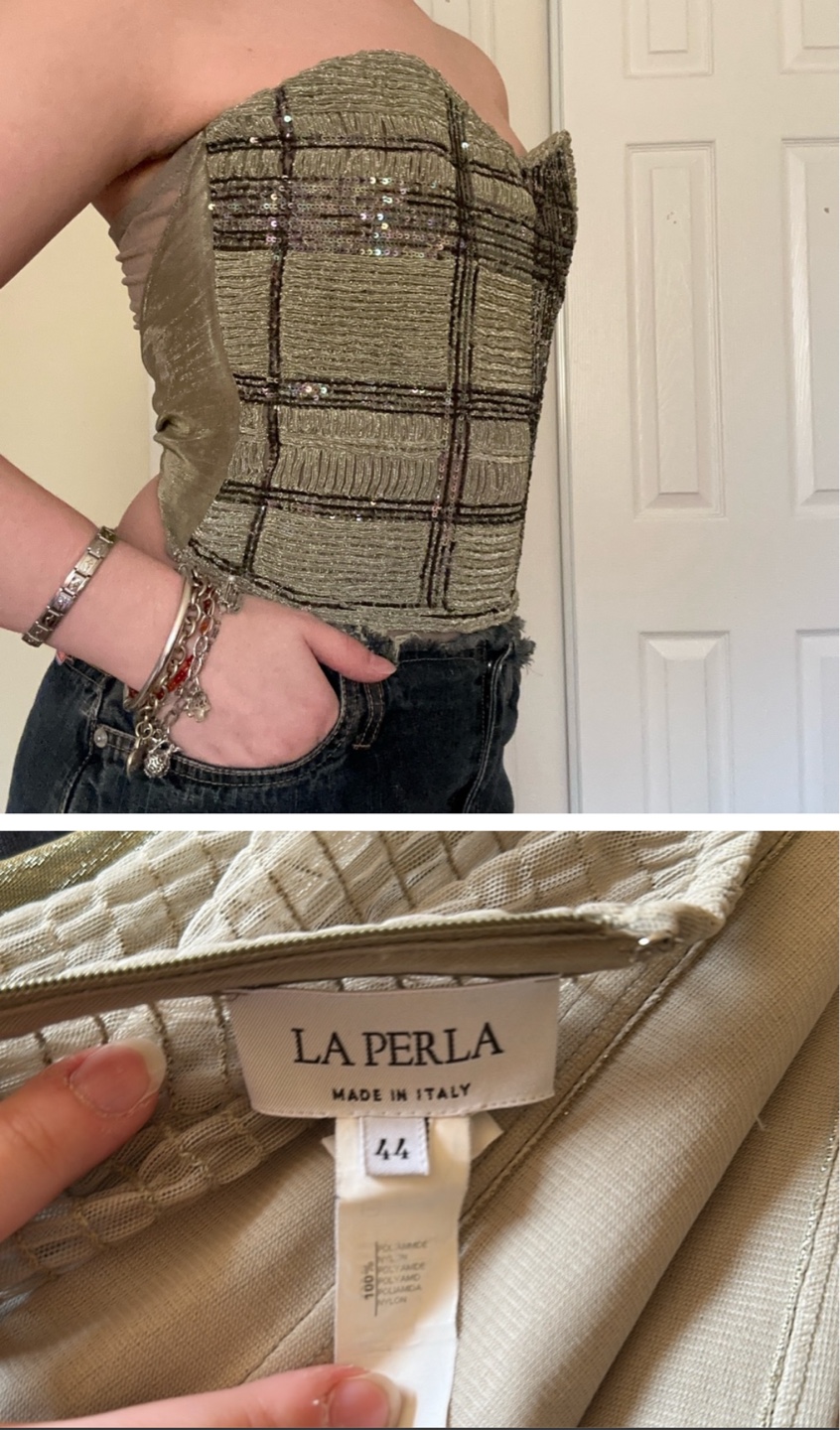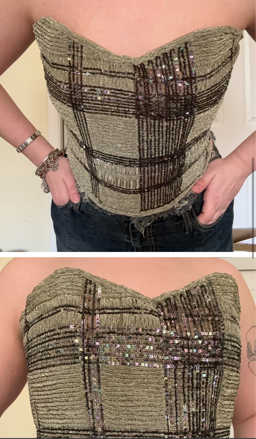 Stunning olive green corset top. Features a beautiful sequined plaid pattern. Back is sheer with a tie closure. Size 44. Love it but too big for me!
