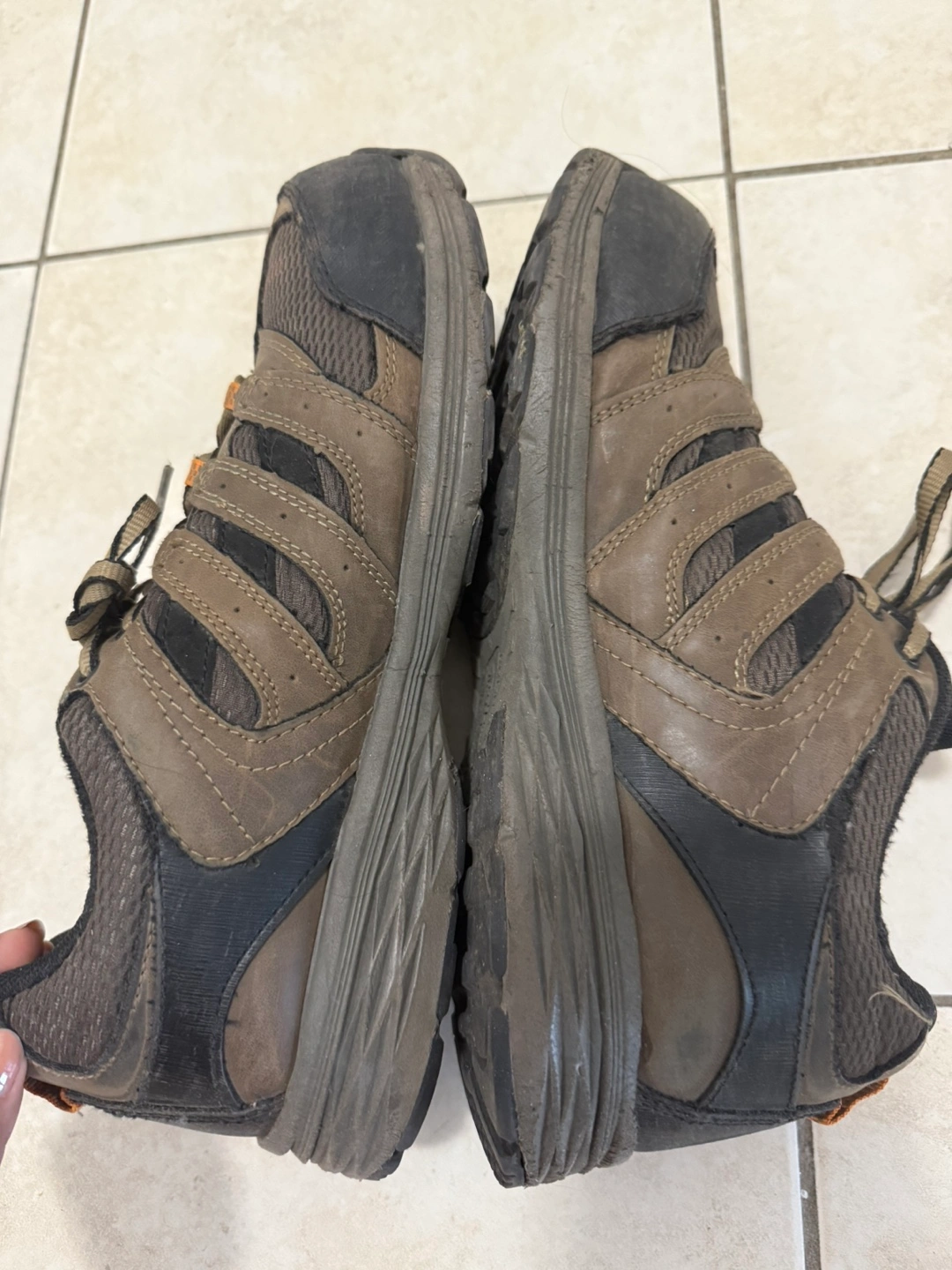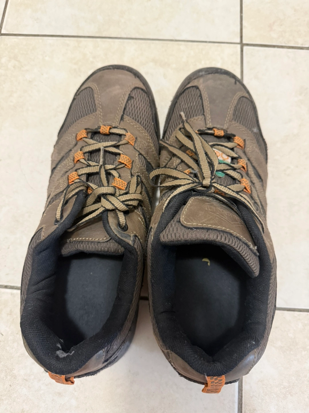 Pair of men's brown safety shoes. Lace-up closure. Good for factory work and outdoor activities.
