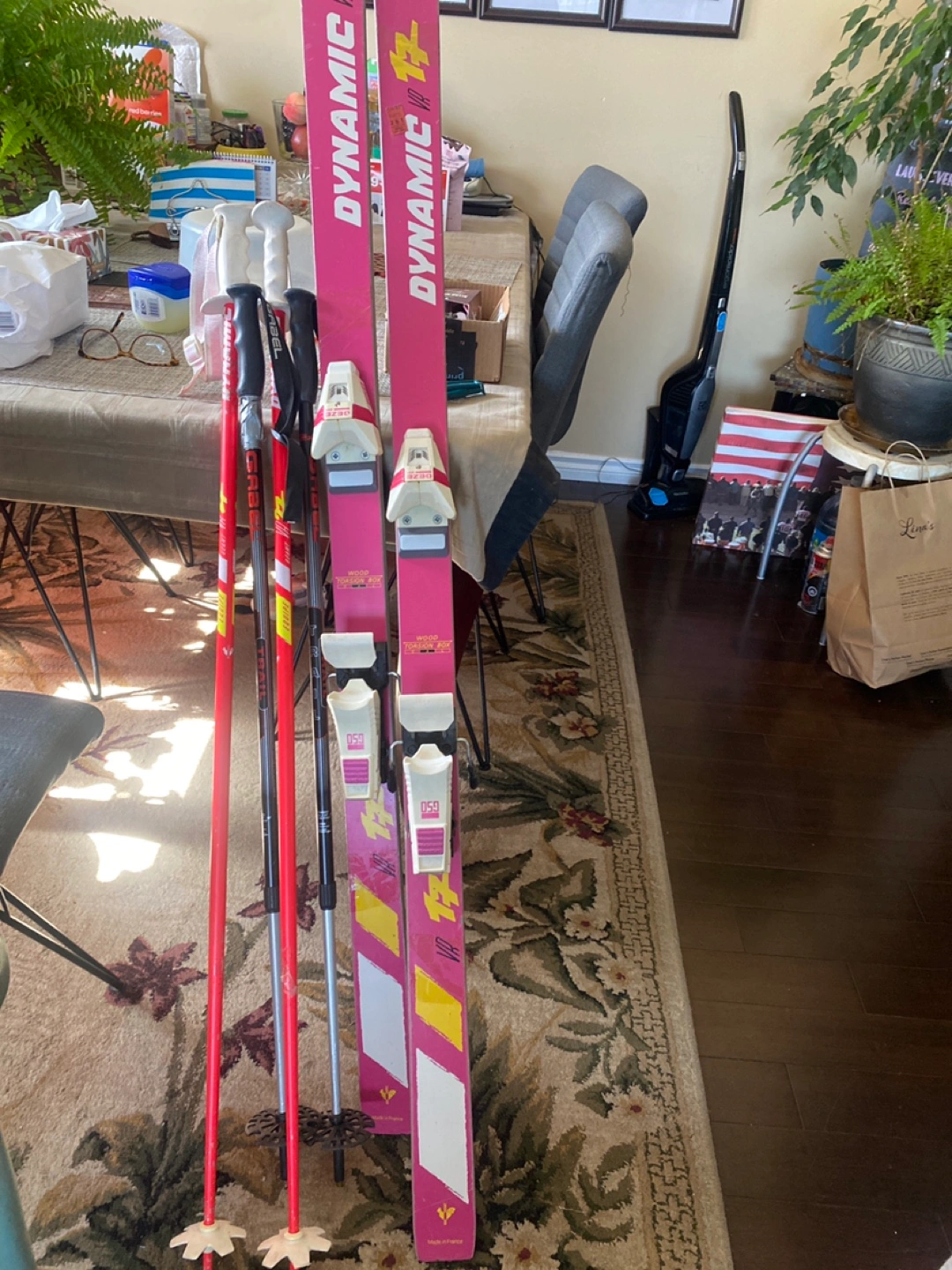 Used Dynamic skis, 150 cm long. Pink and white. Includes three pairs of ski poles. Good condition.