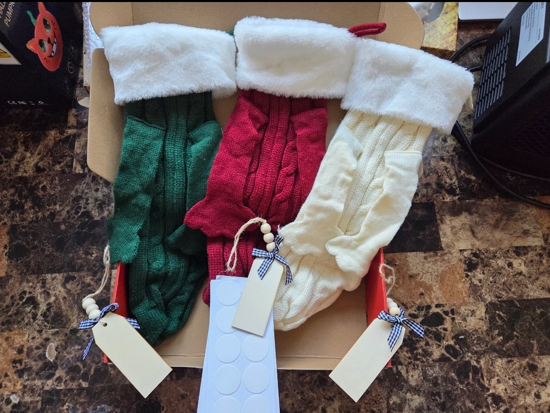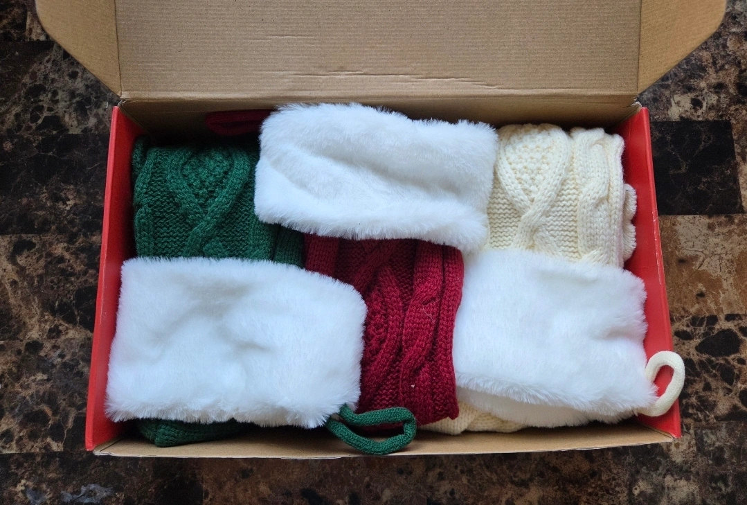 Have 3 Knitted Personalized Xmas Stocking in each box.