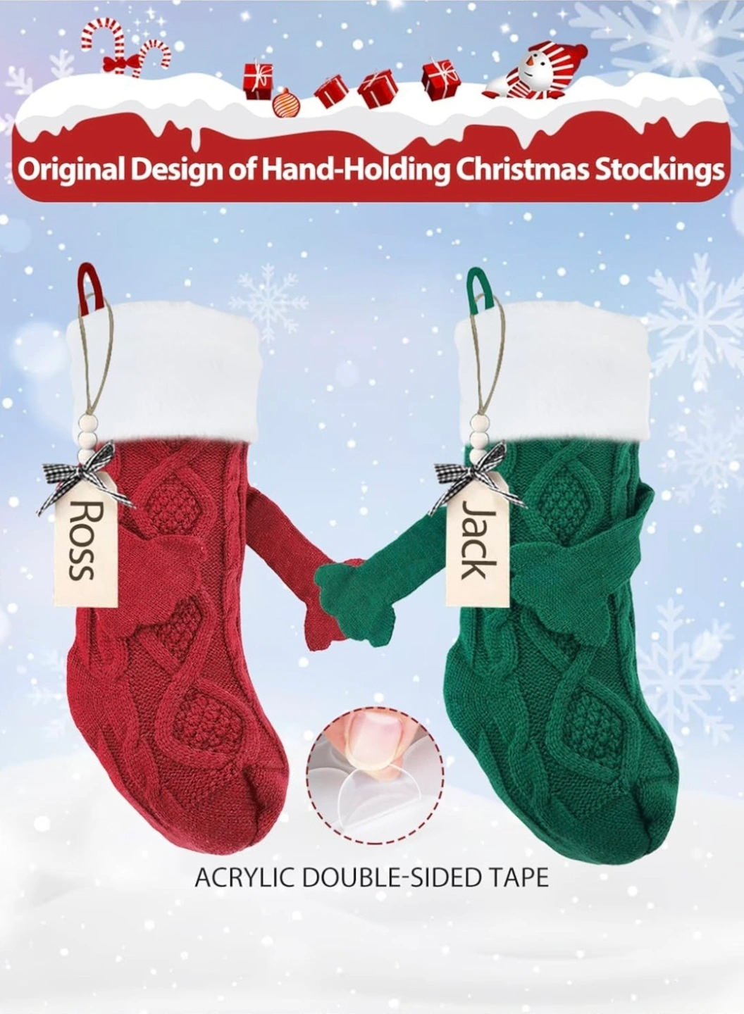 2 Brand New Cute Holding Hands Christmas Stockings, Name Tags