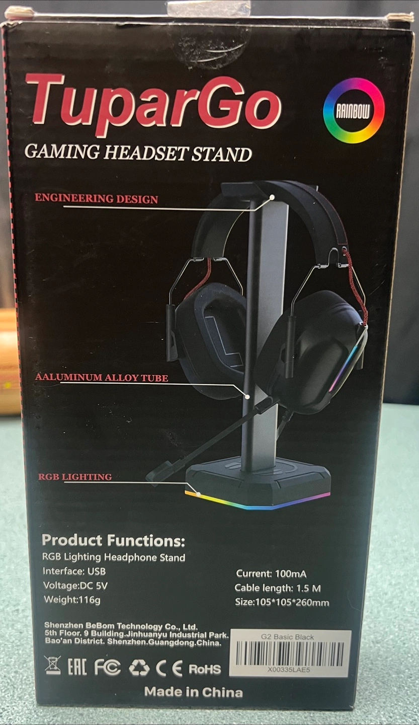 New in box. Aluminum alloy headset stand. RGB lighting. Includes USB cable. 1.5 meter cable length. Black.