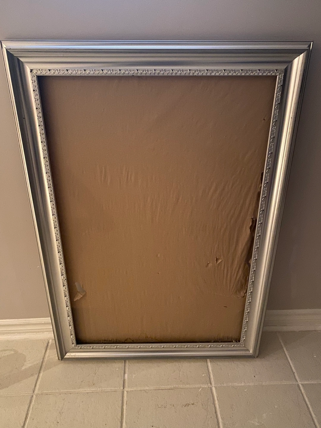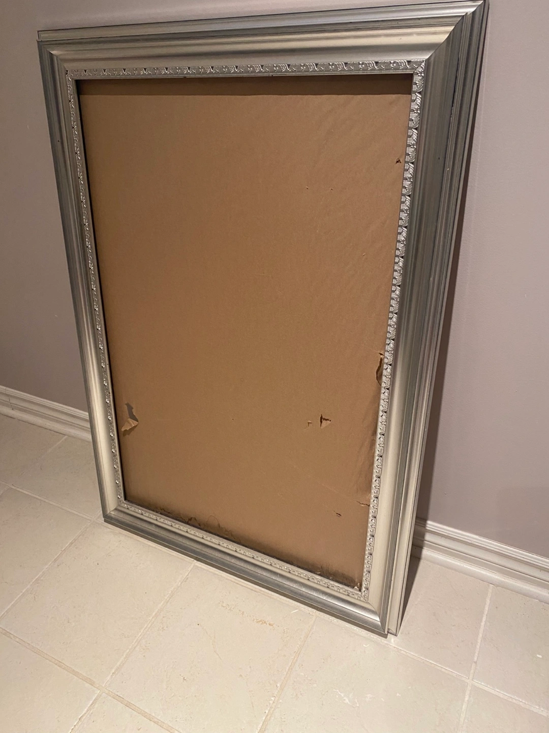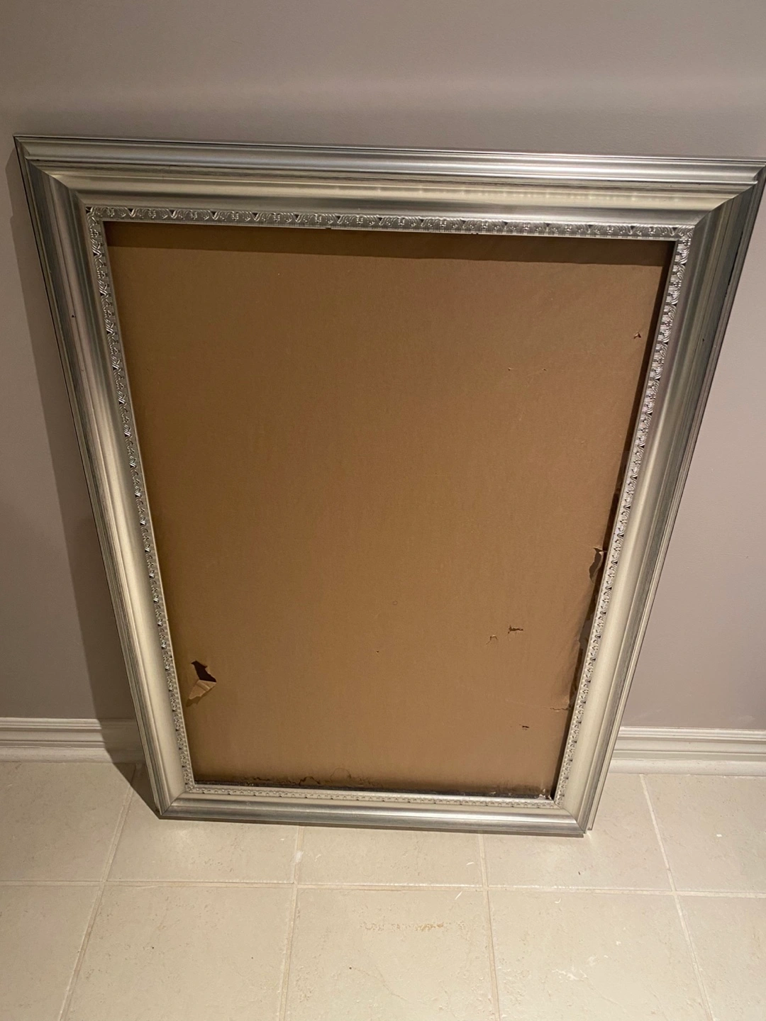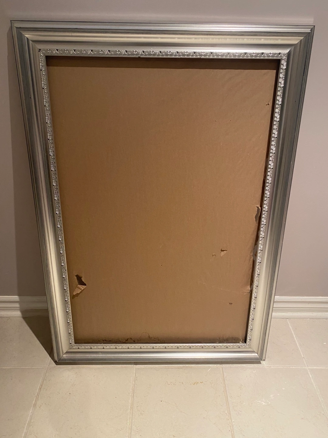 Large silver picture frame. Ornate detailing. Ready to display your favourite artwork or photograph. Hanging wire included. H42 W29