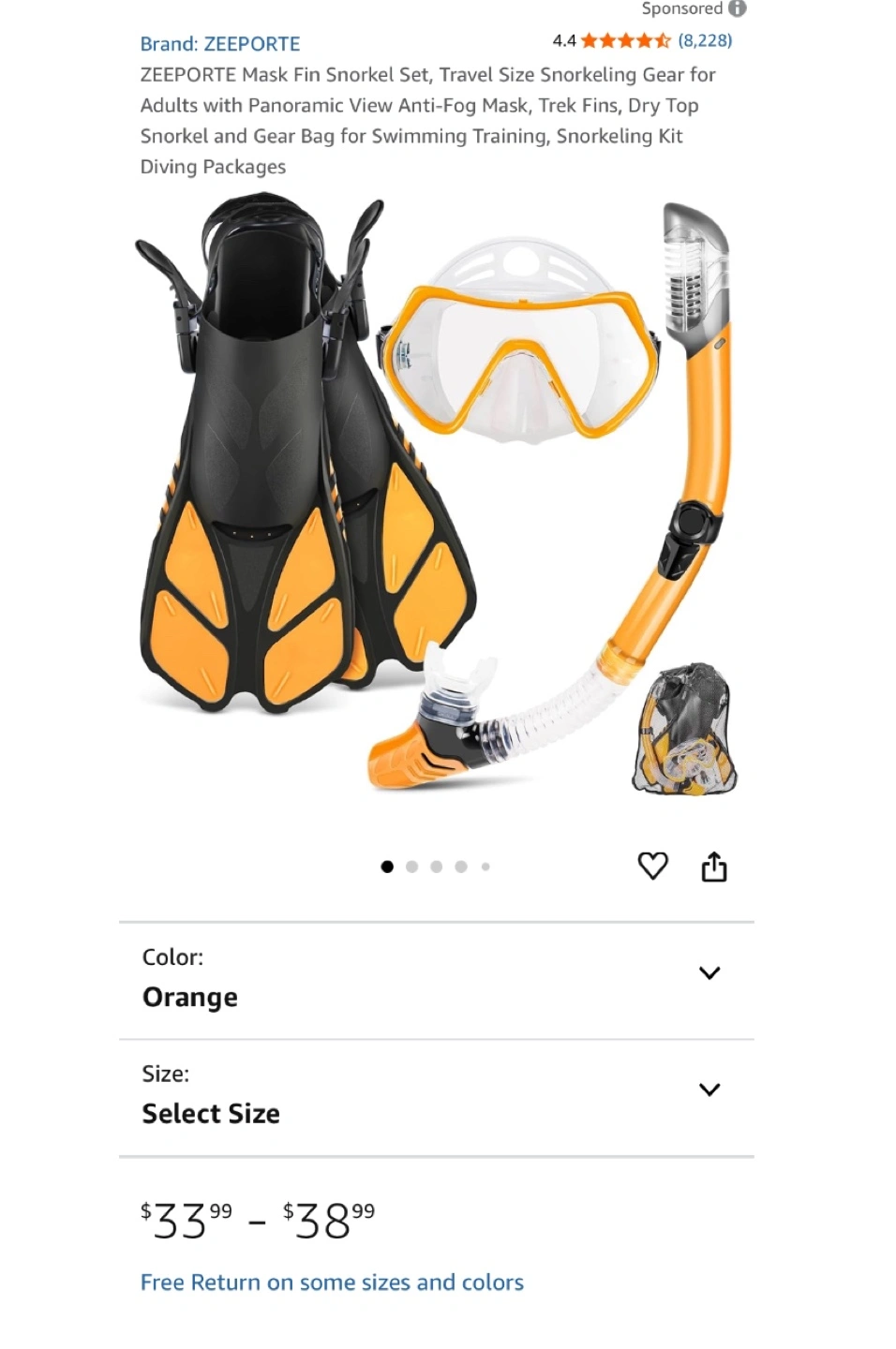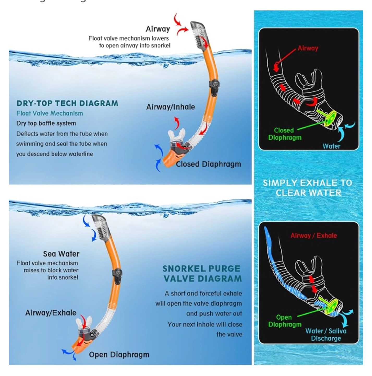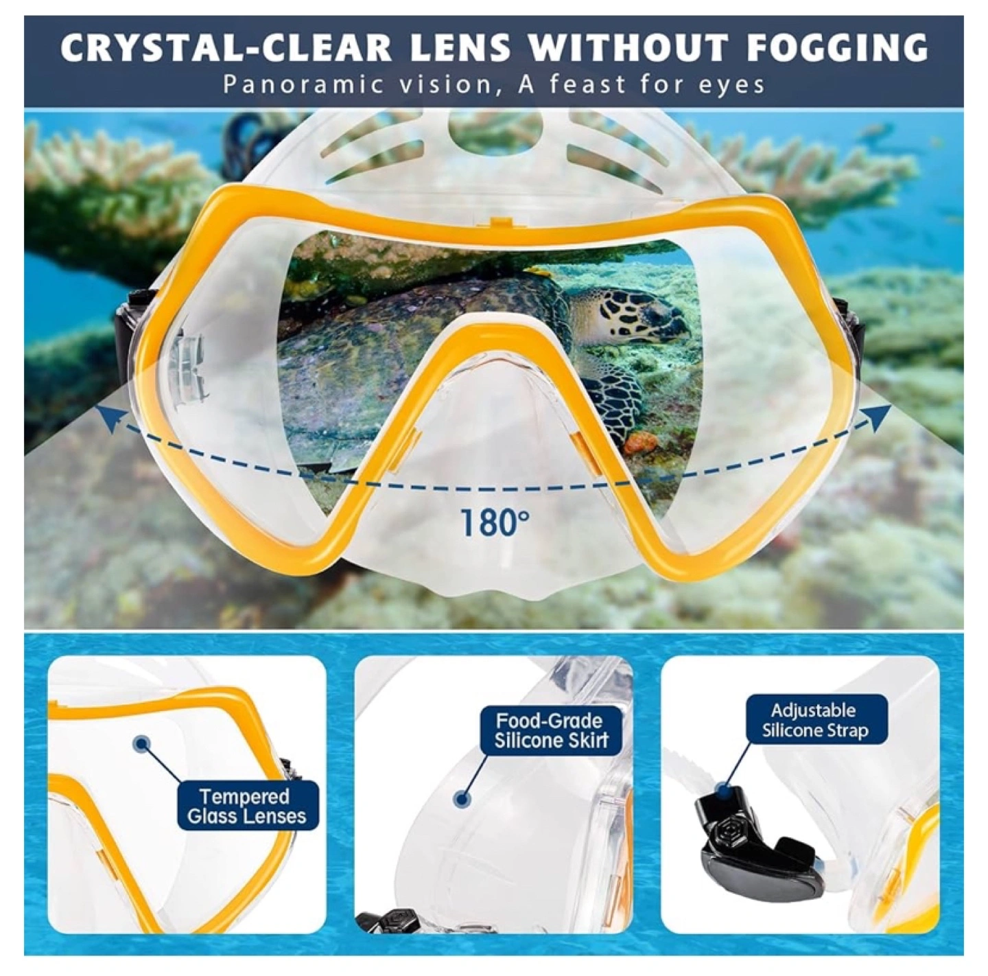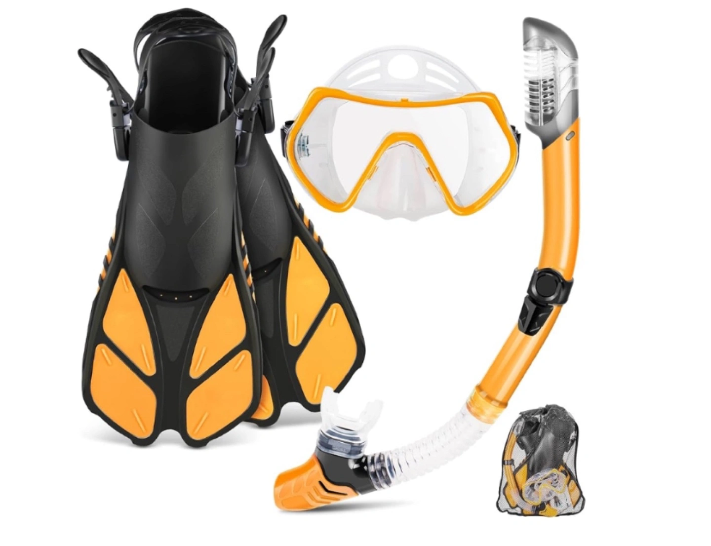 Orange snorkeling set. Includes mask, snorkel, and fins. Features panoramic view mask, anti-fog lenses, dry top snorkel, and gear bag. Great for swimming, training, and snorkeling.