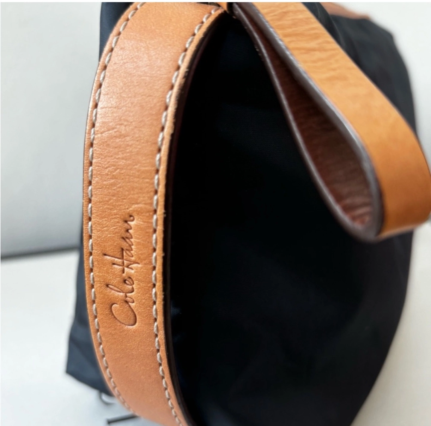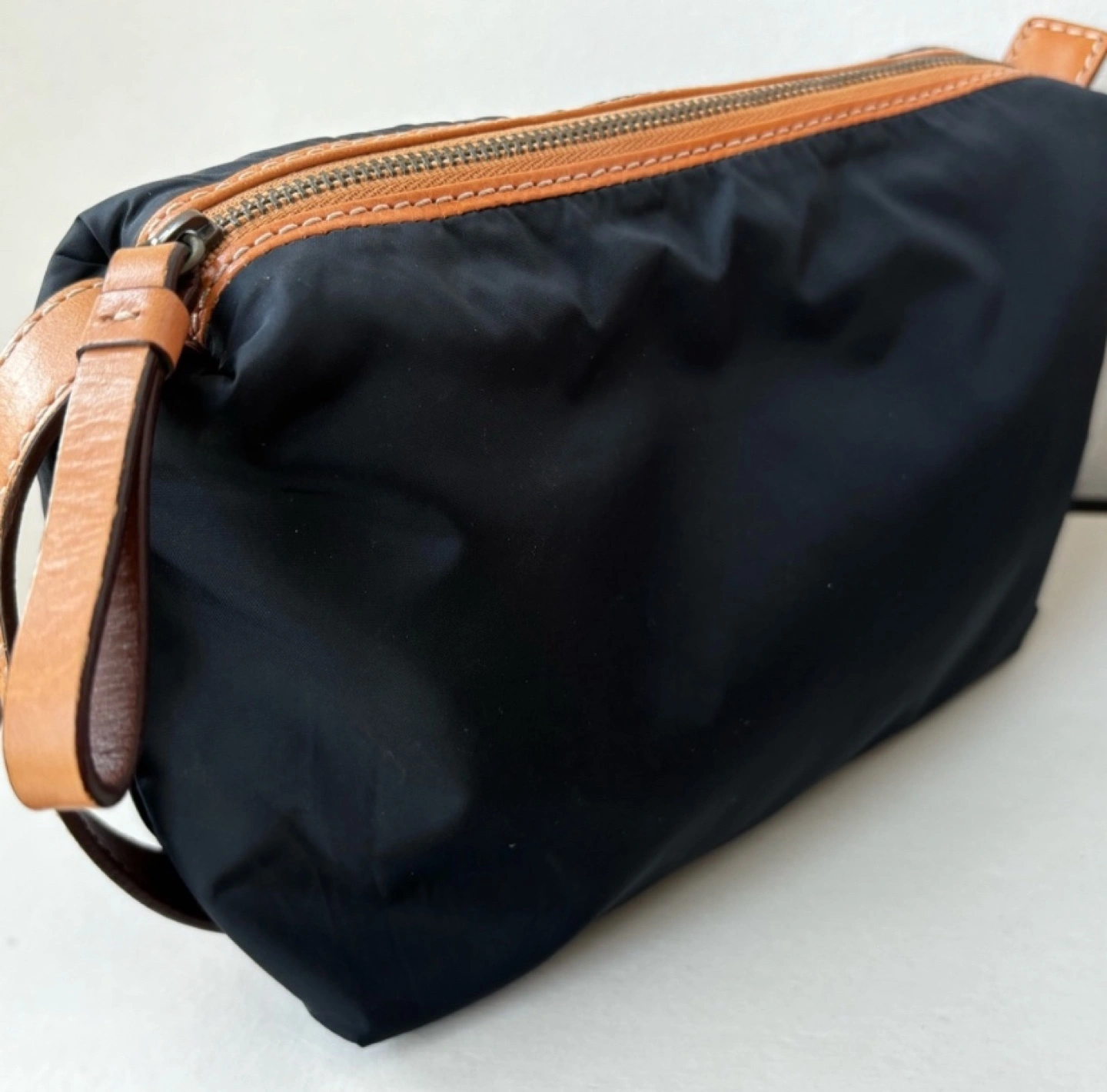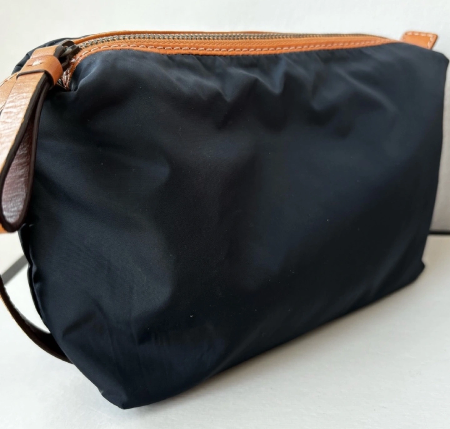 Small black nylon travel case. Brown leather accents. Zipper closure. Perfect for toiletries or small items.