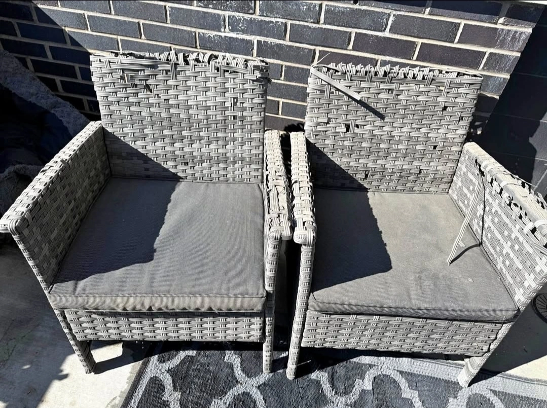 Two grey wicker patio chairs available for FREE! They have some wear and tear, and the wicker could use a little TLC – perfect for someone handy or looking for a quick upcycle project.