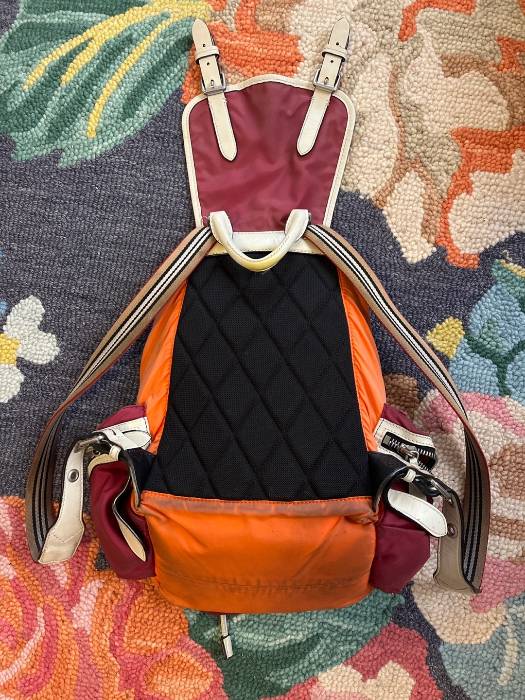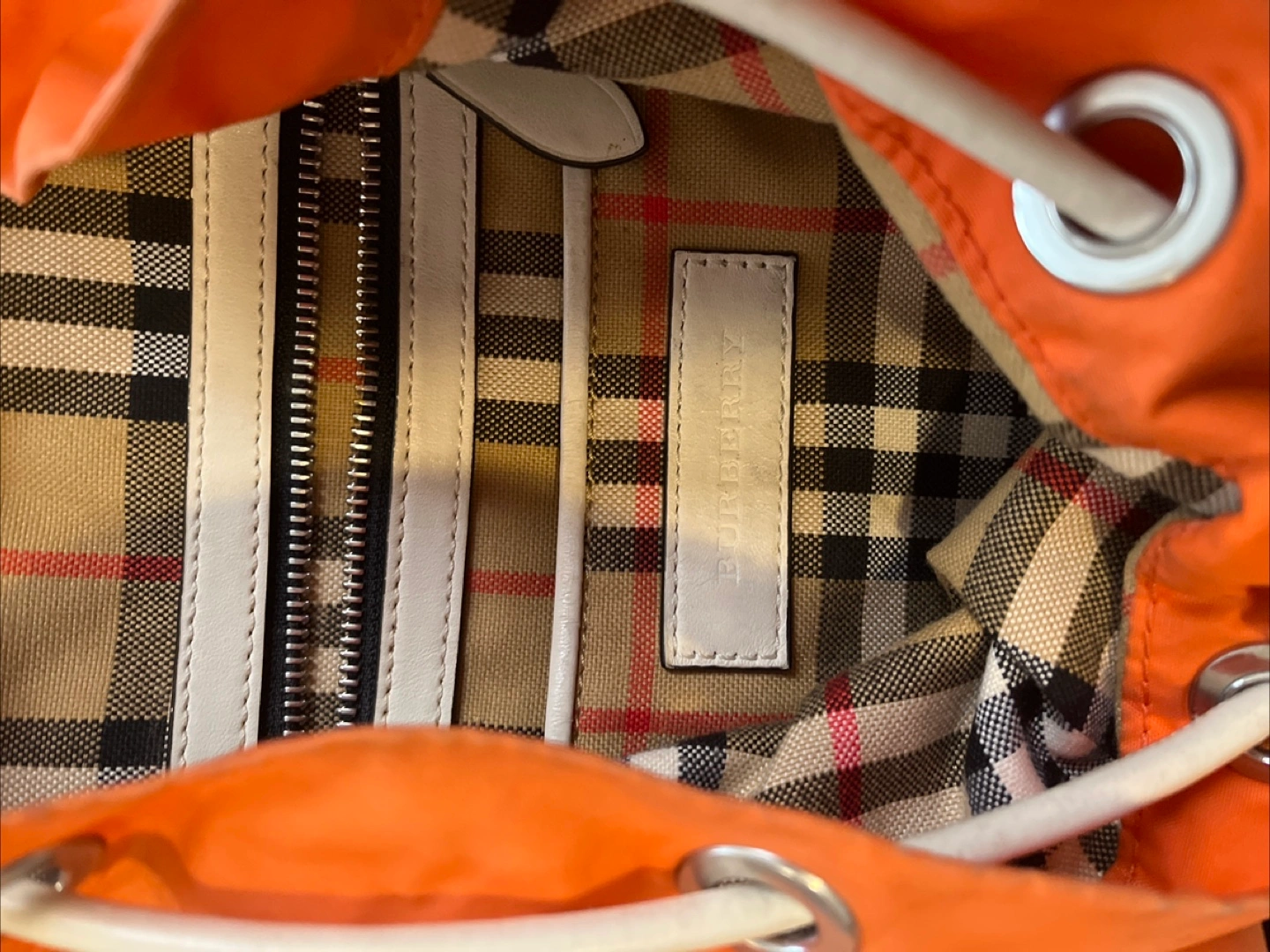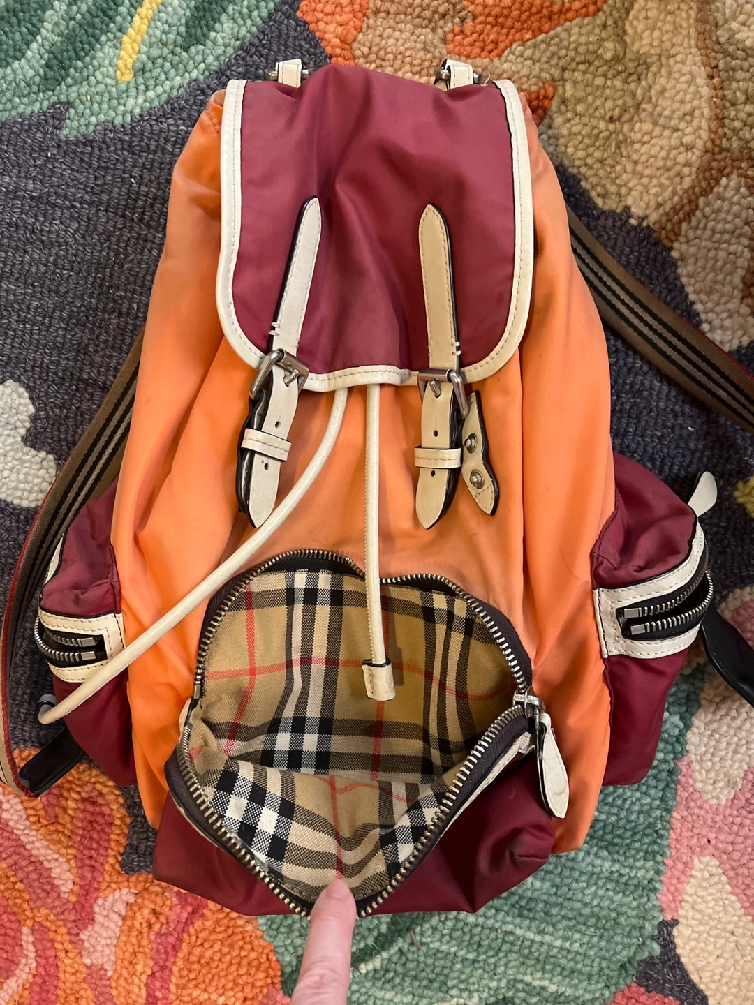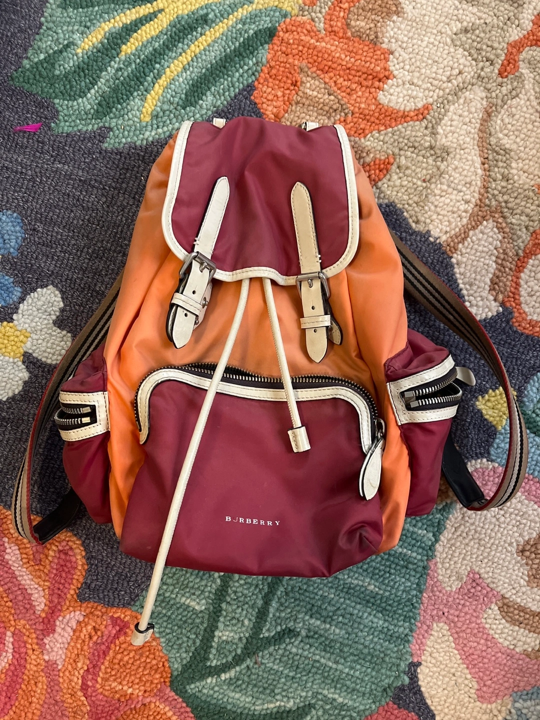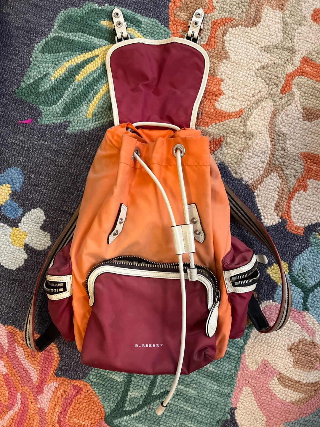 Pre-owned Burberry backpack. Features two-toned nylon fabric in orange and burgundy. White leather trim accents. Drawstring closure and adjustable shoulder straps. Multiple zippered compartments. Nova check lining.