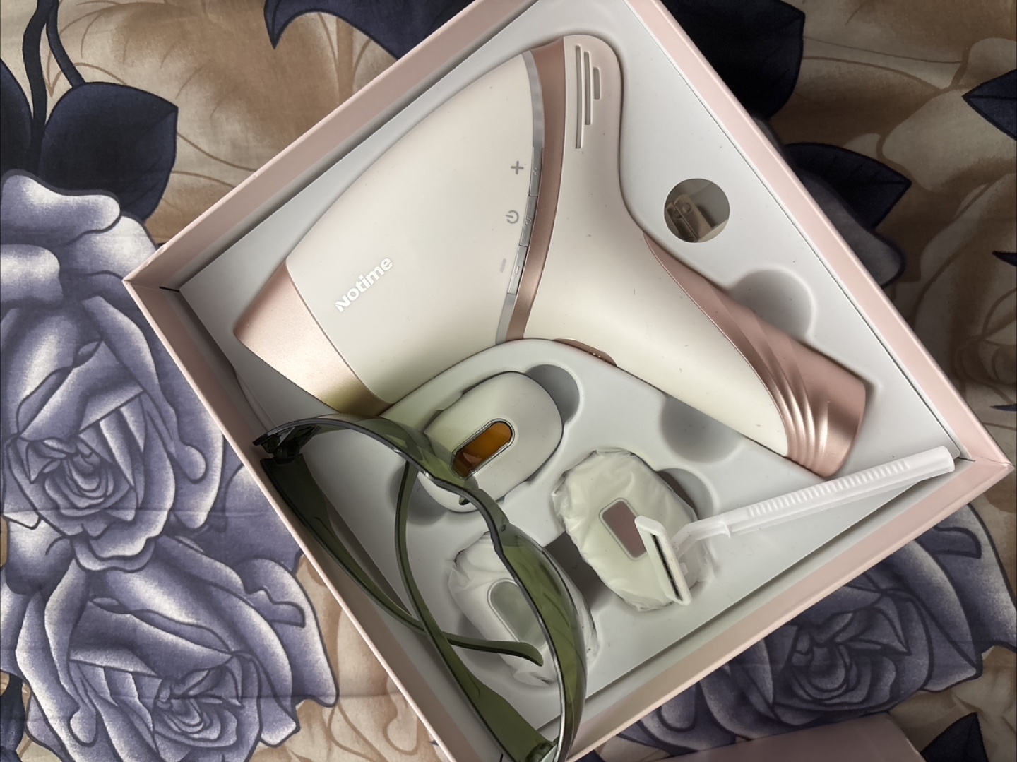 New, unopened Notime IPL hair removal device. Includes safety glasses and extra attachments. Rose gold and white colour scheme. Ideal for at-home hair removal.