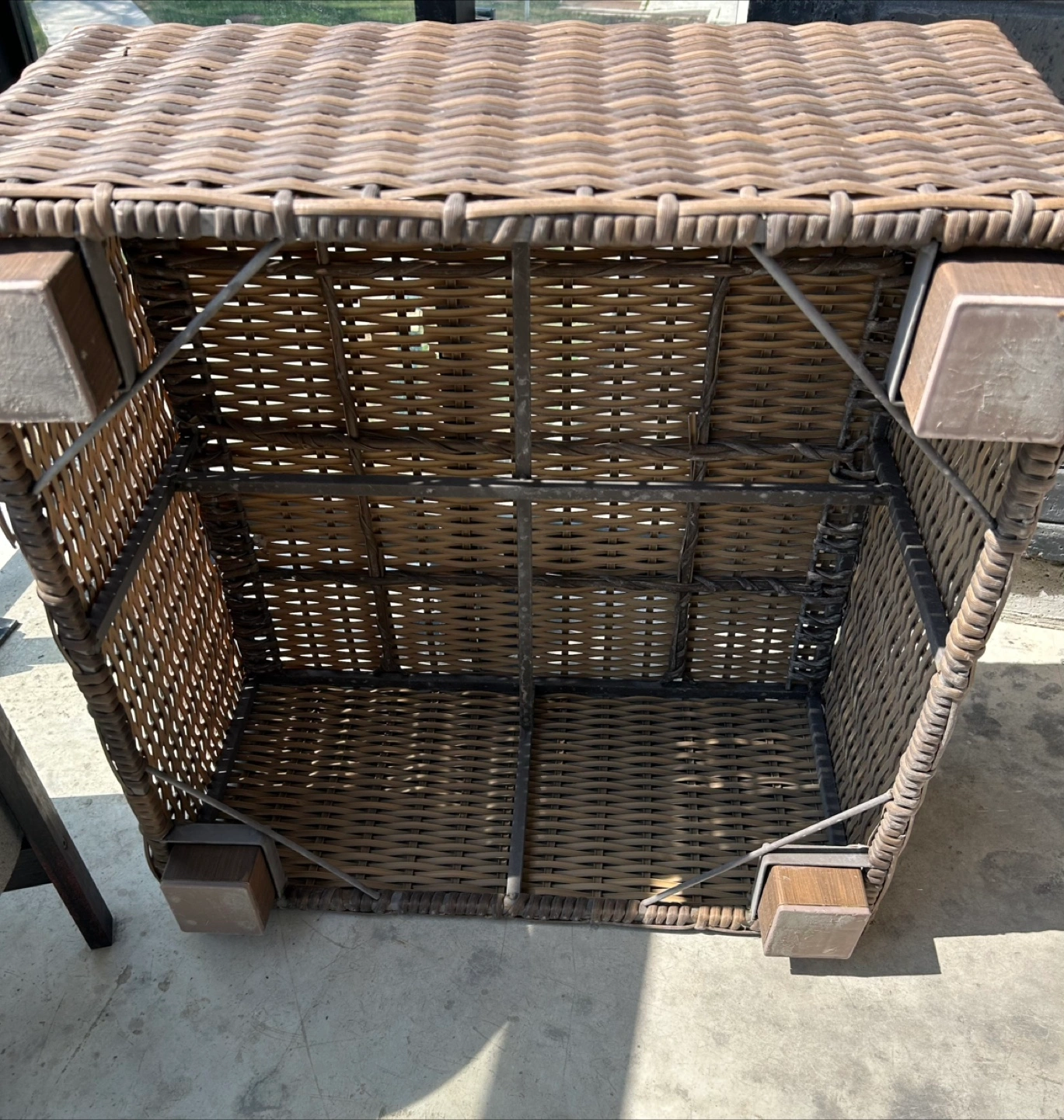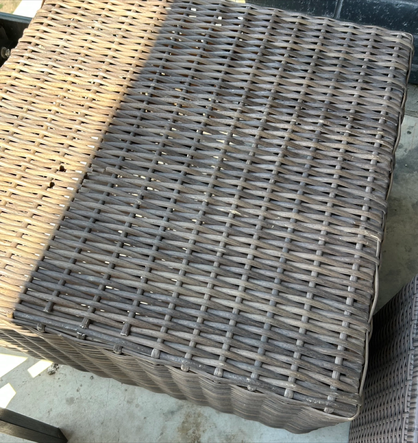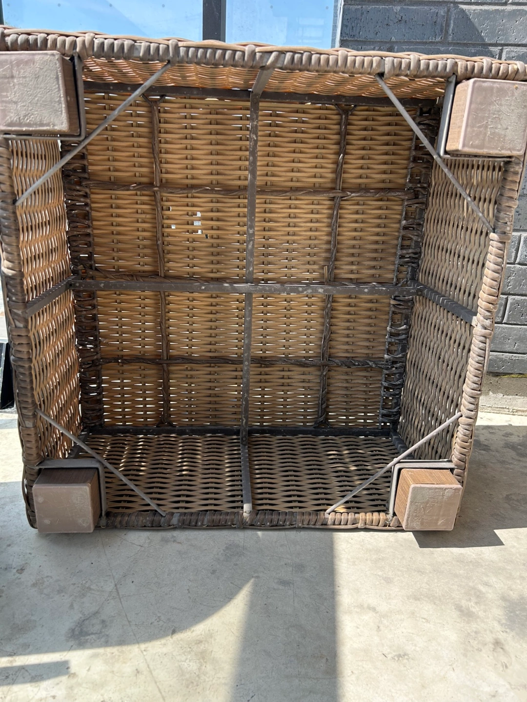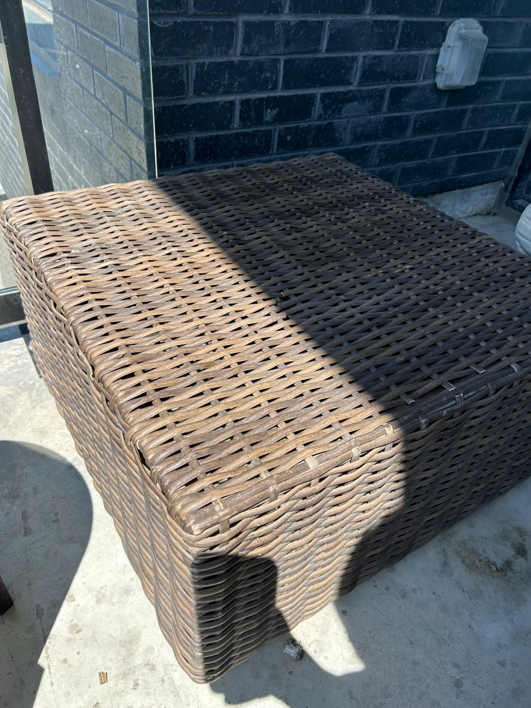 Square outdoor ottoman. Brown wicker. Solid construction, heavy duty, strong and sturdy. Perfect for patio or balcony.