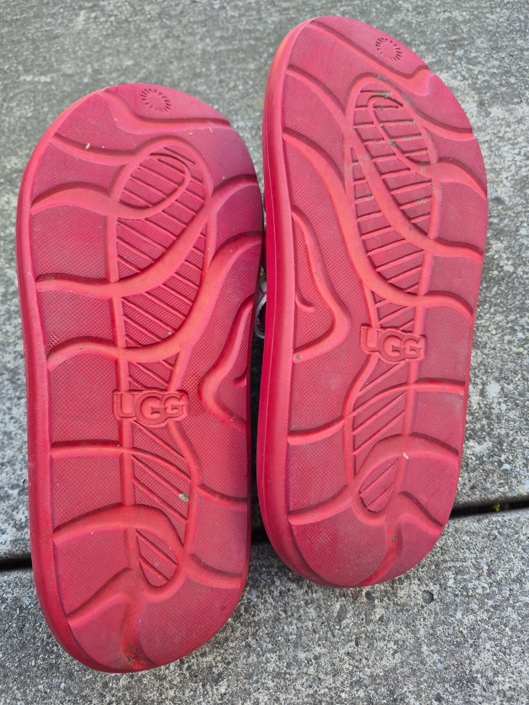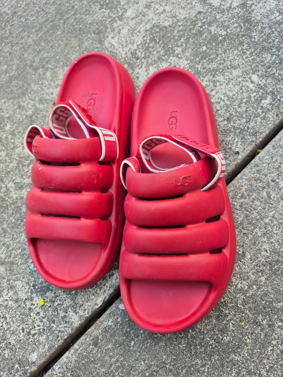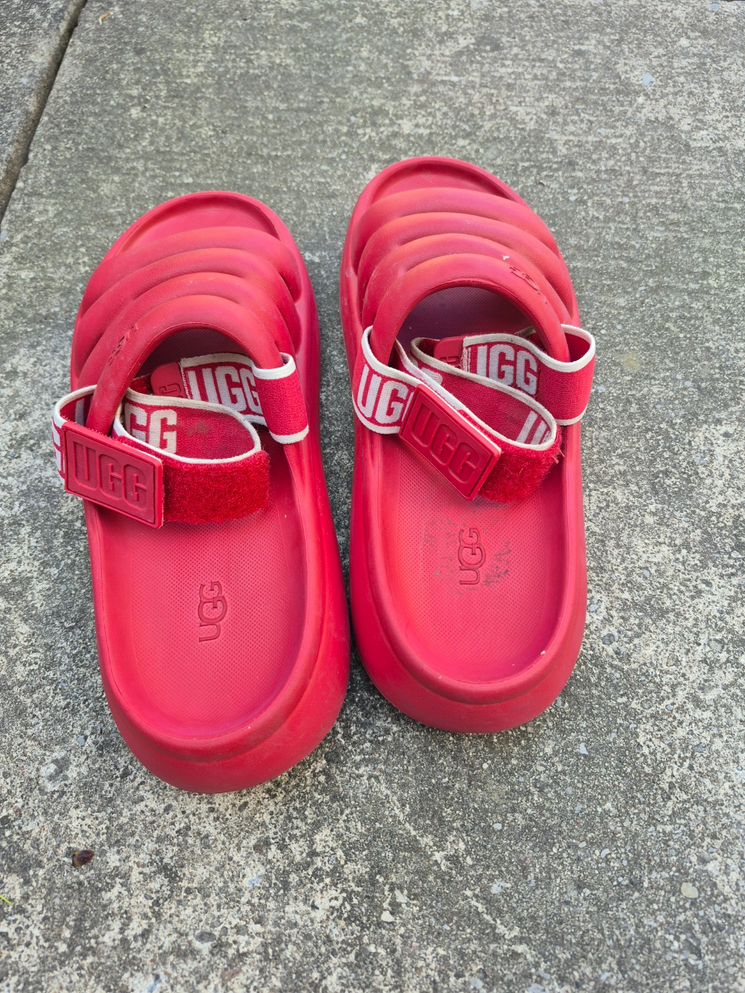 Red UGG slides. Platform sole. Adjustable straps. Comfortable summer footwear. Wore only twice. Too small that is why selling. Bought from Nordstrom Good for Spring, Summer and Autumn.