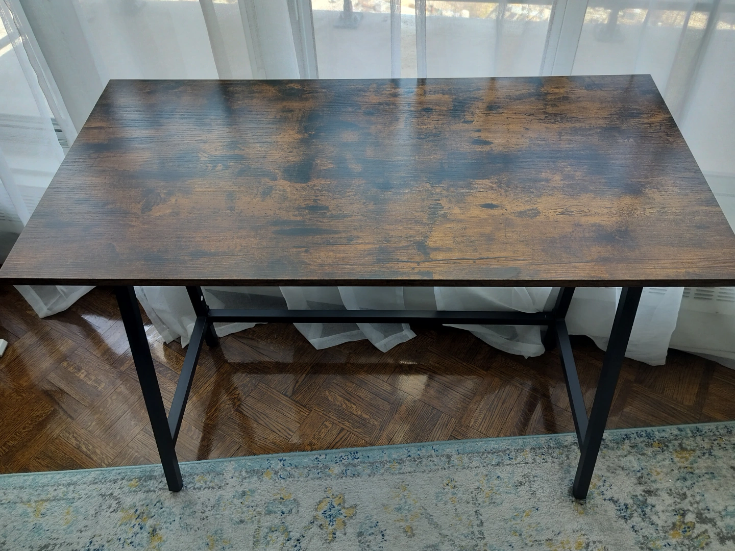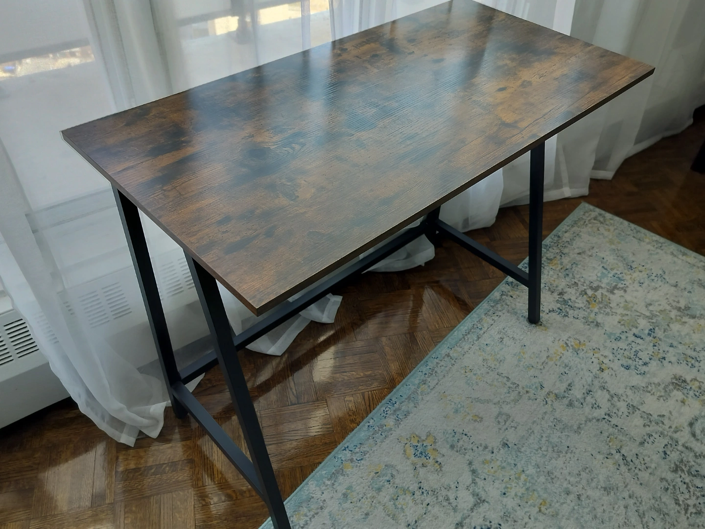 Simple writing desk. Dark brown wood-look top. Sleek black metal frame. Perfect for small spaces. Minimalist design.