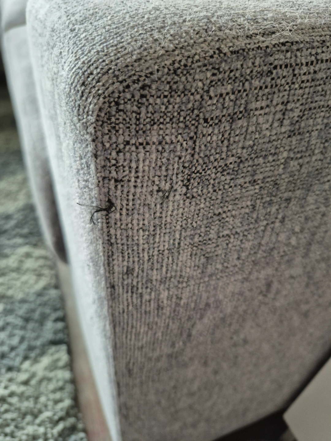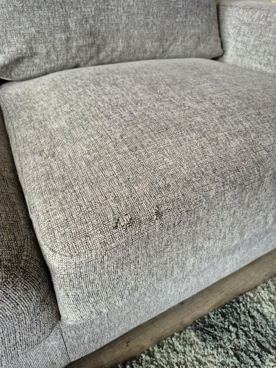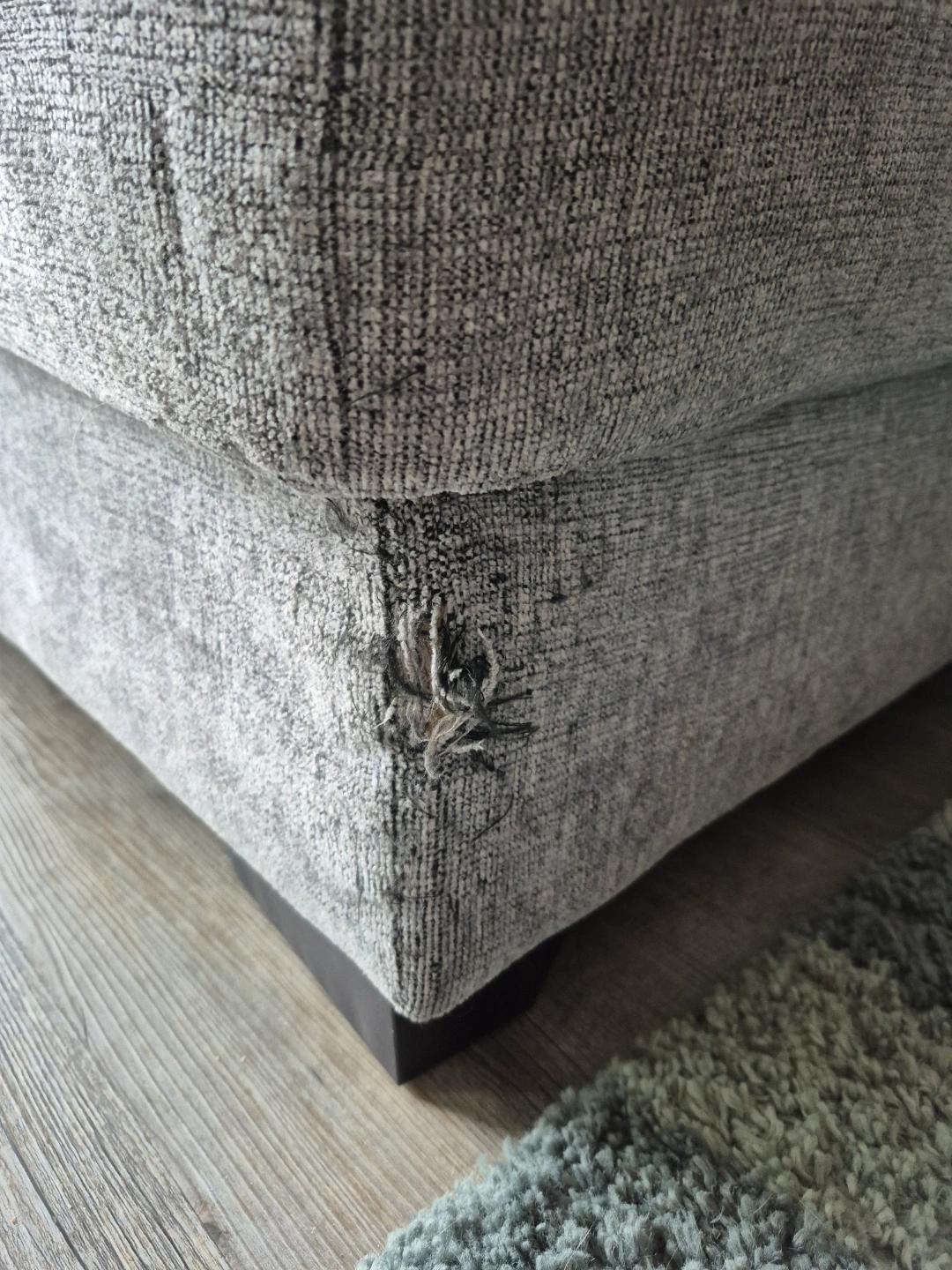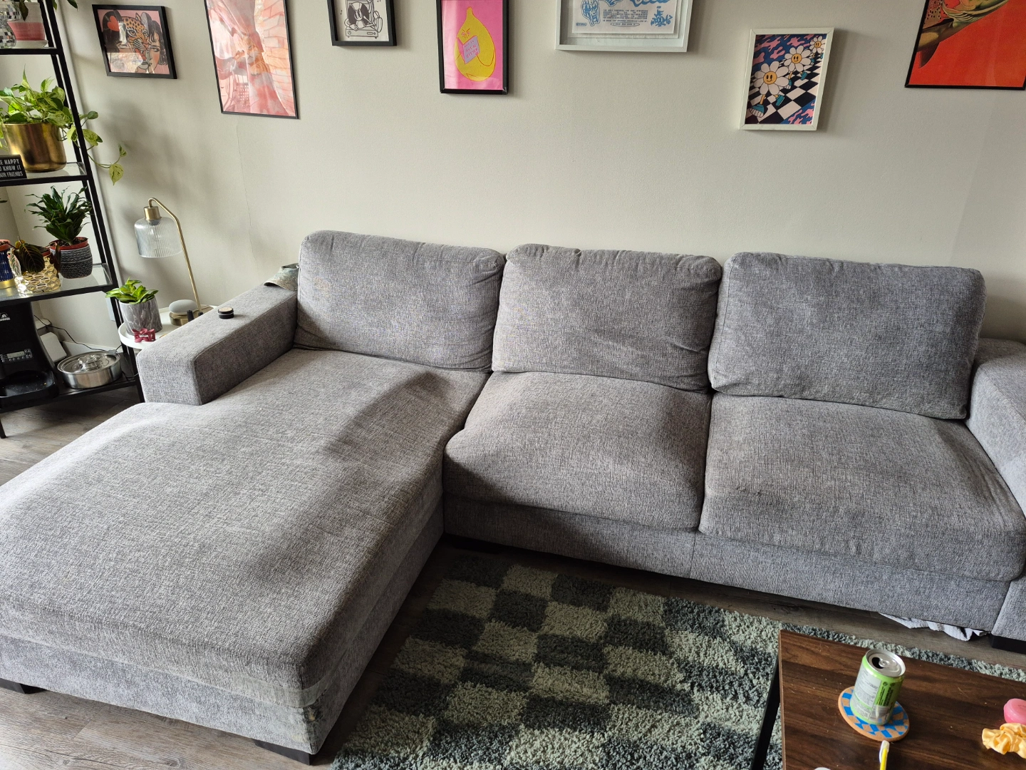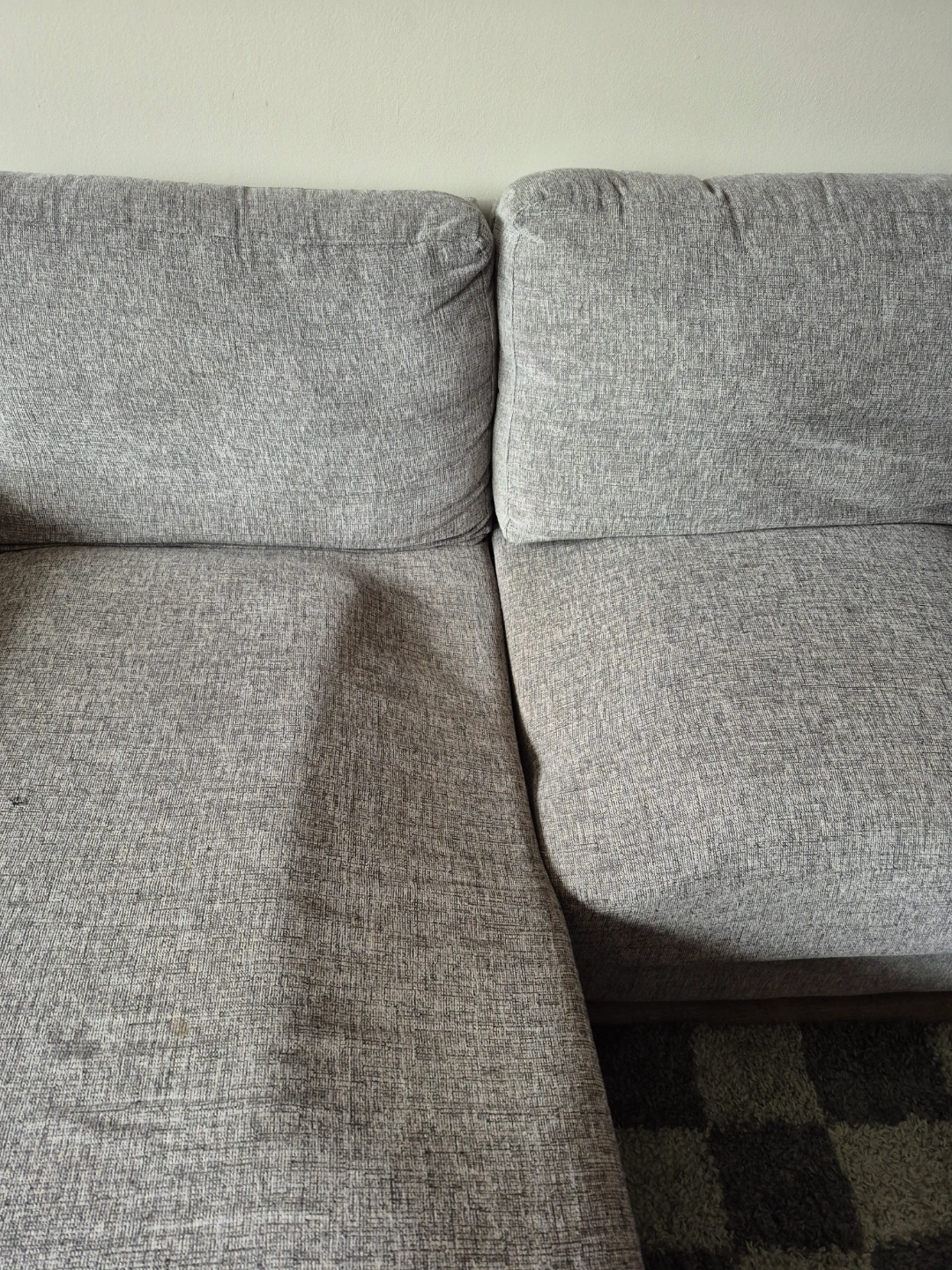Grey fabric sectional sofa from iFurniture. It’s in good condition with some minor wear and tear from a pet-friendly home. The chaise has an indent that was there from the time of purchase. I’ve recently washed all the back cushion covers. Includes chaise lounge measuring 62" x 38". Very comfortable and spacious seating!