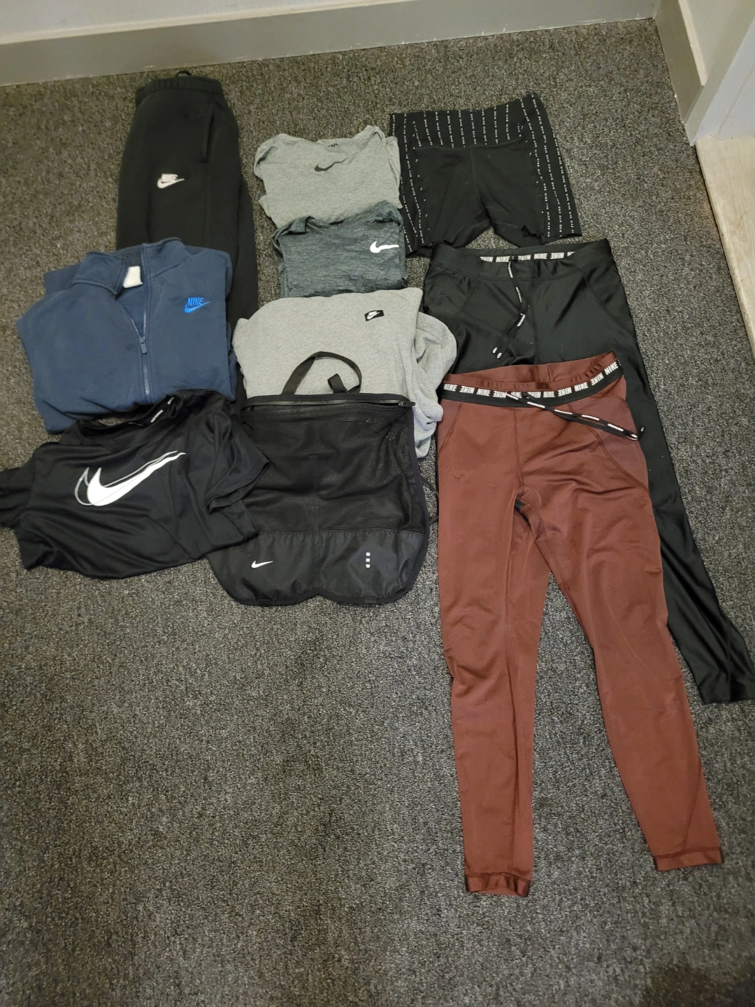 Bundle of Nike clothing. Includes tops, Sweaters, bottoms, and a small bag. Various colours and styles. Good for working out or casual wear.