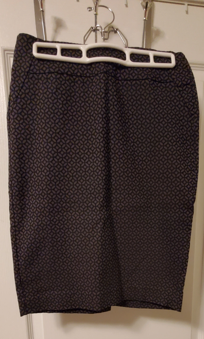Dark grey pencil skirt. Geometric pattern. Stretchy material. Length falls above knee.