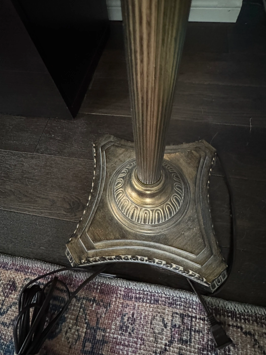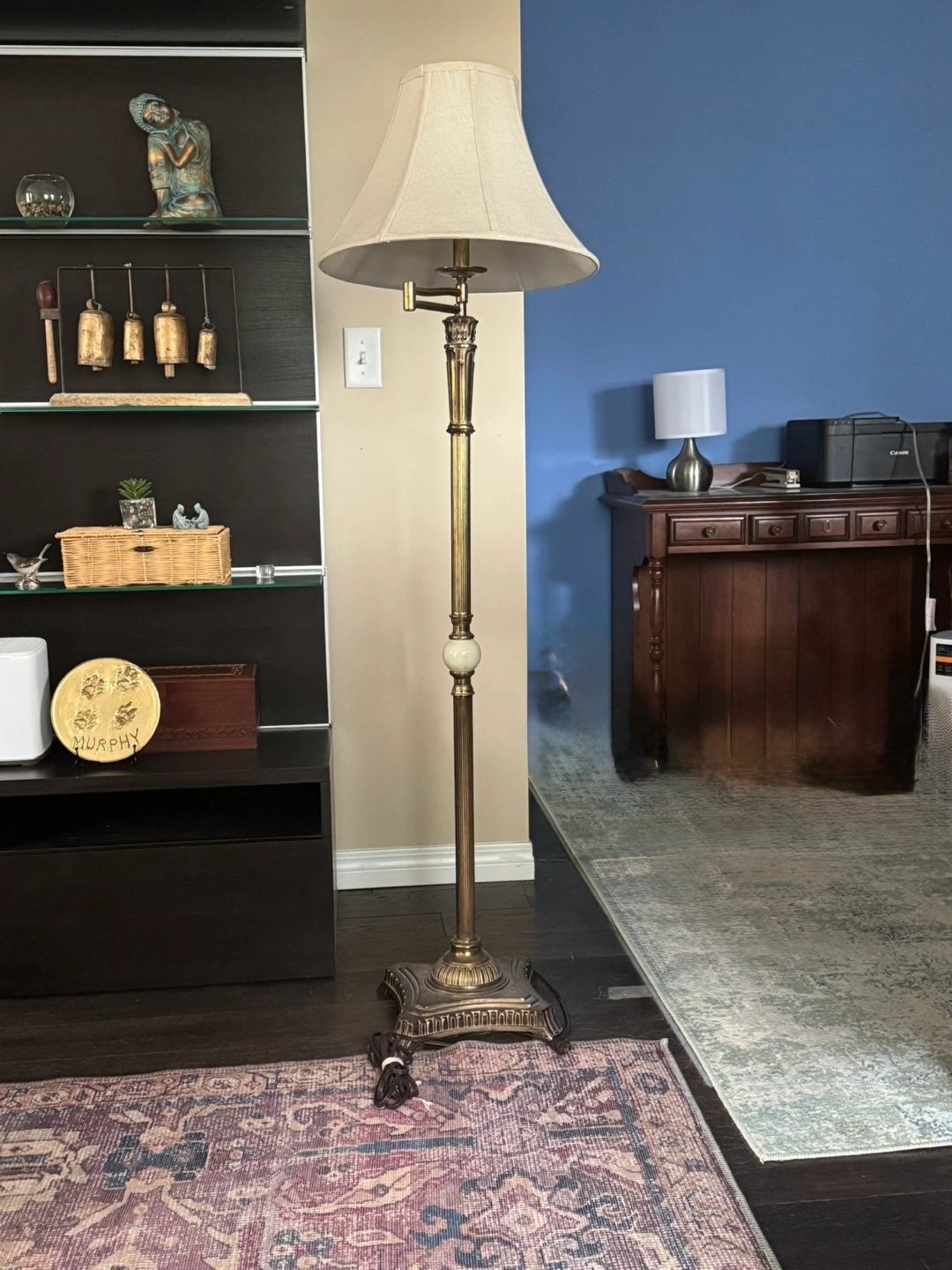 Beautiful floor lamp, gold finish. Features a cream-coloured lampshade. Adjustable arm. Ornate base. Great for living room or bedroom. This item is free because the switch is broken. Maybe someone has the talent to fix it.