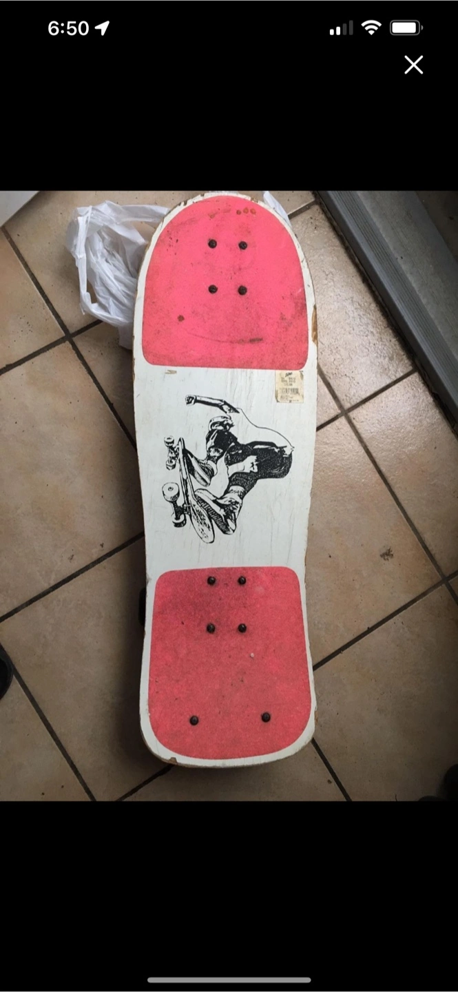Old school cruiser skateboard. Shows wear. Unique graphic design. Great for display or restoration. Includes trucks and wheels.