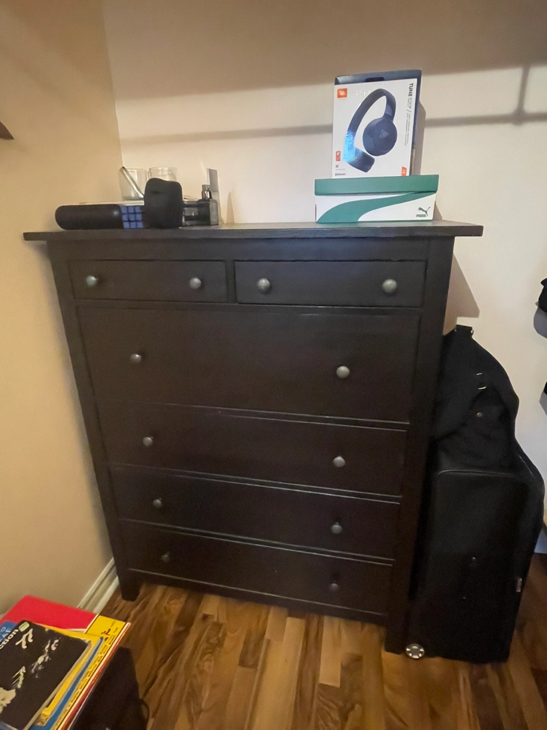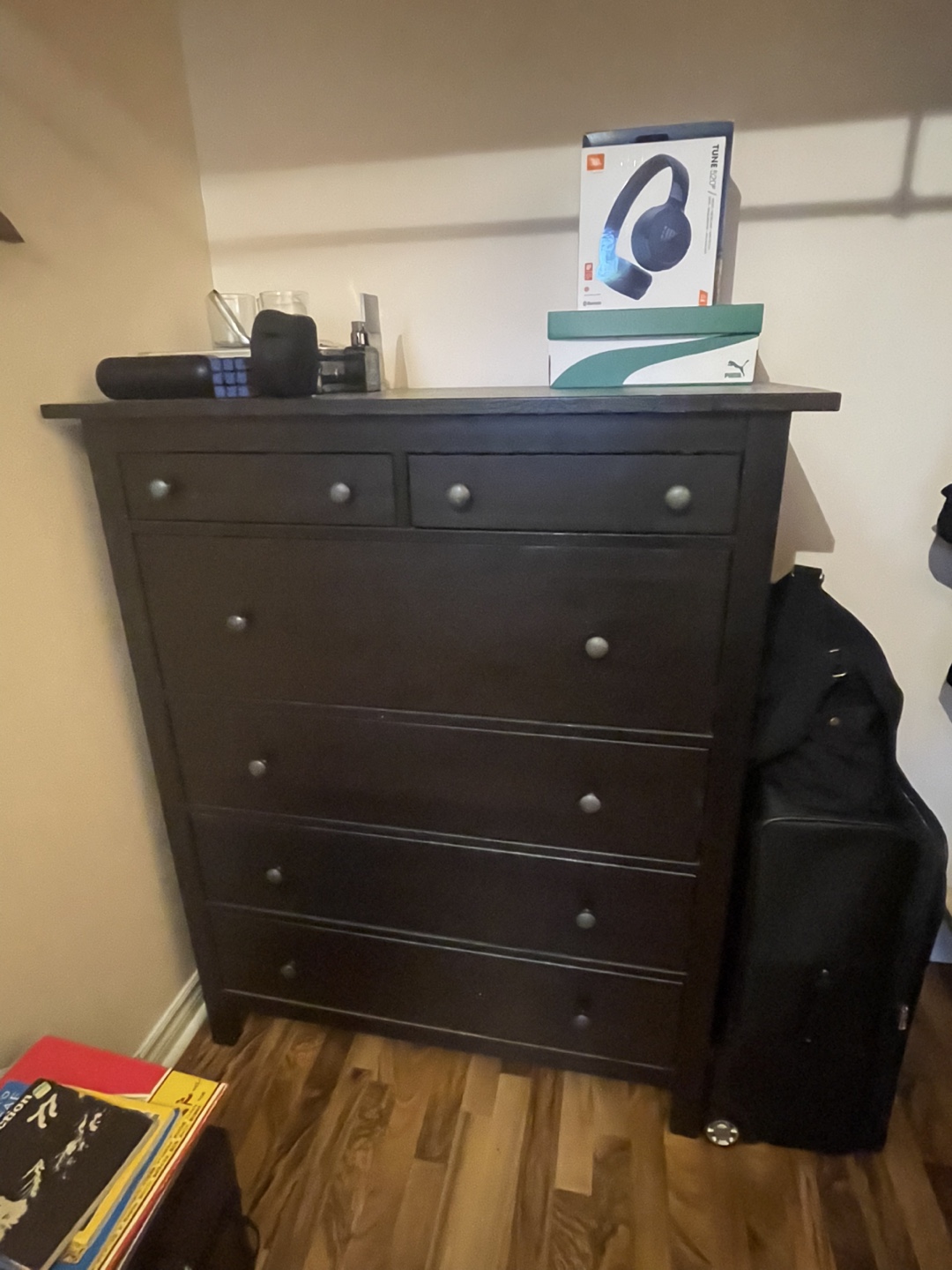 Six-drawer IKEA Hemnes dresser. Dark brown wood. Solid construction. Good storage solution. Minor wear consistent with use.