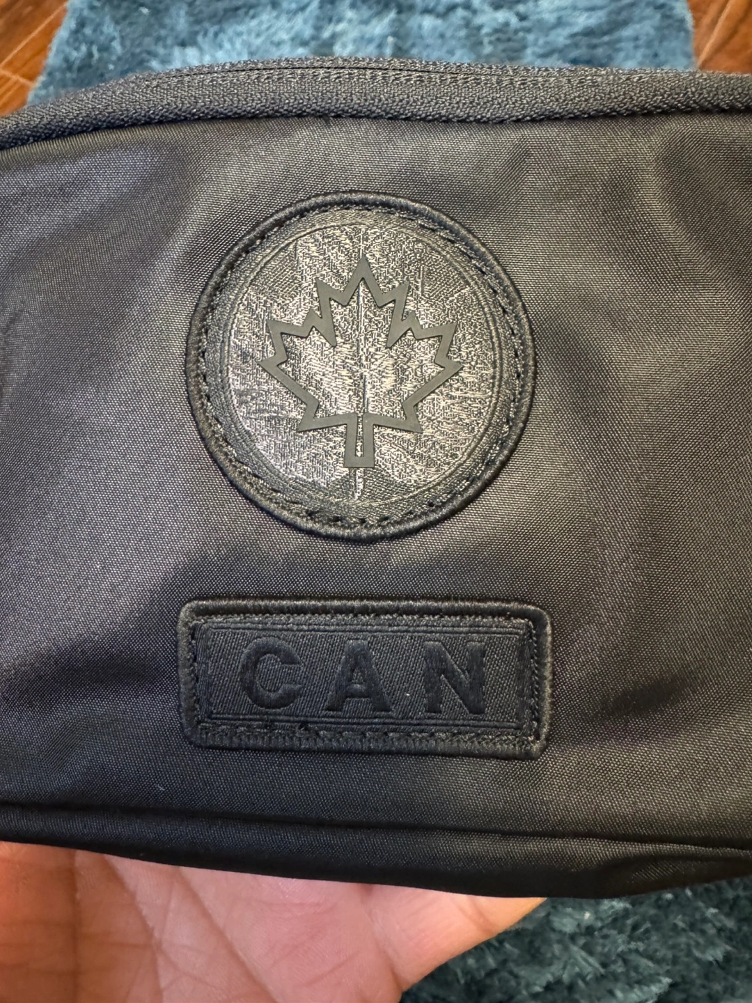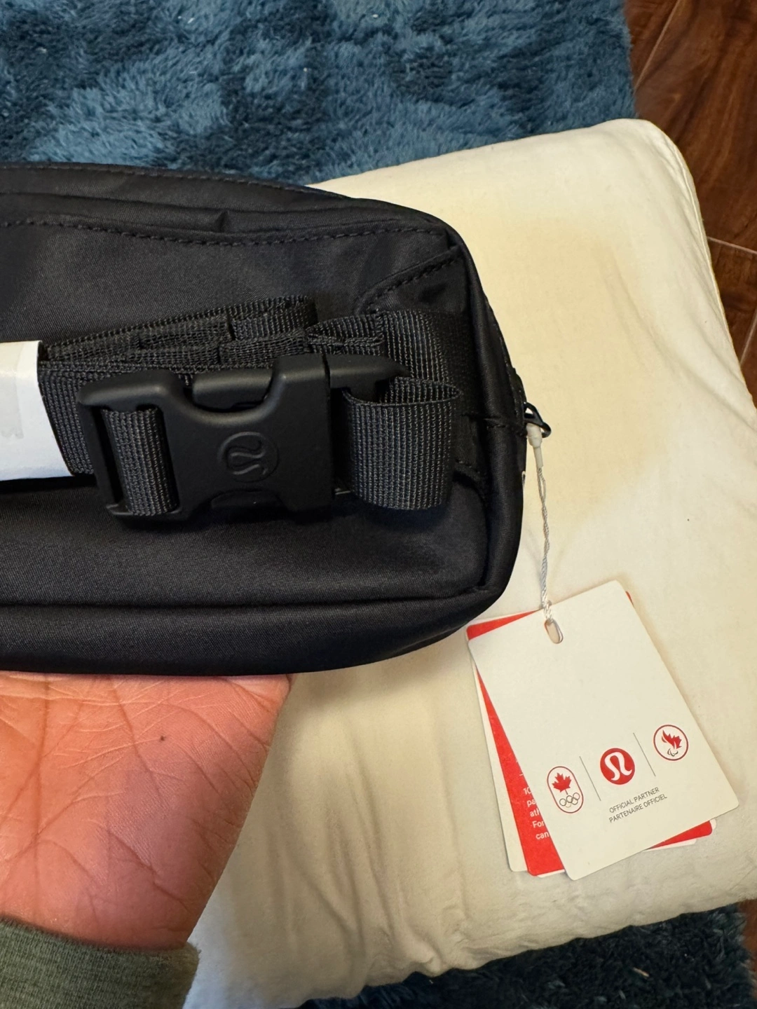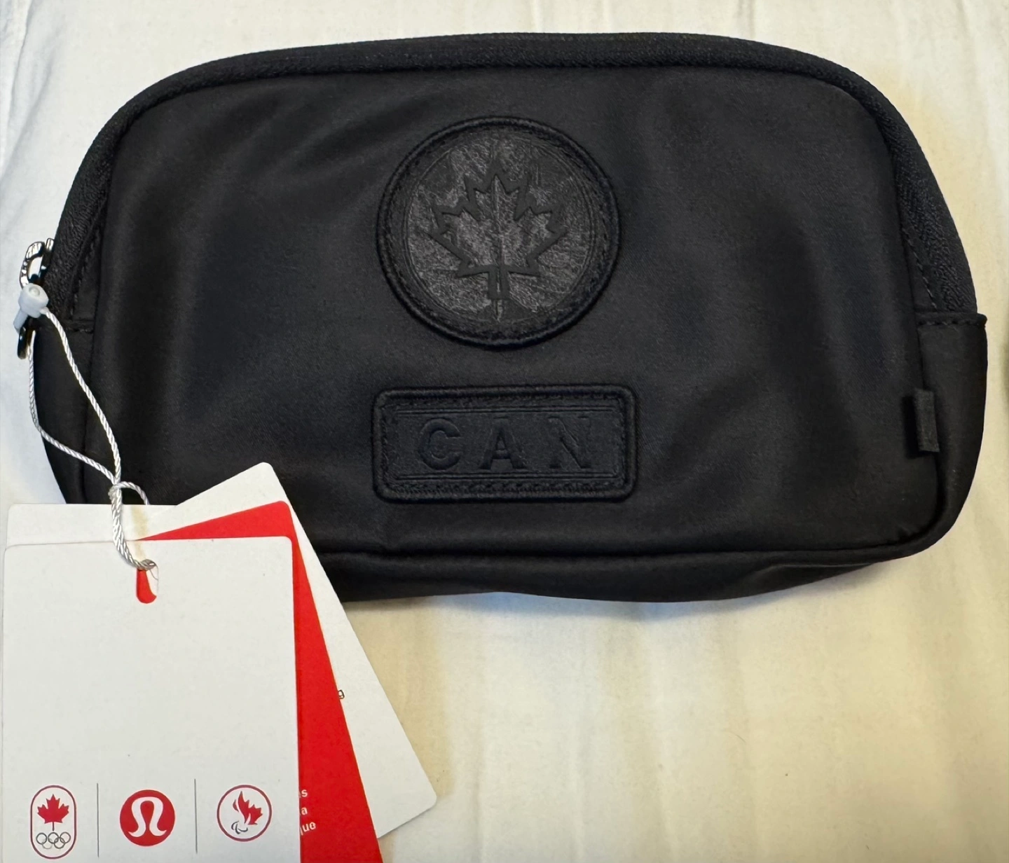 Black belt bag. Adjustable strap. Small interior pocket. Embroidered Canadian Olympic Team logo. New with tags.