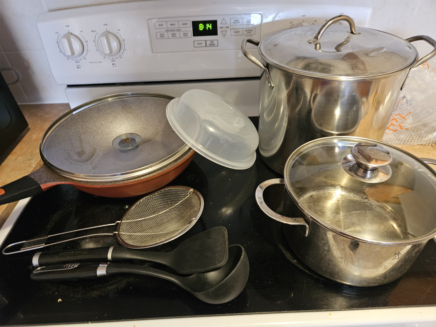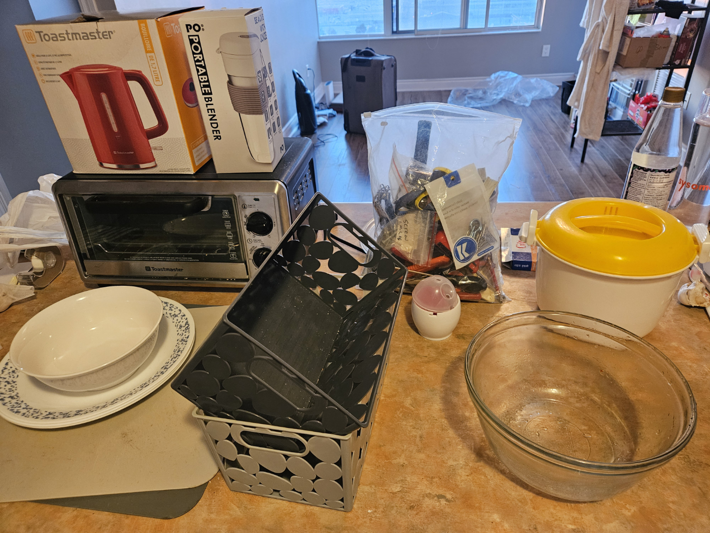 - Large kitchen bundle. Includes stainless steel pots with lids, non-stick wok with lid, silicone and metal utensils, and a Toastmaster toaster oven and kettle.