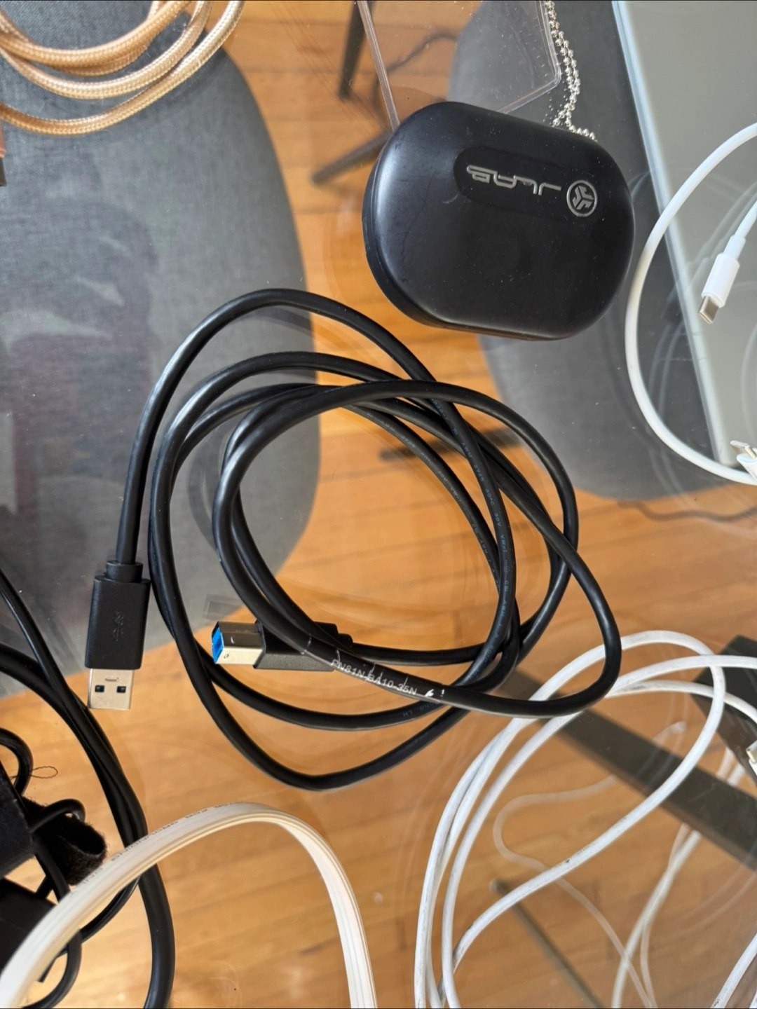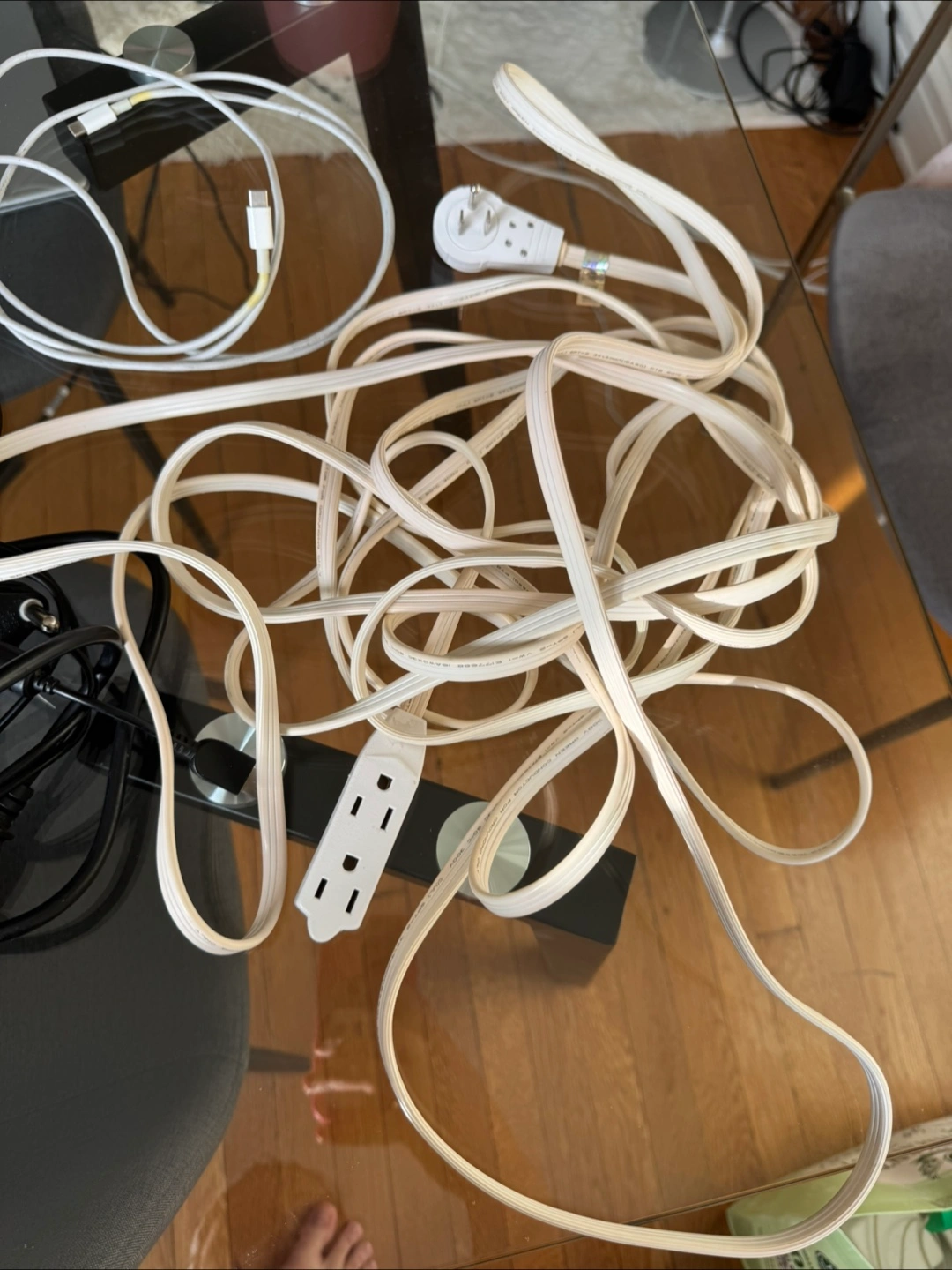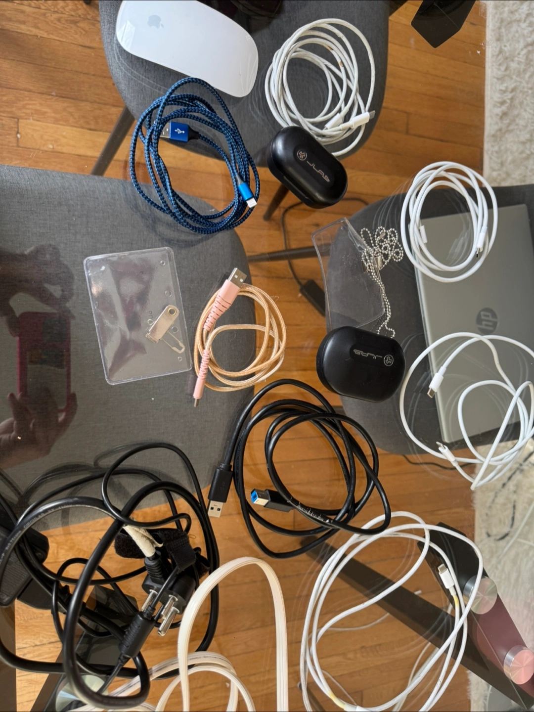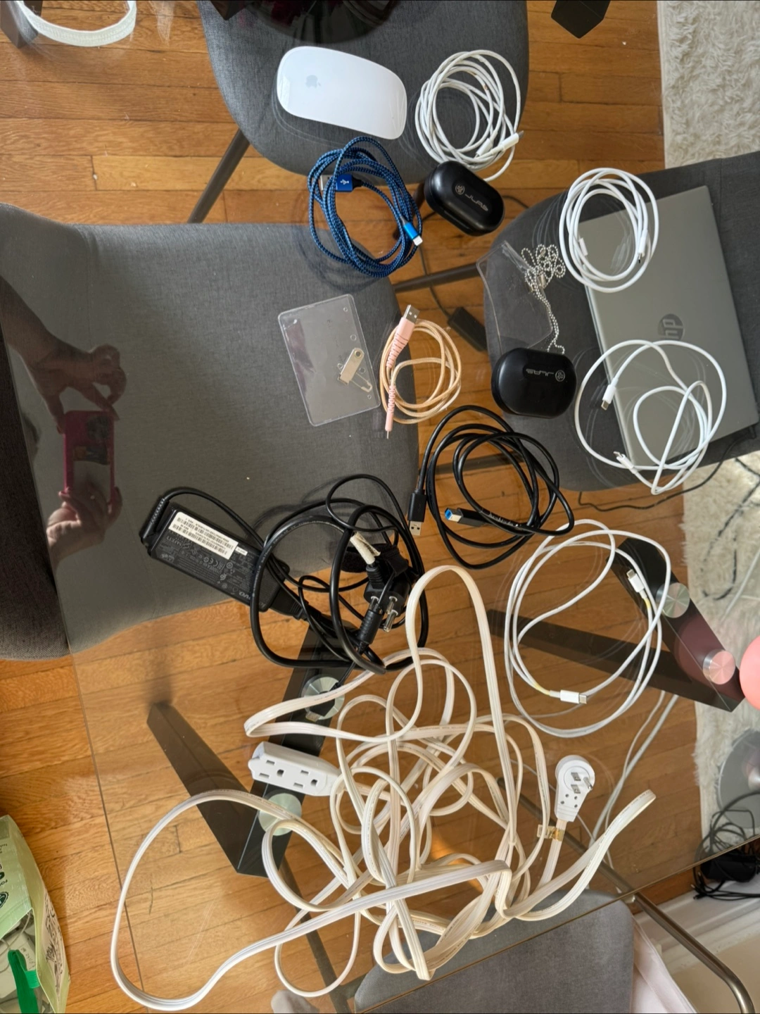 Bundle includes various cables, power adapters, and power strips. USB cables, charging cables, and extension cords. Some items show minor wear.