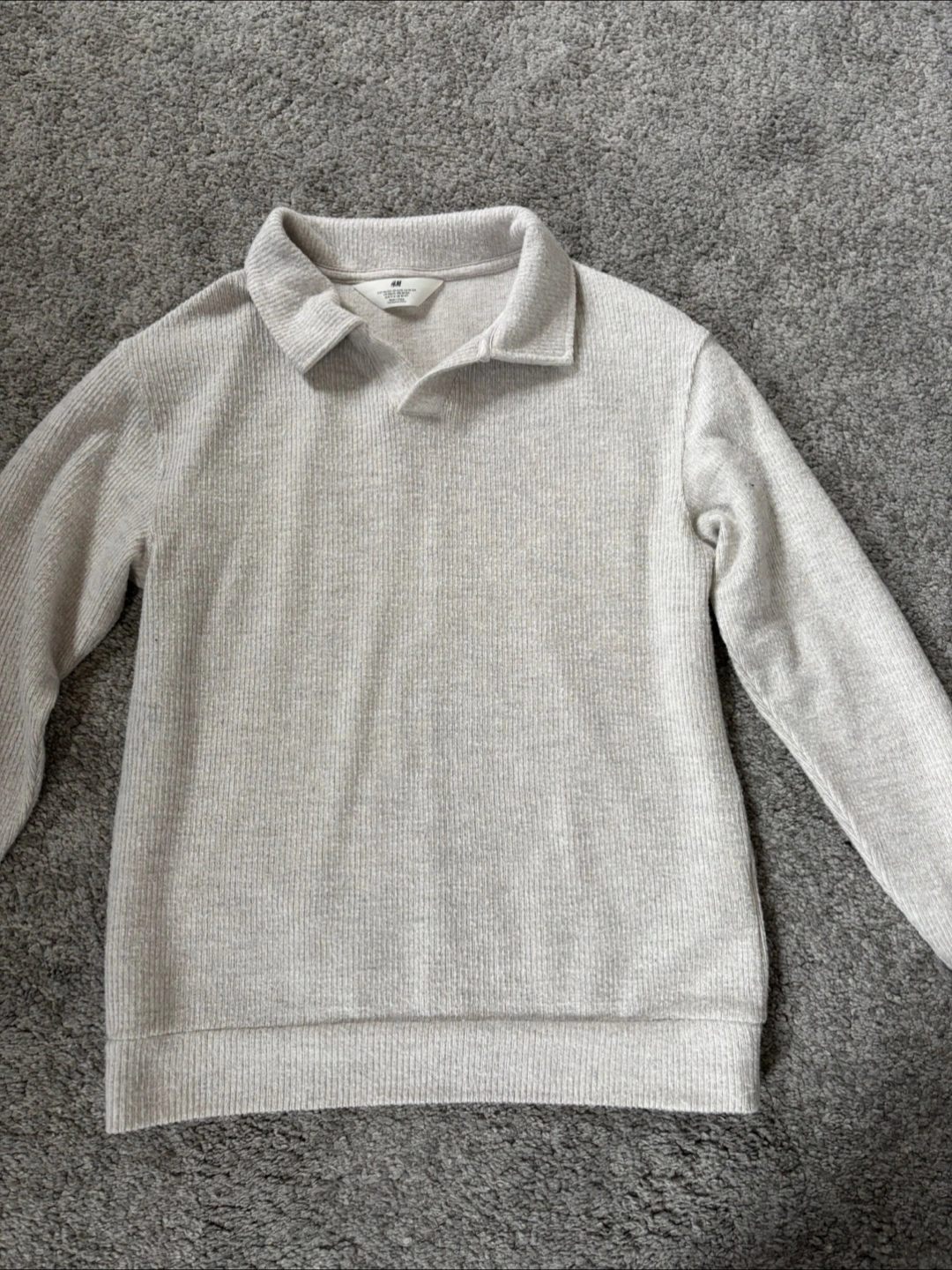 Light beige ribbed knit collared sweater. Long sleeves. Size 12-14. Good condition.