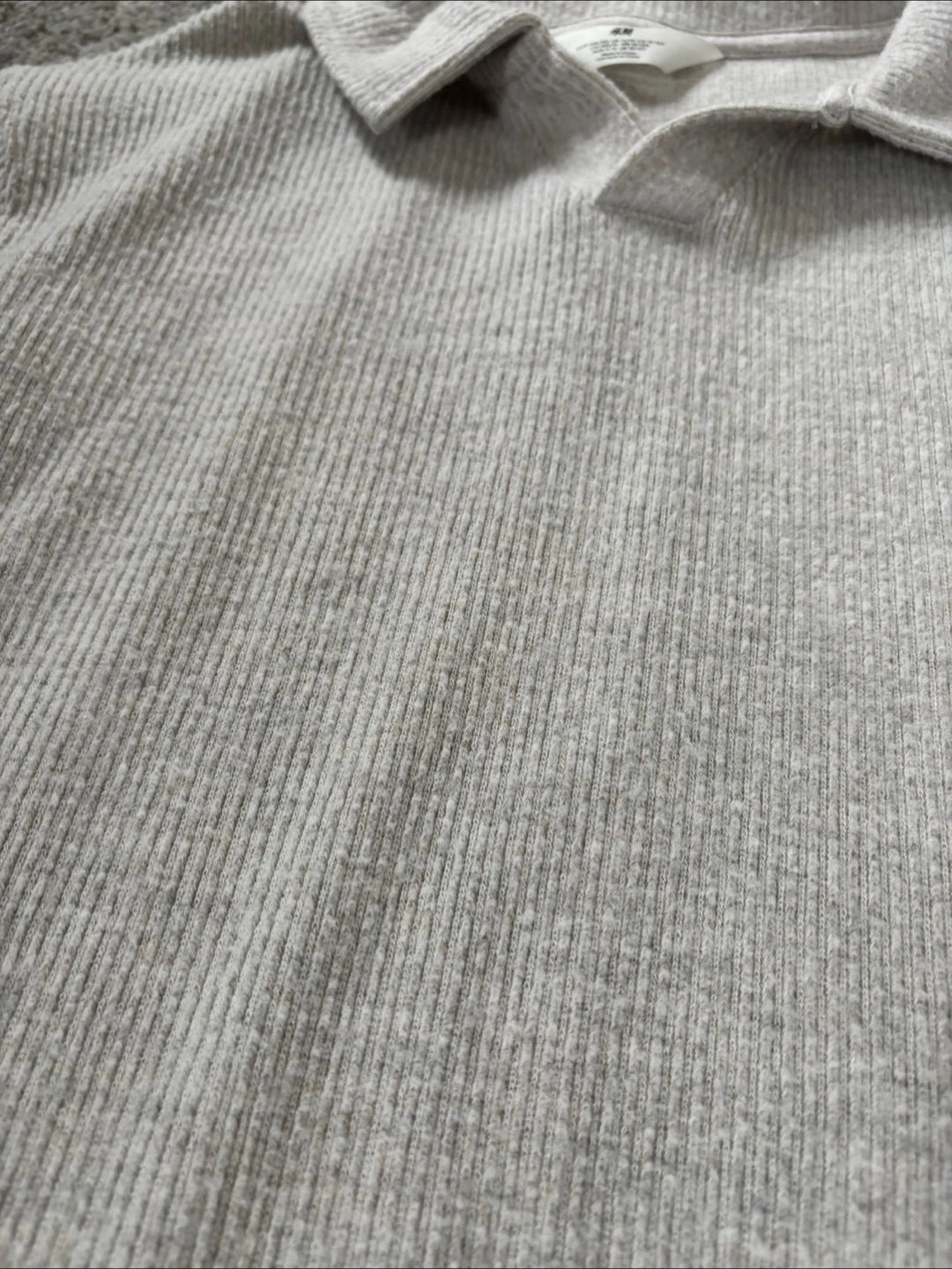 Light beige ribbed knit collared sweater. Long sleeves. Size 12-14. Good condition.