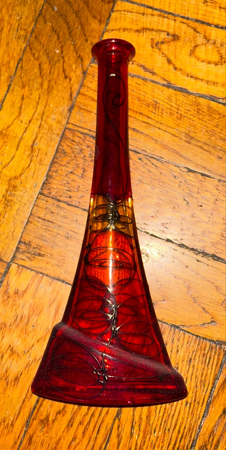1000+Beautiful small red glass vase perfect for a few buds or just to look pretty on a shelf. Features black painted designs. 9 1/2” tall. Unique shape and style. Located on the upper West side, 83rd St. and Broadway.