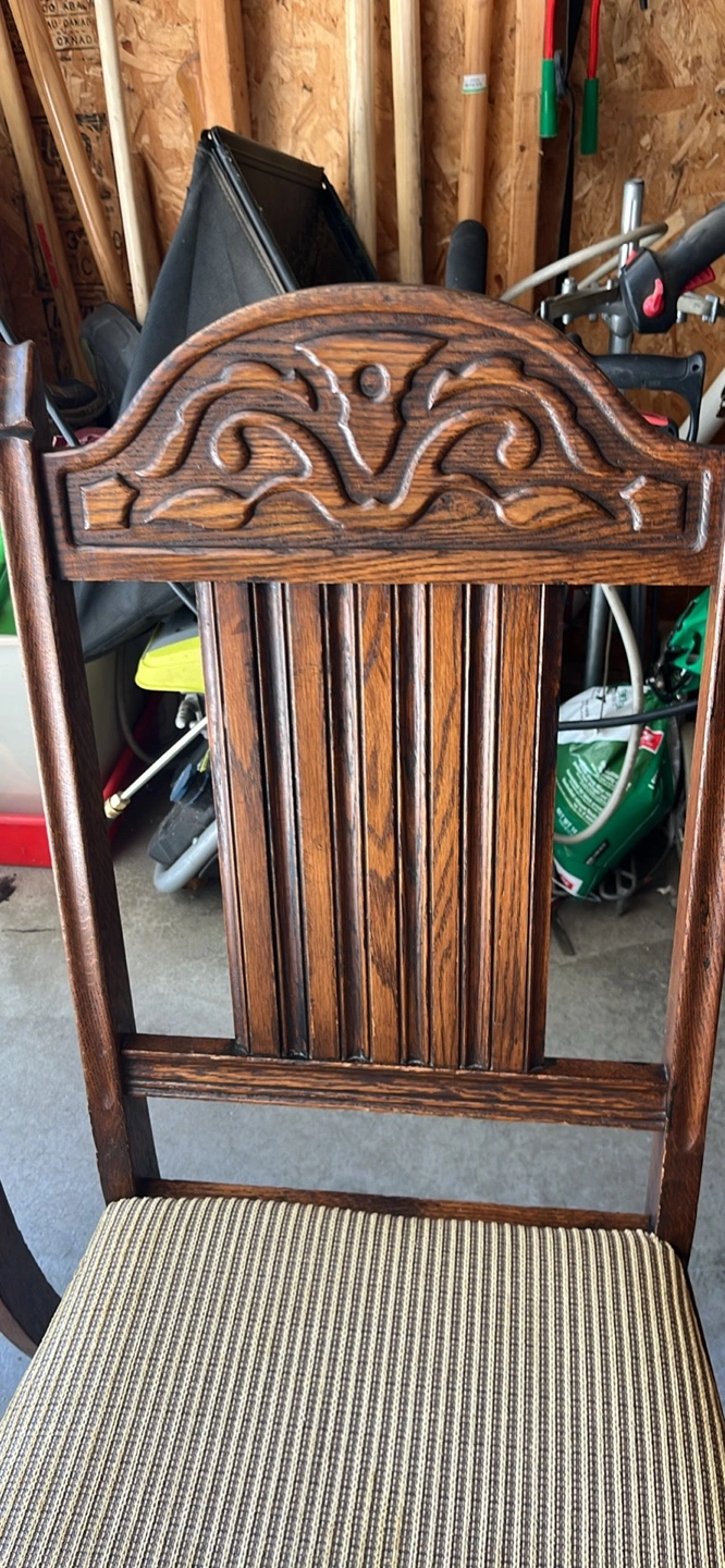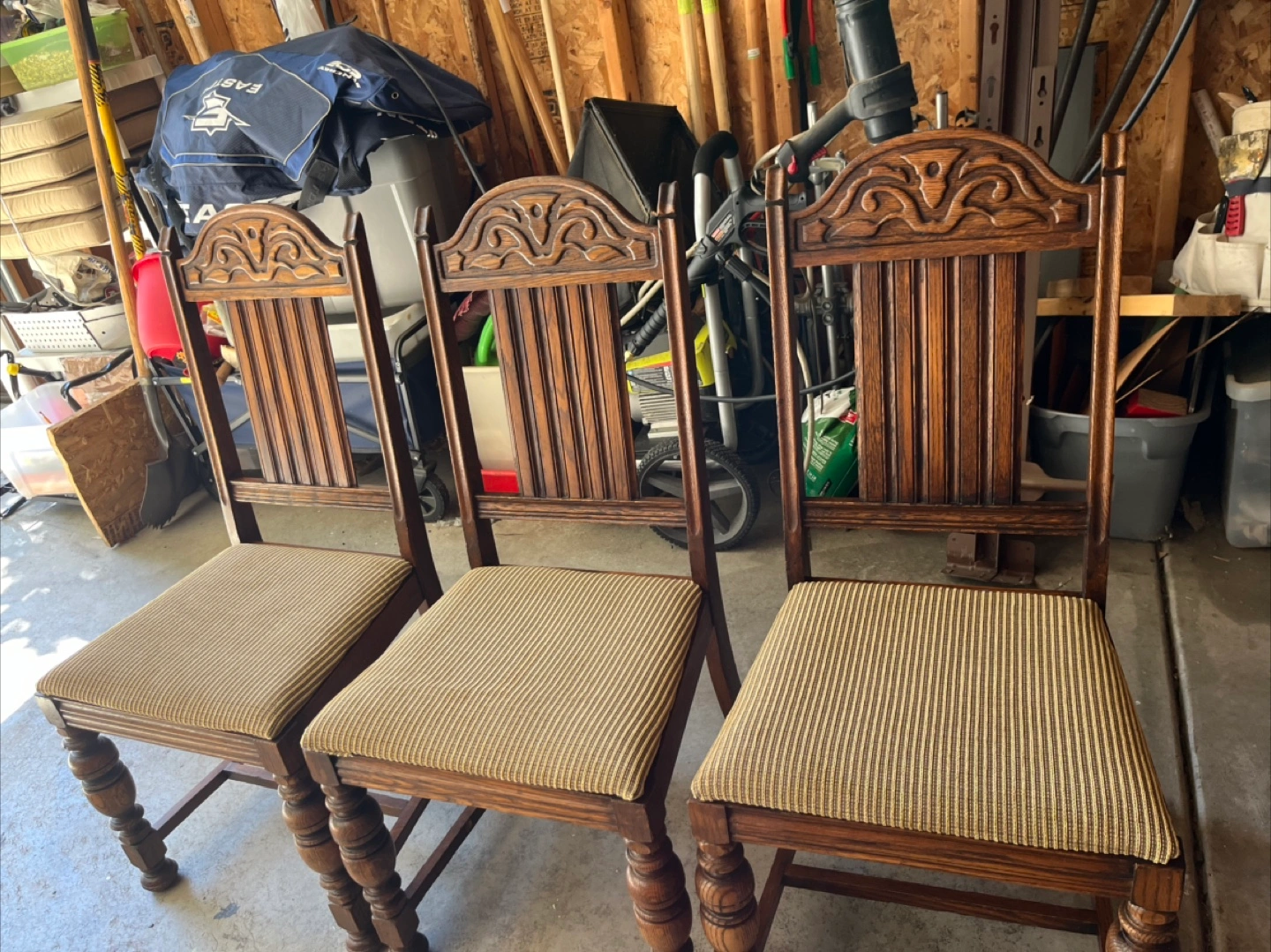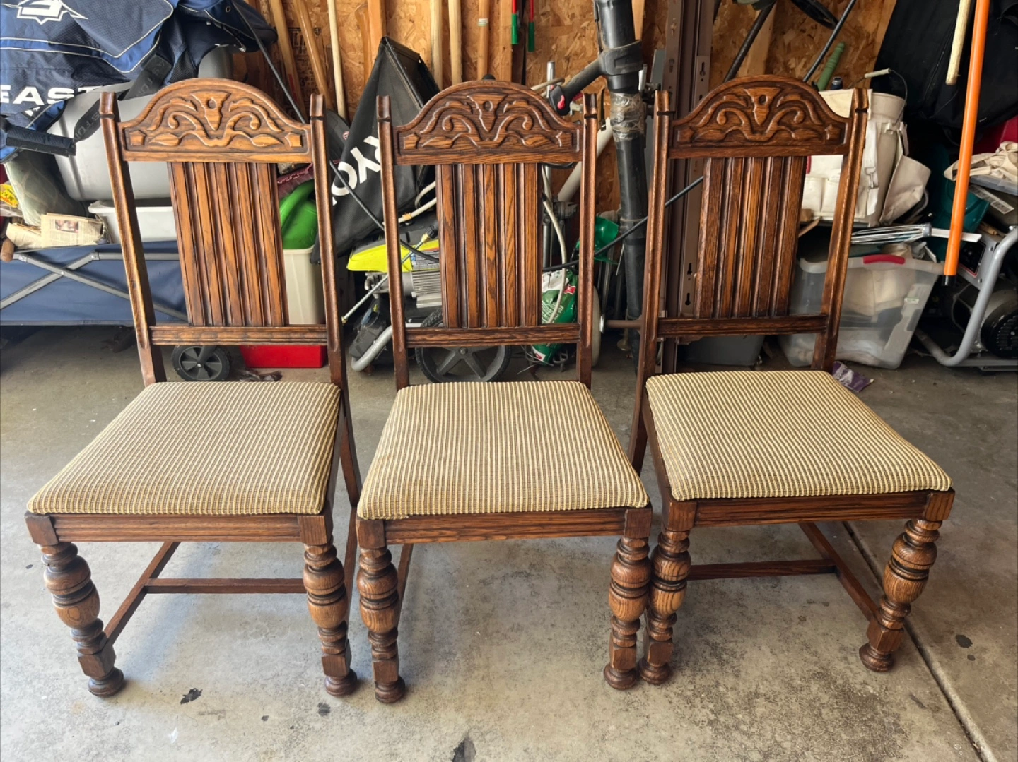 Three vintage wooden dining chairs. Dark brown wood finish. Intricate carvings on chair backs. Beige and brown striped fabric seats. Turned legs. Beautiful wood feature