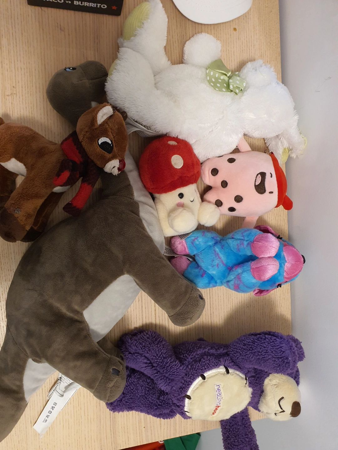 Collection of seven stuffed animals. Includes a reindeer, a white plush animal, a mushroom, a pink character, a blue plush animal, a brown plush animal, and a purple bear. Various sizes and styles.