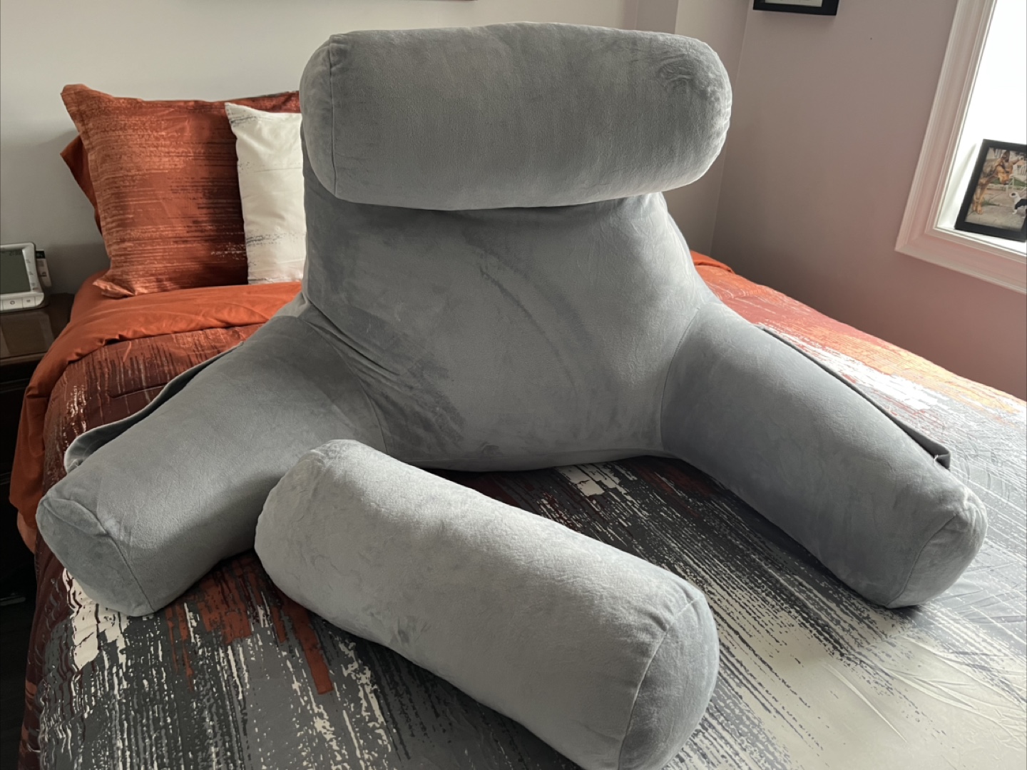 X large Soft grey reading / rest pillow. Includes a headrest and two side bolsters. Features convenient pockets. Perfect for reading in bed.