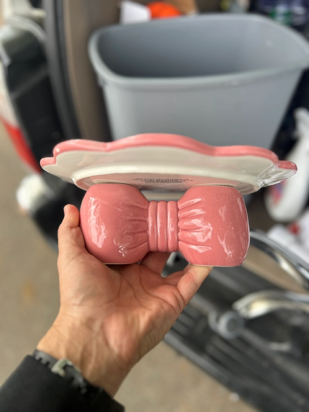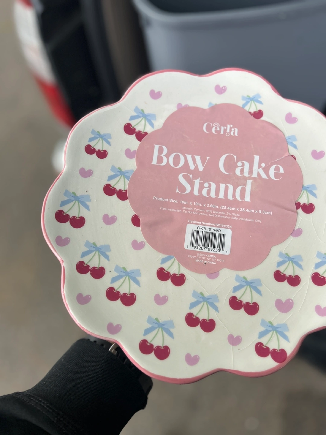 245Adorable cake stand. Pink ceramic with cherry and bow print. Features a unique bow-shaped base. Perfect for cupcakes or small cakes.